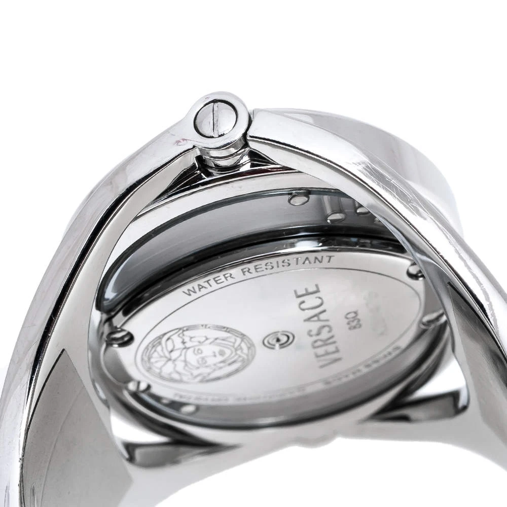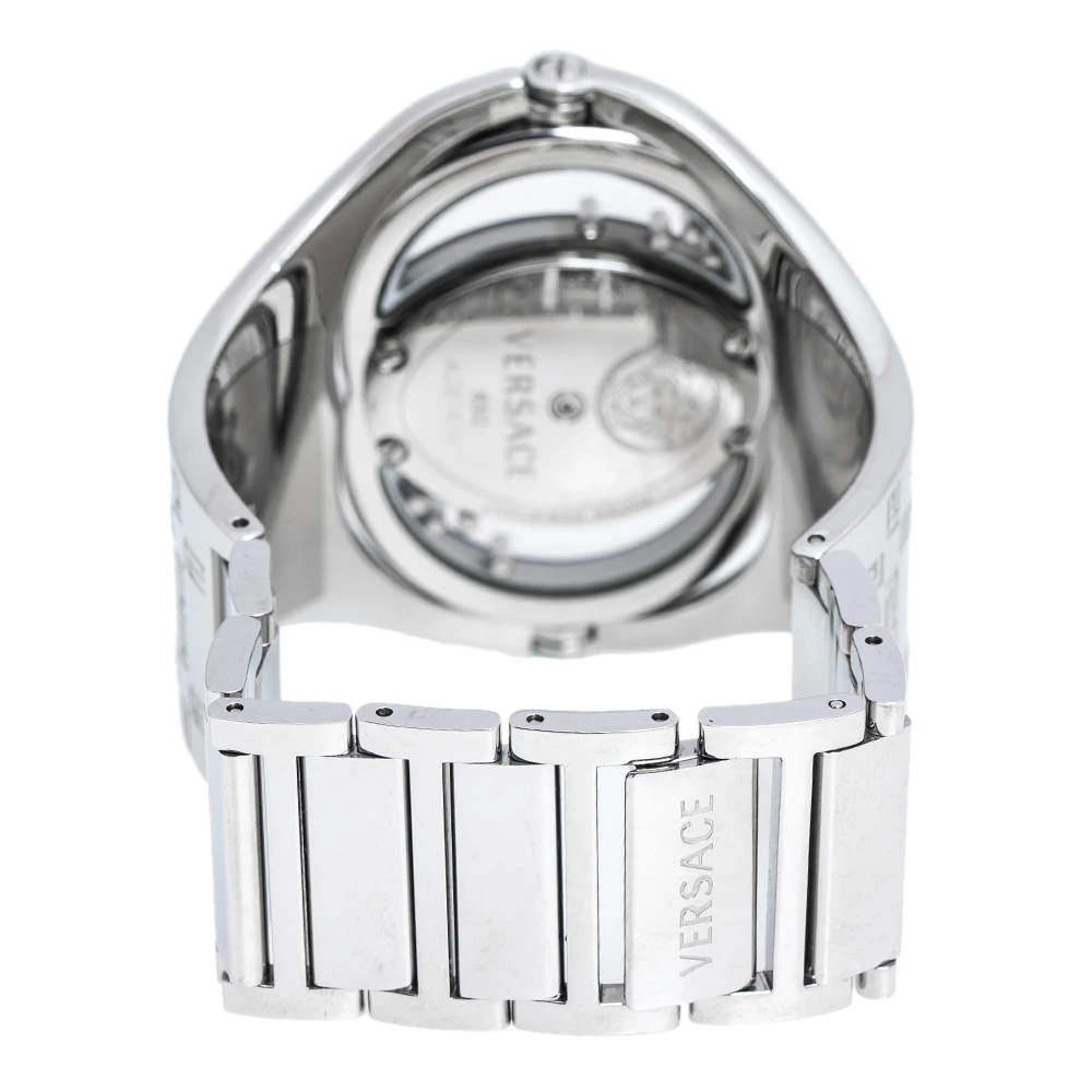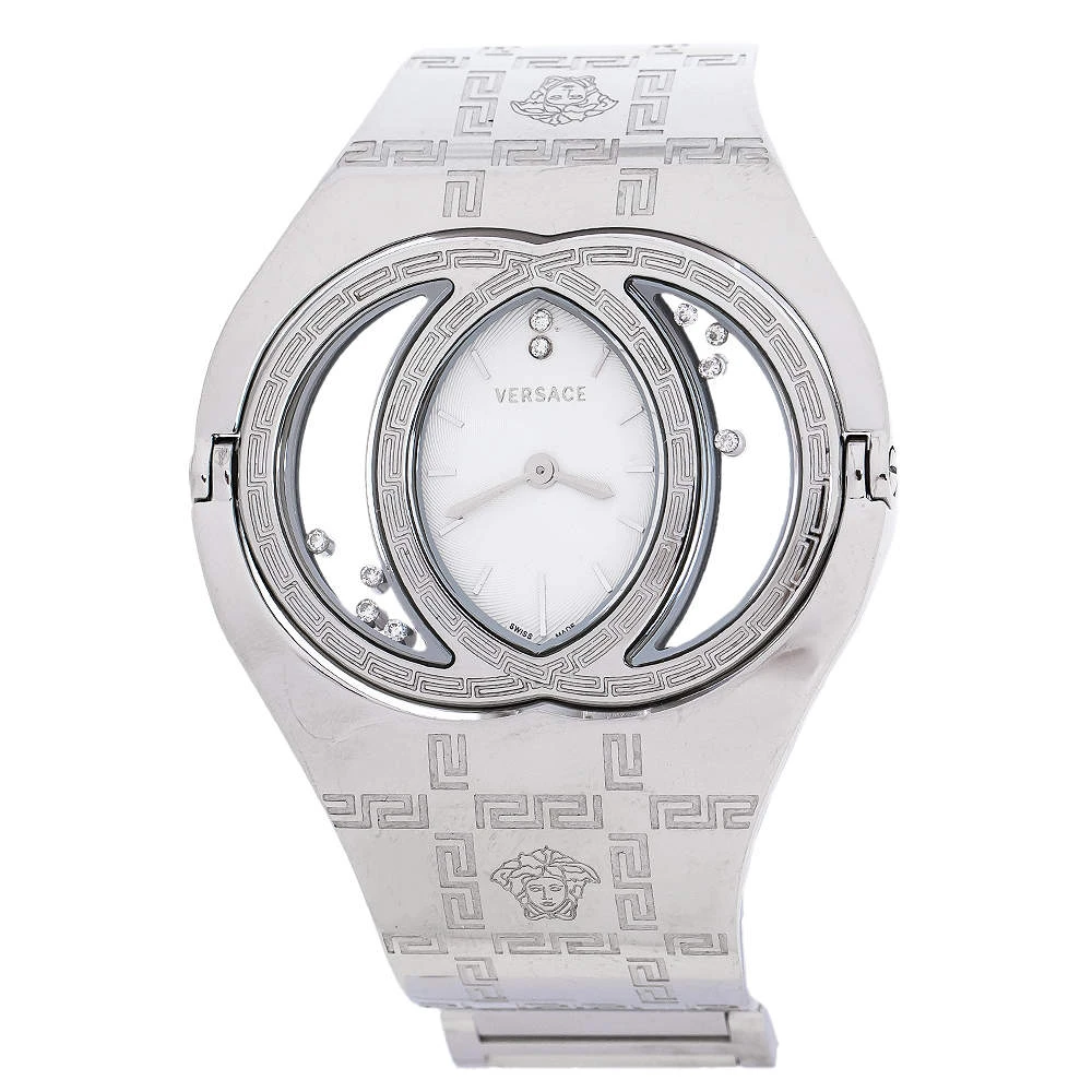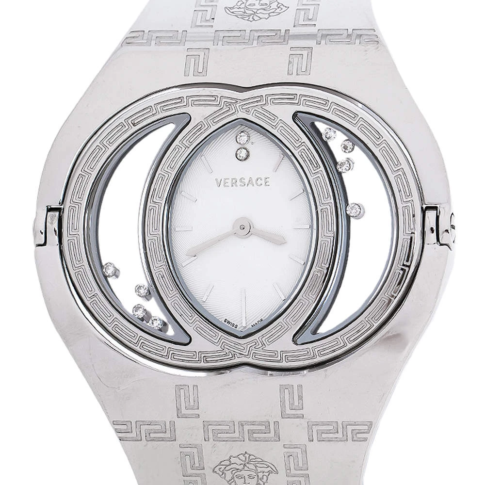 This Versace stainless steel wristwatch will surely be an upbeat addition to your style. The watch has a design of two overlapping circles and the silver dial resides within the vesica piscis (the area of intersection). On the dial, there are stick hour markers, two hands and two sparkly stones at the 12 o’clock position. The diamonds encased on the sides of the dial are so placed to sparkle with every twist of your wrist.