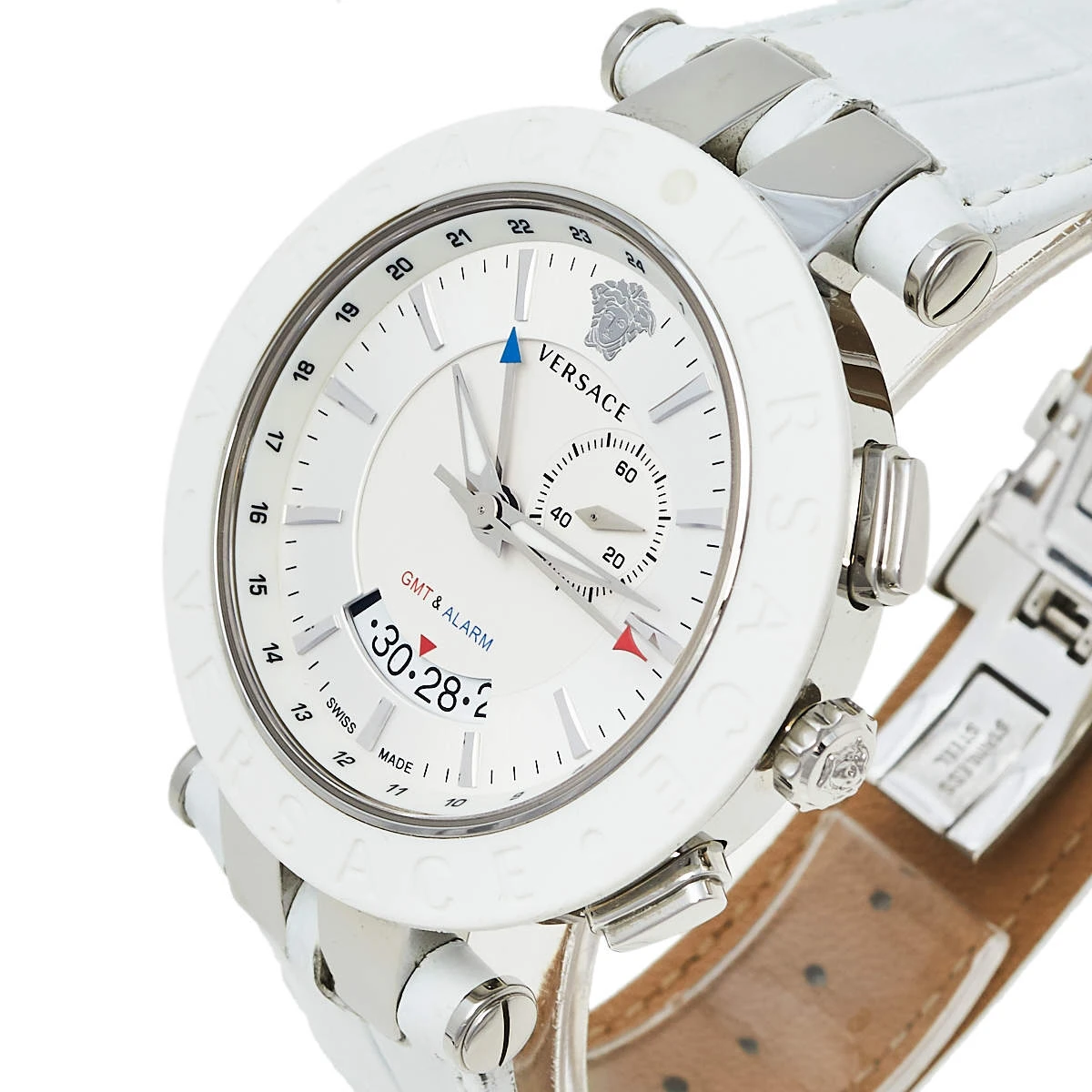Let this Versace watch keep you on time and add to your everyday style. The stainless steel watch comes with a silver dial set with distinct markers, a date window, GMT & alarm. The leather bracelet of this quartz watch offers a comfortable fit.