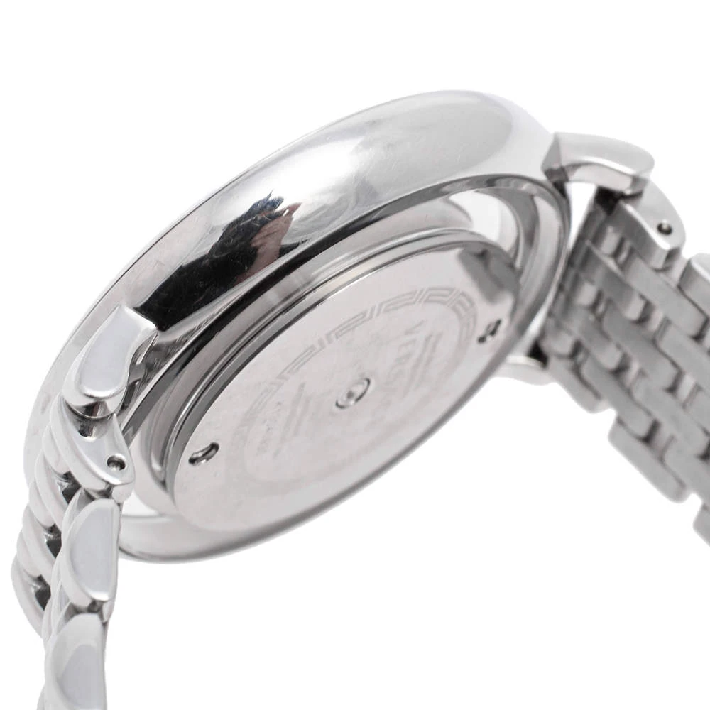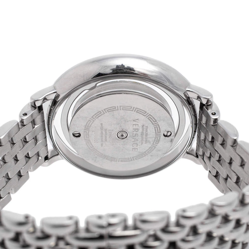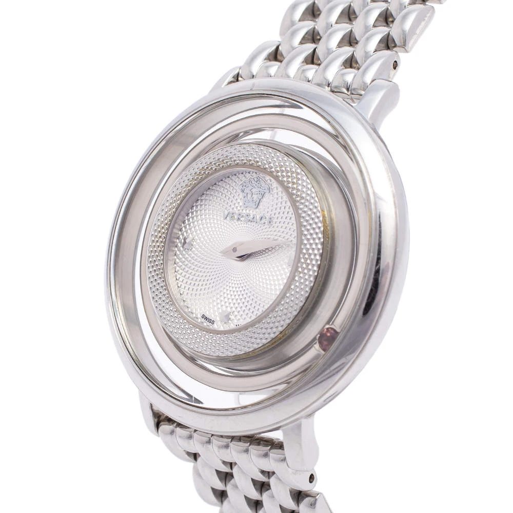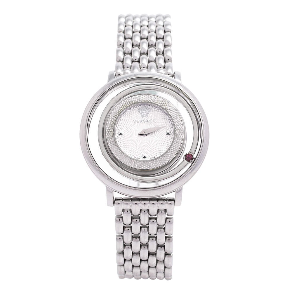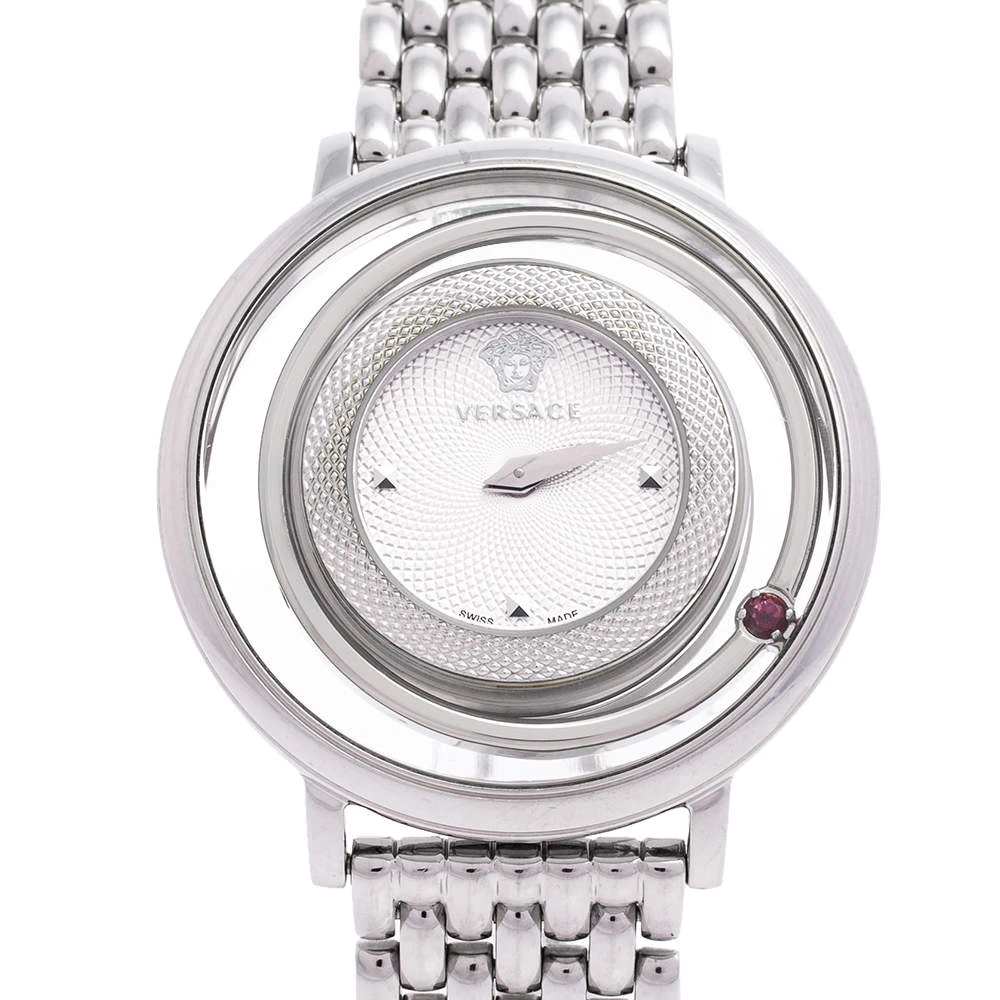 This beautiful timepiece from the house of Versace is sure to be a conversation starter with its eclectic and eye-catching design. Constructed in stainless steel, this Venus watch features a transparent panel around the case and one of the rims holds a single pink crystal. The dial is set with stud markers, the iconic Medusa logo, and two hands.
