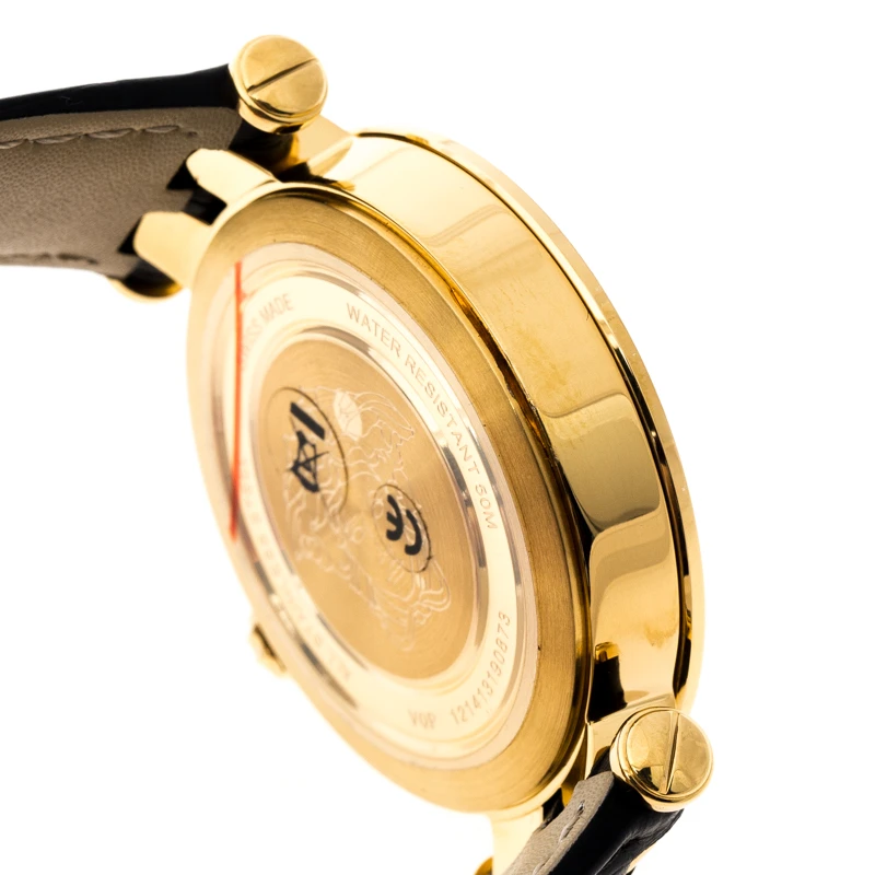 The interchangeable bezel accented with signature details is the highlight of this watch from Versace which is brimming with understated yet chic style. This simply elegant wristwatch has a round stainless steel case which is held by a black leather strap, secured by a buckle closure. The round dial is adorned with three hands and index hour markers with a small date window at three o’ clock position. Make this timepiece your everyday style companion.