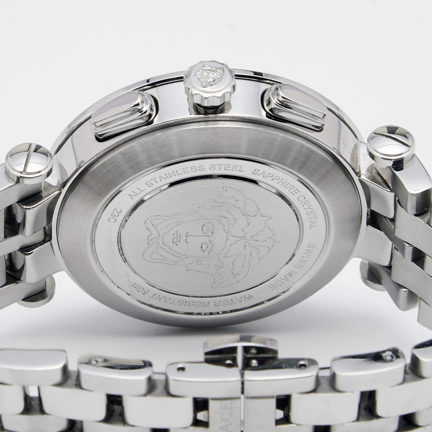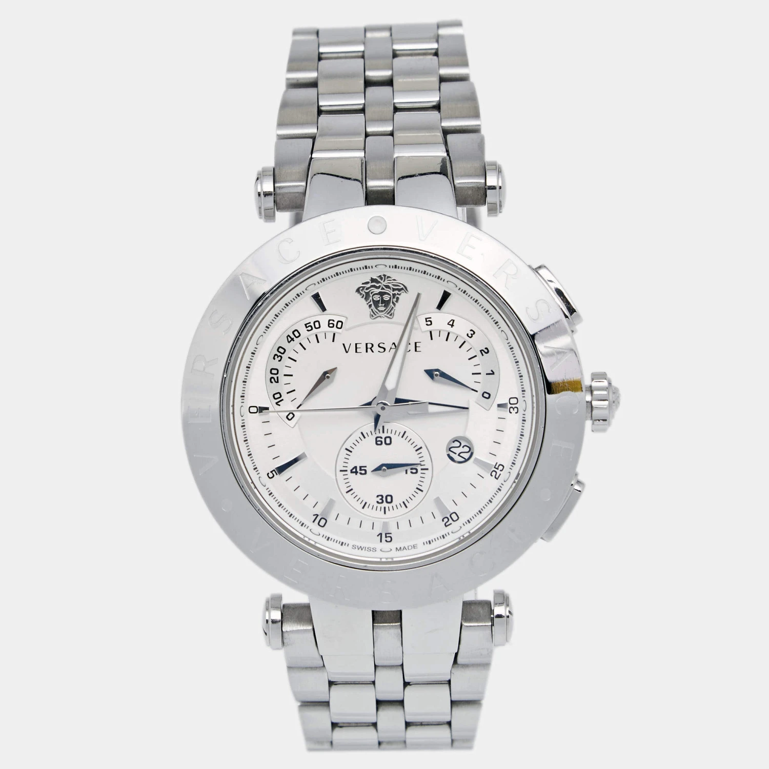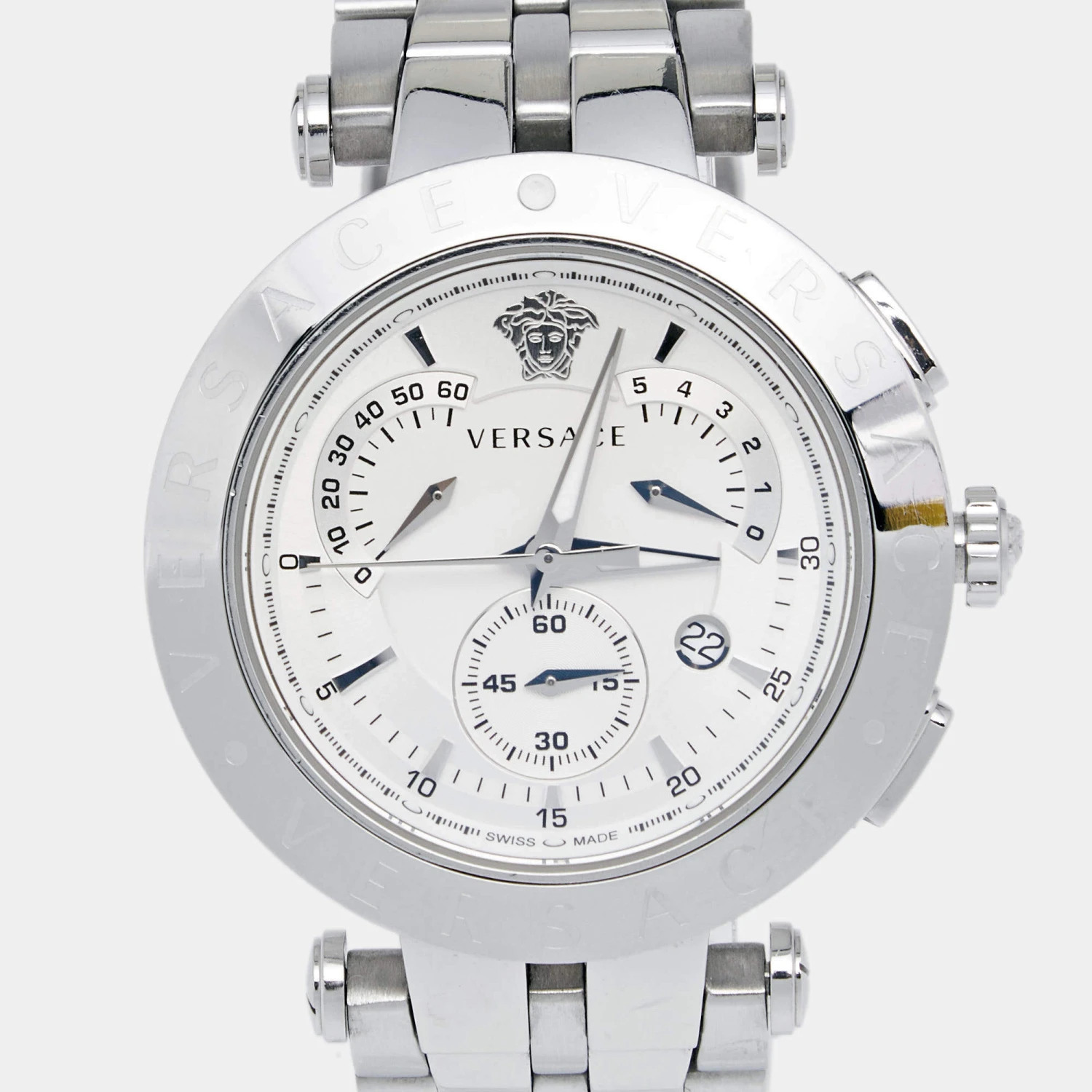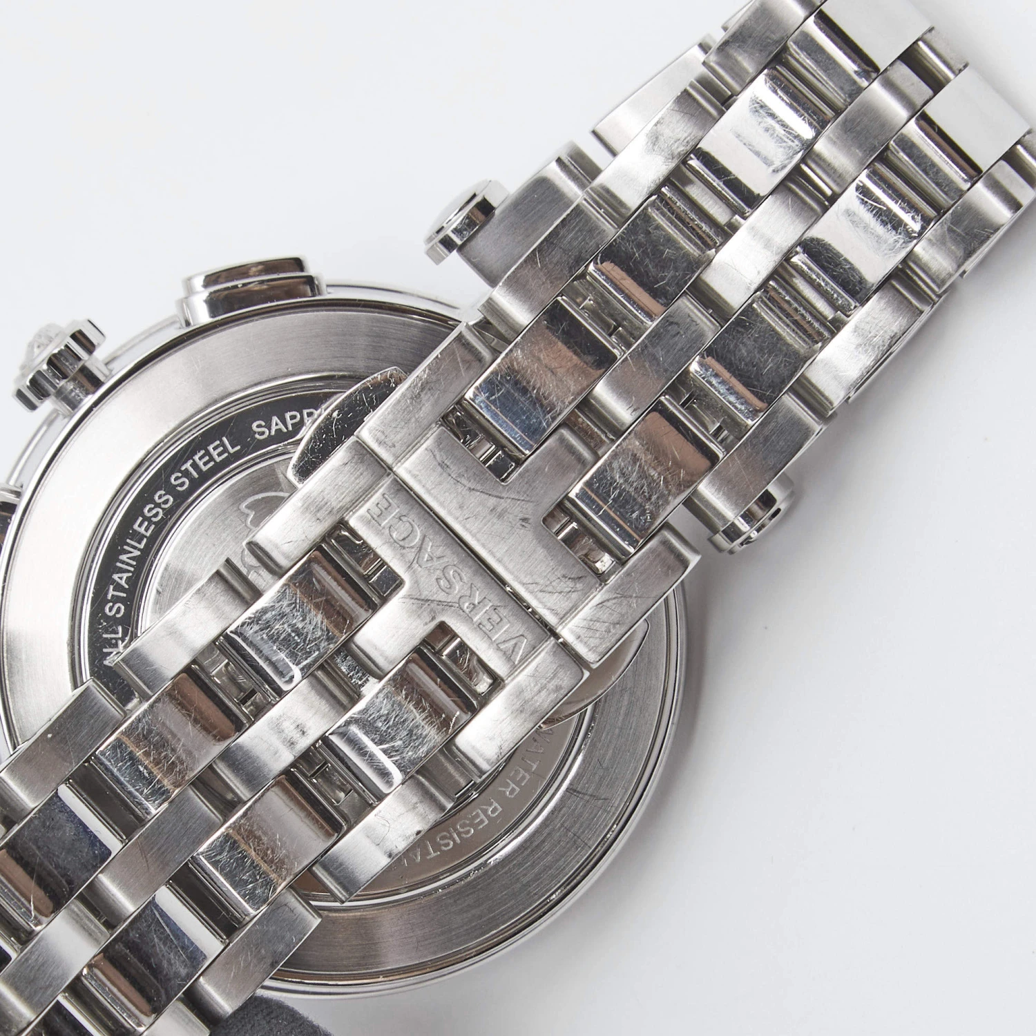 The elegant appeal is the highlight of this watch from Versace. This wristwatch has a round stainless steel case which is held by stainless steel chainlink bracelet, secured by a push-lock fastening. The round dial is adorned with subdials, and index hour markers with a small date window at the 4 o’clock position. Make this timepiece your everyday style companion.