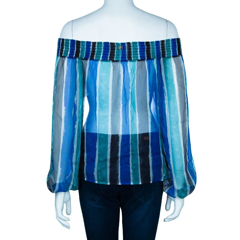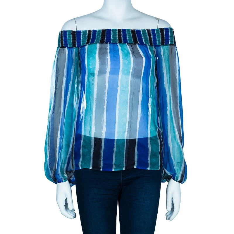 Flaunt an elegant style in this off shoulder top by Verasce. It features a striped pattern and has smocking pattern at the top. It has long sleeves and looks exquisite in multicolored design. A perfect pick for a summer day outing.