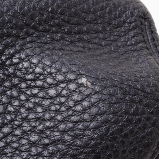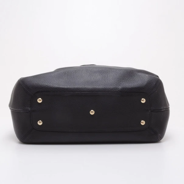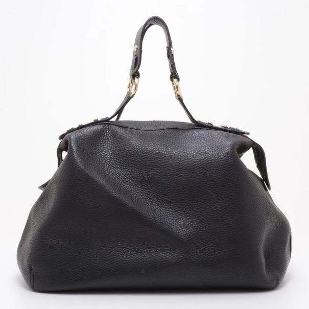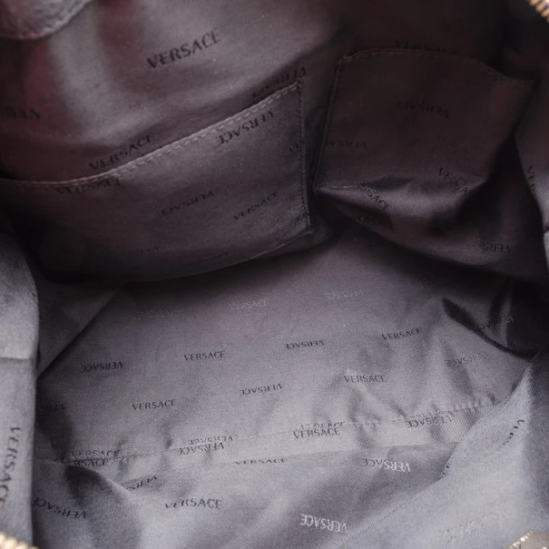 This fashionable tote by Versace is the all black handbag that every woman needs for daily wear. Crafted from black grained leather, it is detailed with a Versace logo, buckle handles, a double zipper closure and gold tone hardware. The hold all interior has a zip pocket and two patch pockets.