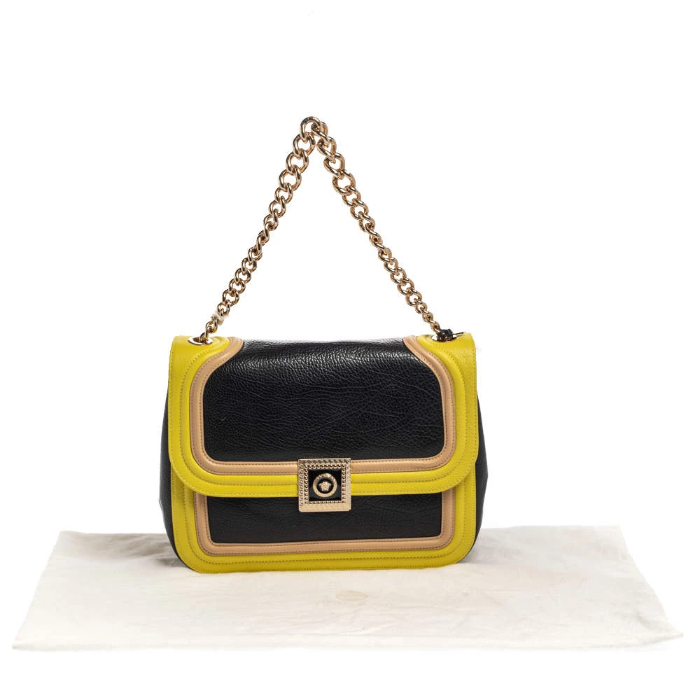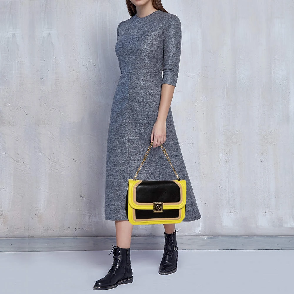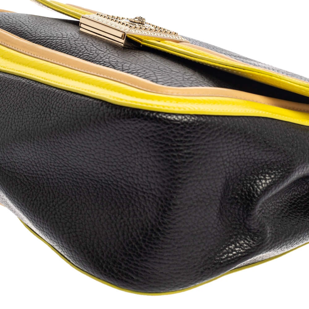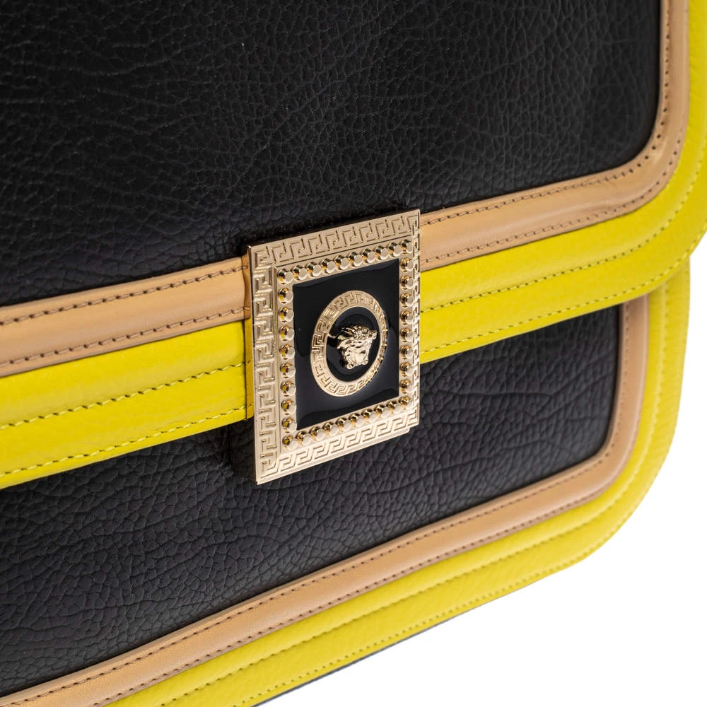Embrace the bold style that Versace offers with this chic bag. An example of luxe fashion, this beautifully crafted bag comes with a spacious satin interior. Made in a tricolor leather body, this bag can effortlessly be fashioned with both off-duty and formal looks.
