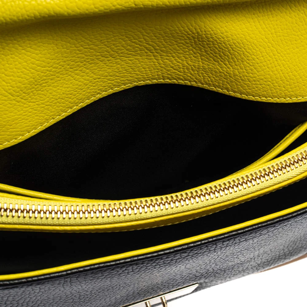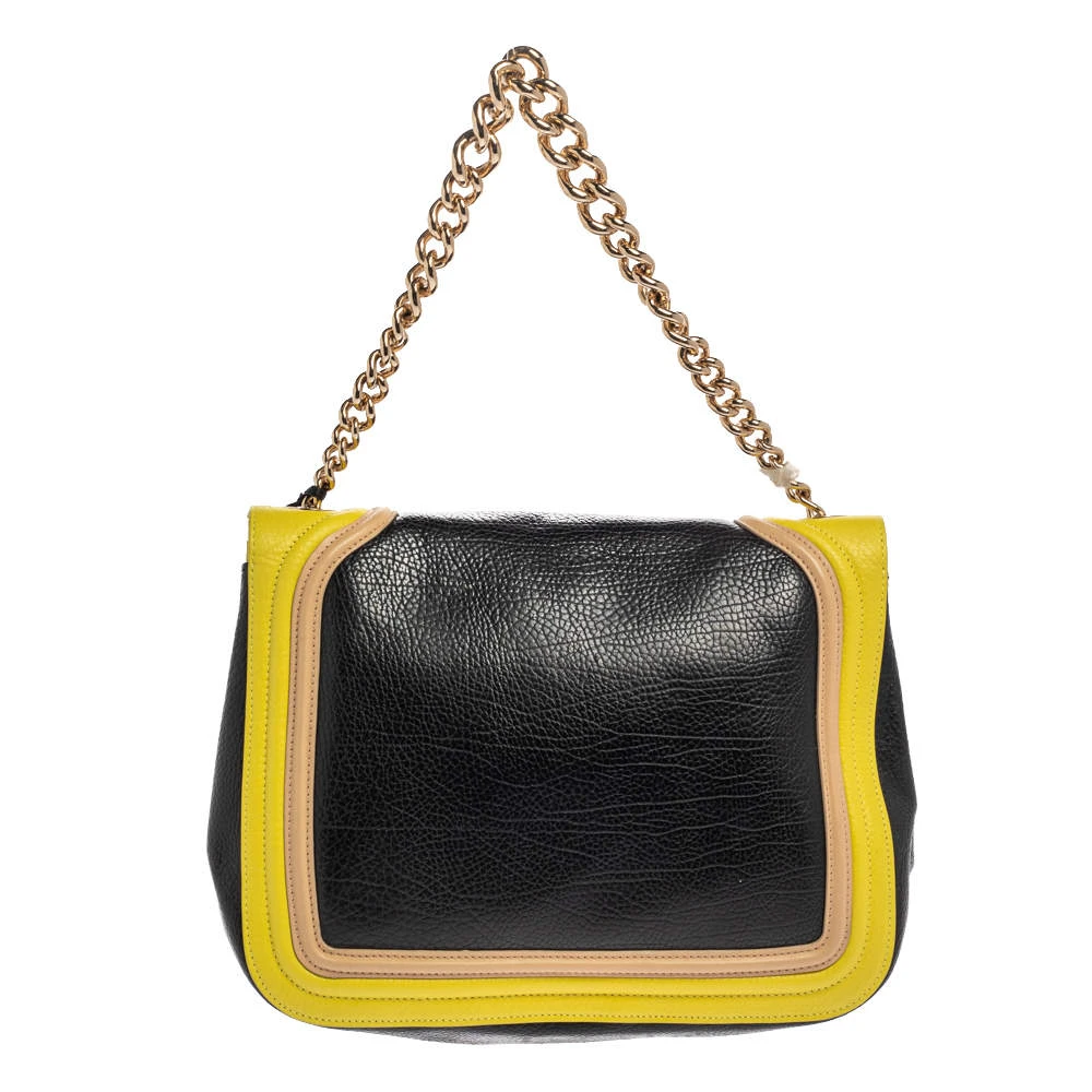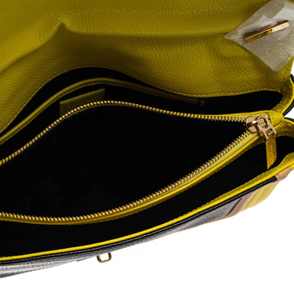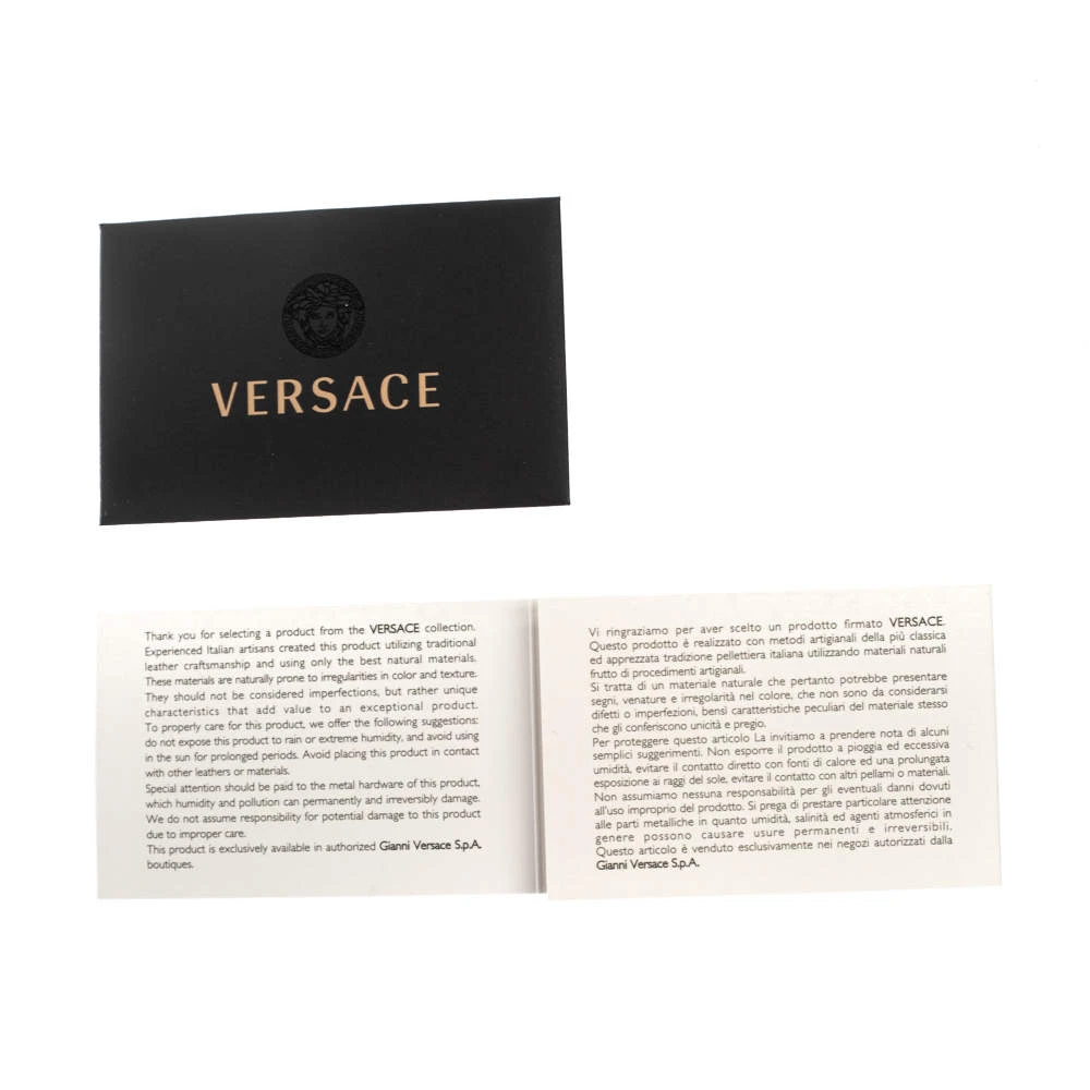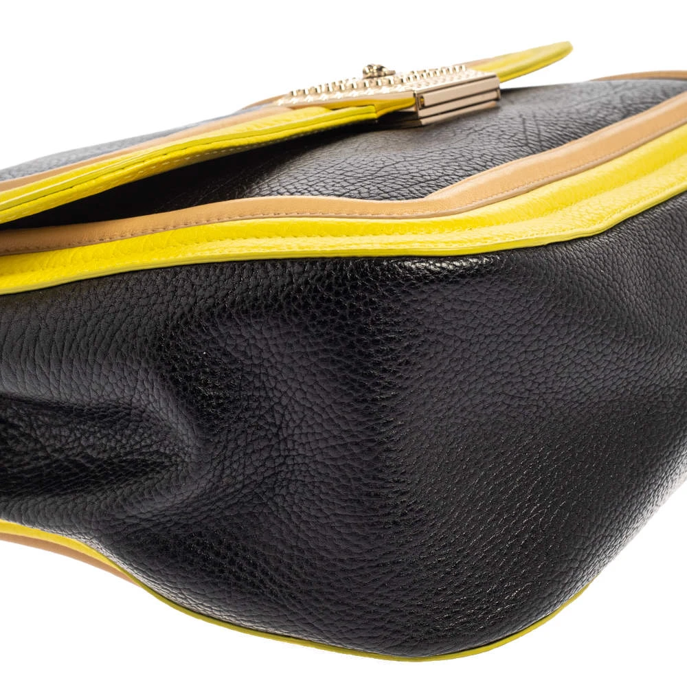 Embrace the bold style that Versace offers with this chic bag. An example of luxe fashion, this beautifully crafted bag comes with a spacious satin interior. Made in a tricolor leather body, this bag can effortlessly be fashioned with both off-duty and formal looks.