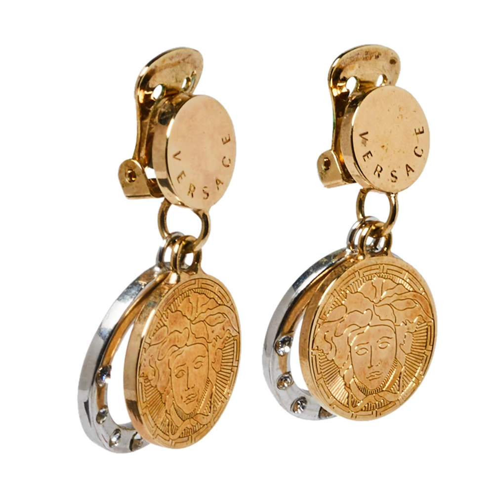 Perfect to create an instantly glamorous and sleek look, these Versace drop earrings are sure to stand out with your special looks. Constructed in gold-tone metal, these earrings have signature Medusa-shaped drops accompanied by a silver-tone ring. The pair definitely stands out.