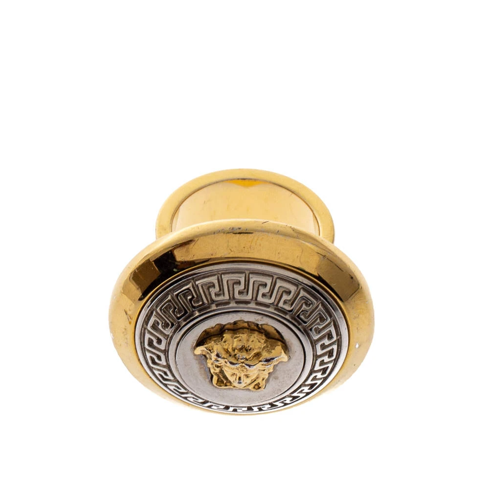 Exquisitely crafted from two-tone metal, this ring from Versace is a feast to the eyes. It exhibits the iconic and instantly recognizable Medusa logo in the center, outlined by Greek Keys, and a smooth layered end. Brimming with artistic excellence, this stunner of a ring deserves to be worn by you!