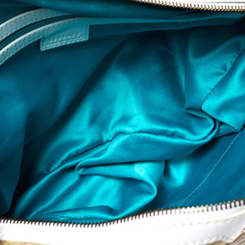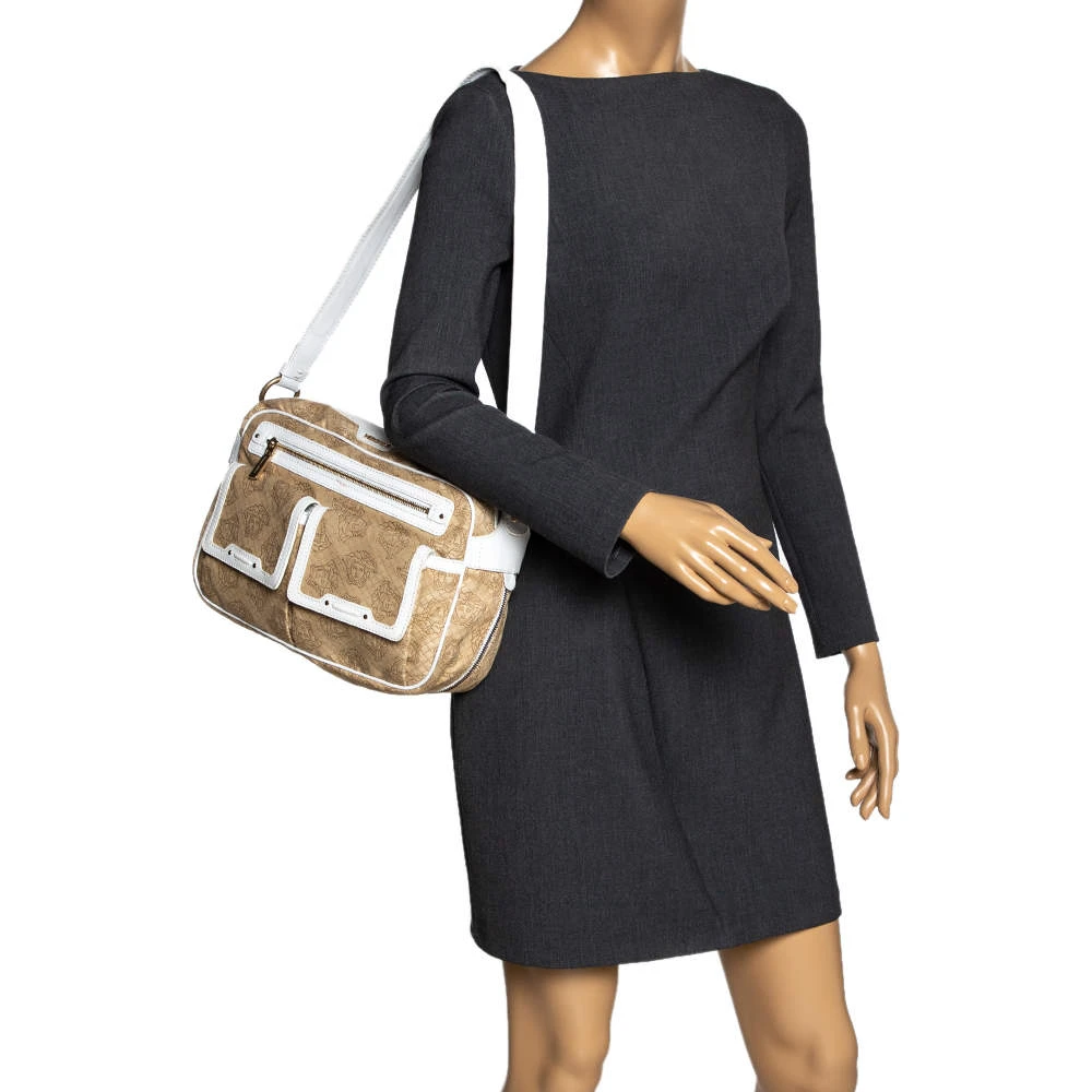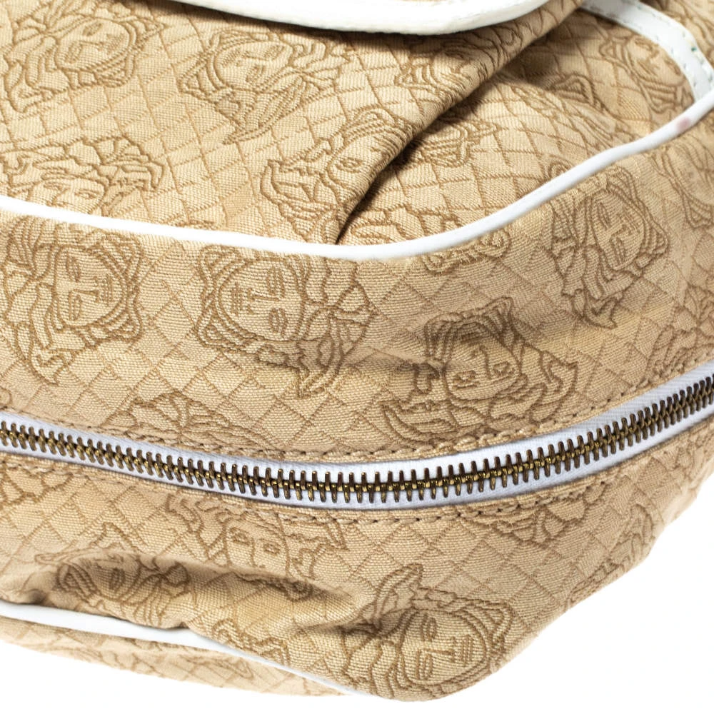 This stylish and functional shoulder bag by Versace is perfect for busy days. Crafted from Medusa print fabric and leather, it comes in lovely hues of white & beige. It is styled with a shoulder strap, two exterior pockets, zip closure and a spacious satin-lined interior. It is finished with gold-tone hardware.