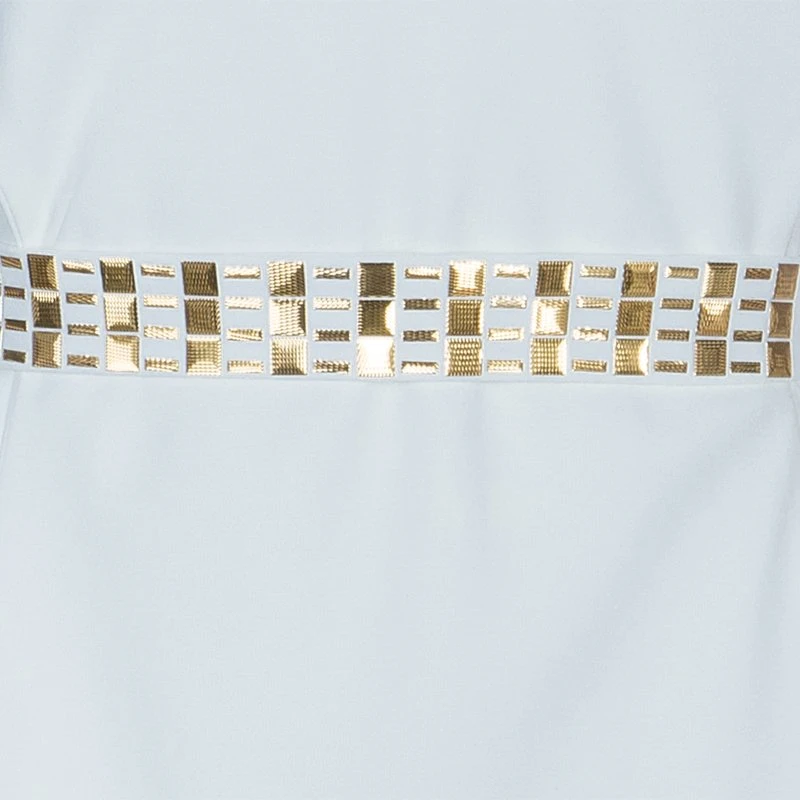 This Versace dress draws glamour with its sophisticated and elegant design. Cut from a viscose-polyester blend in white color, the sleeveless dress is accented with a gold-tone buckle detailing at the shoulder straps and at the waist belt. It features a V-neckline on the front and a square neckline on the back and a flared skirt-bottom.