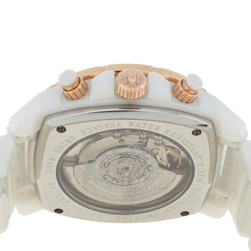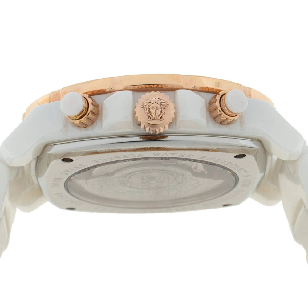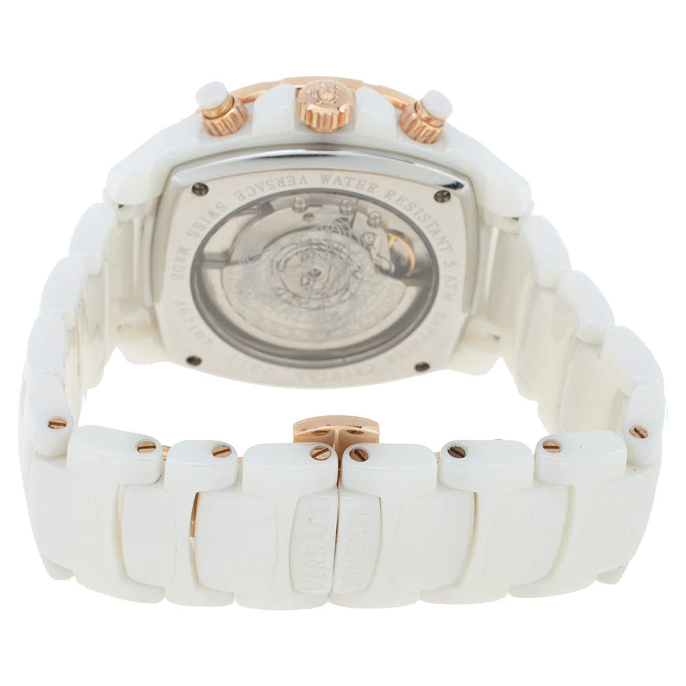 The Versace DV One 11CC timepiece is a delight for watch lovers. Functioning on automatic movement, the watch has a white ceramic and rose gold plated stainless steel case with a diameter of 40 mm. While the bezel is adorned with shimmering diamonds, the dial boasts of baton hour markers, three hands, three subdials for the chronograph function, the signature Medusa logo at the 12 o’clock position, and a date window between the 4 and 5 o’clock position. The case is neatly held by white ceramic and rose gold plated stainless steel bracelet that fastens with a push-button clasp.