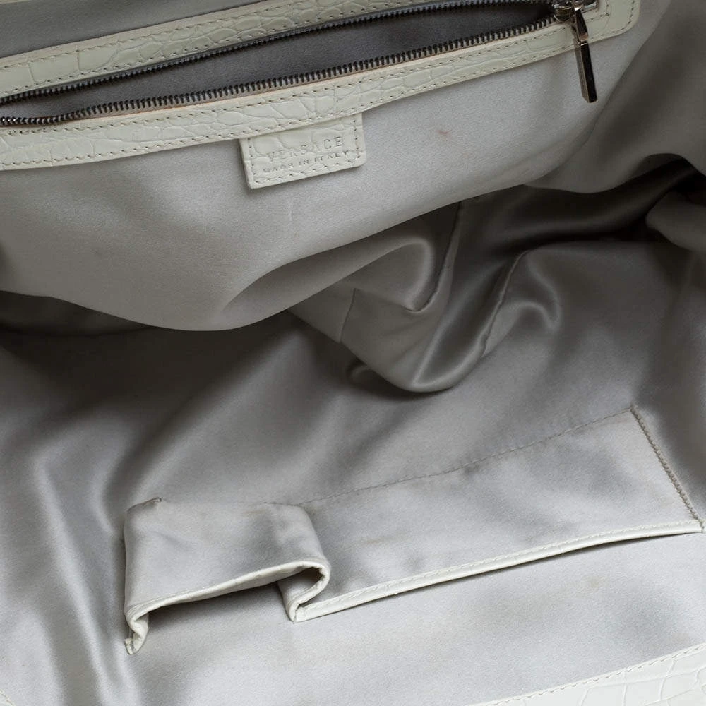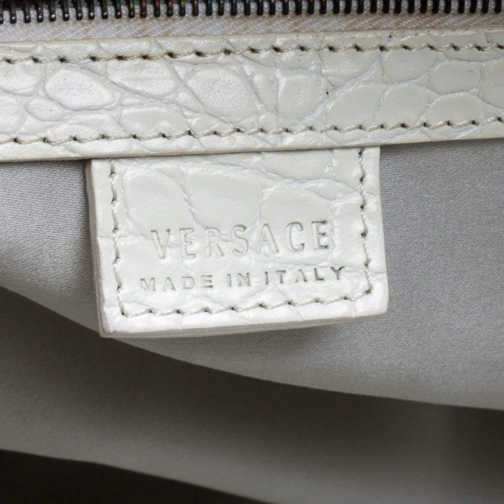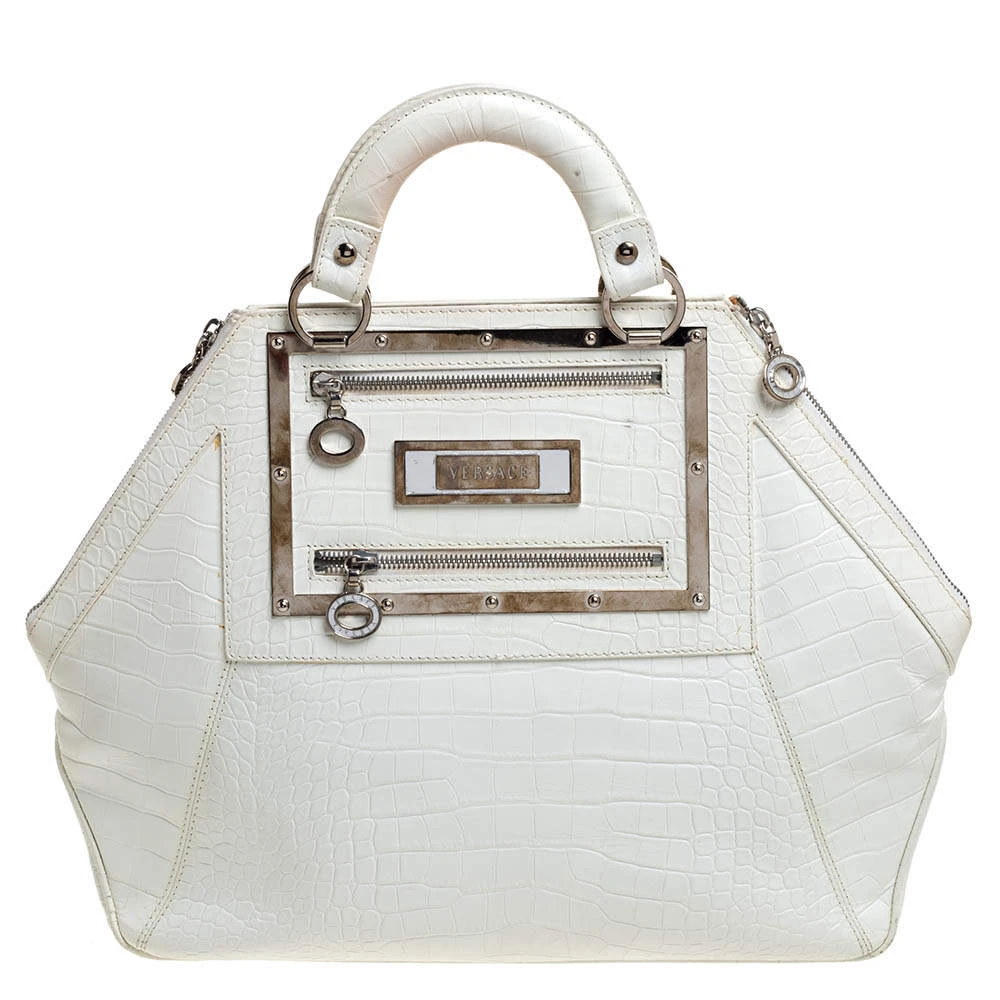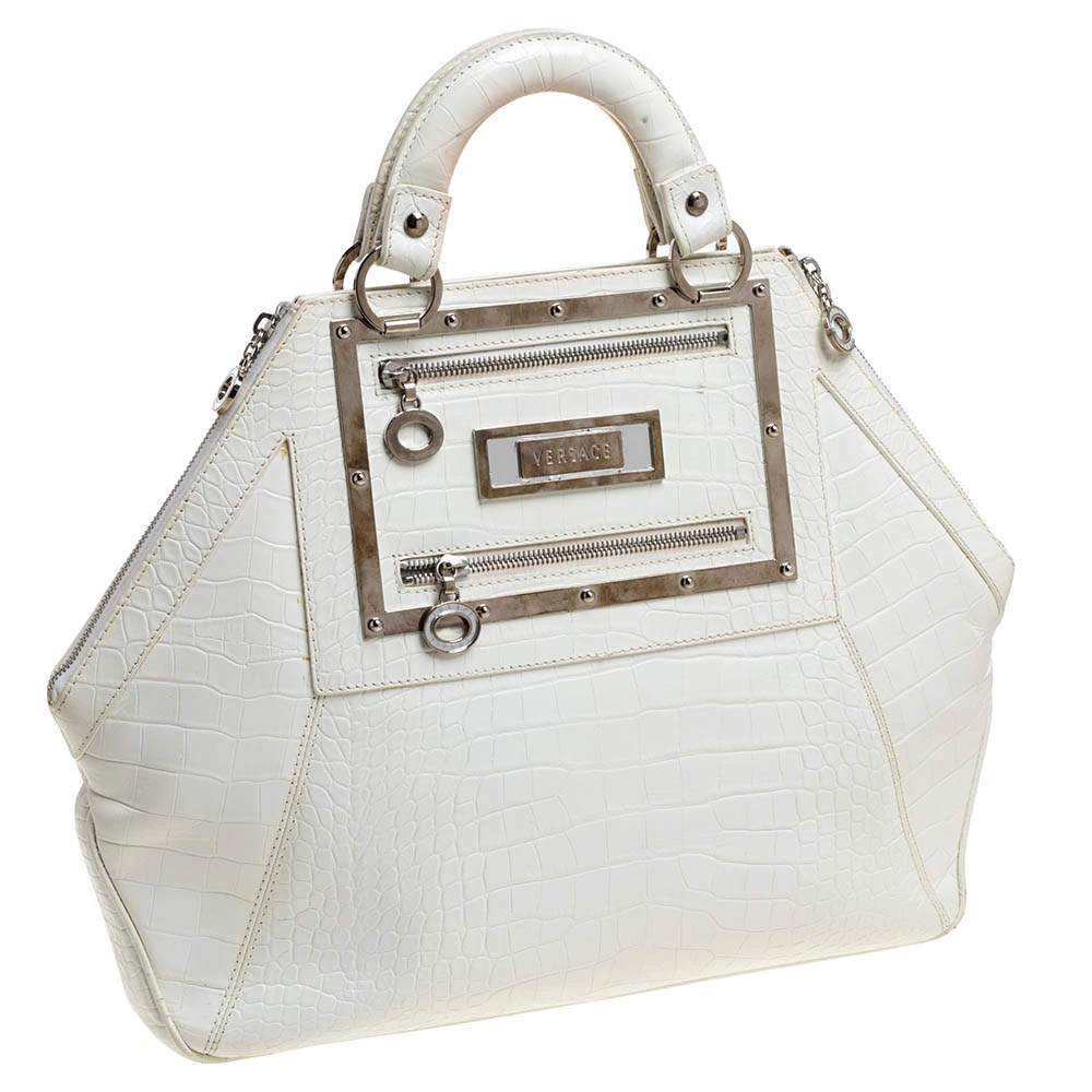 Coming from the house of Versace, this handbag is a dream come true for every fashionista. Give yourself a luxurious look with this croc-embossed leather satchel and flaunt your style. This bag comes with a satin-lined interior, dual handles, metal and chain accents on the front, and impeccable finishing.