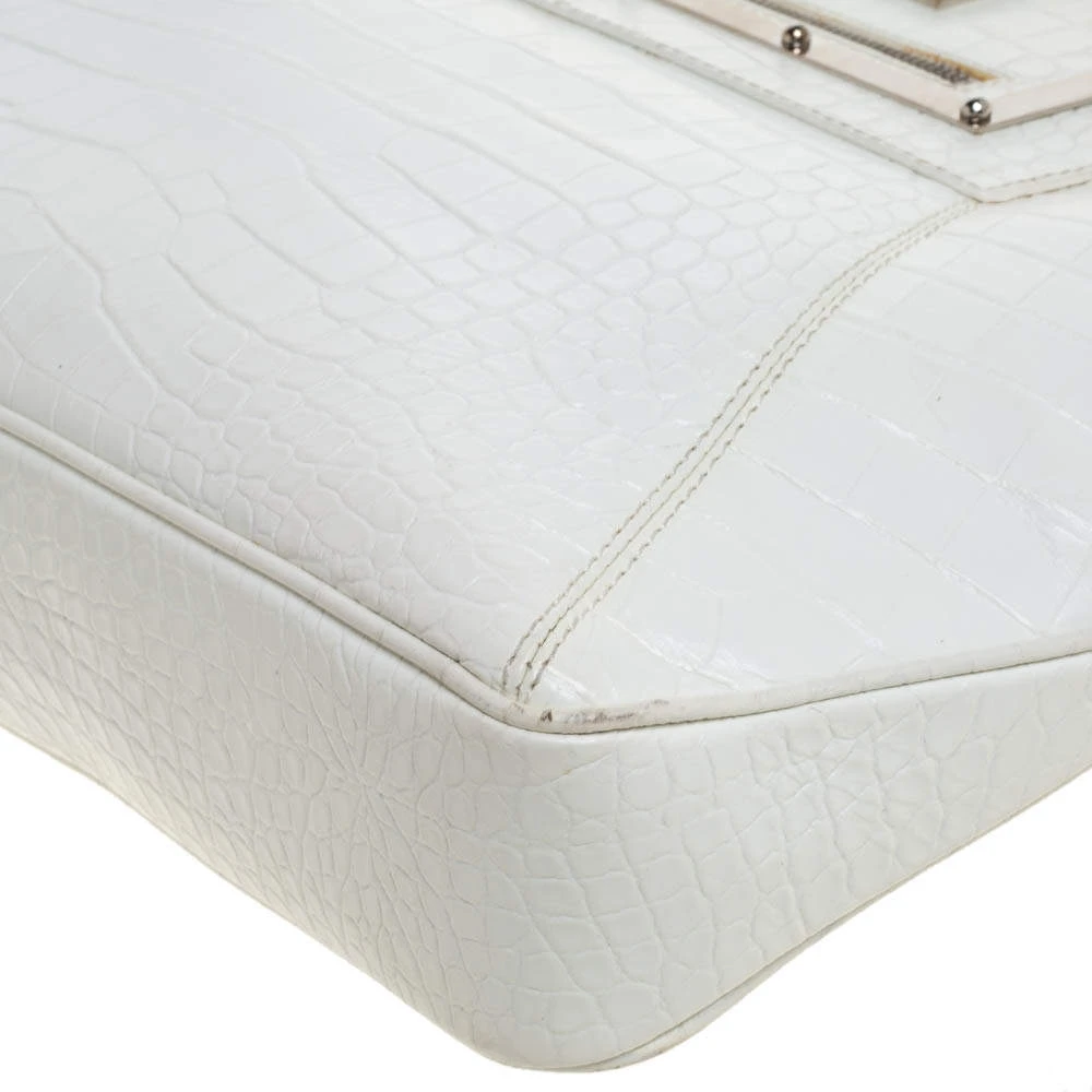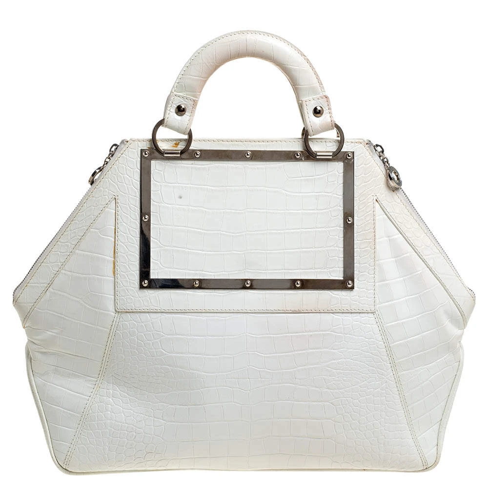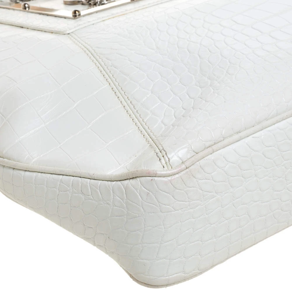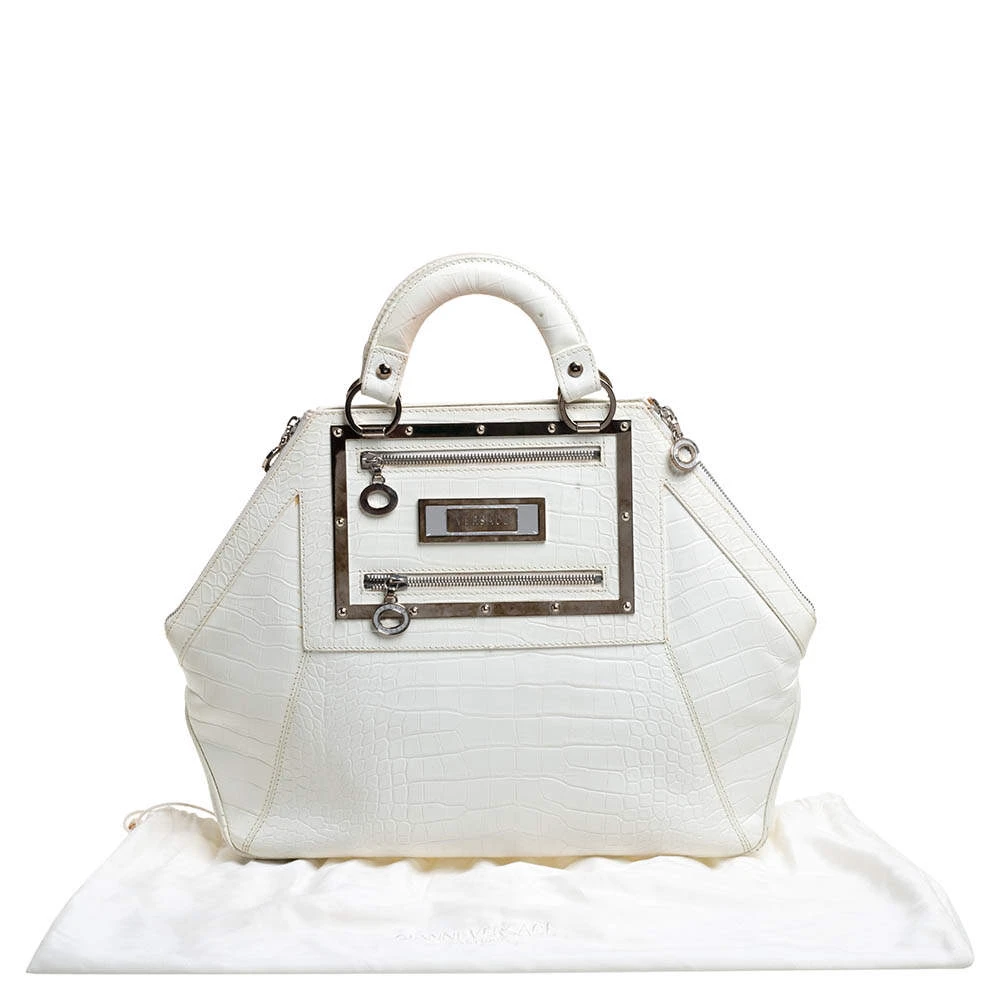 Coming from the house of Versace, this handbag is a dream come true for every fashionista. Give yourself a luxurious look with this croc-embossed leather satchel and flaunt your style. This bag comes with a satin-lined interior, dual handles, metal and chain accents on the front, and impeccable finishing.