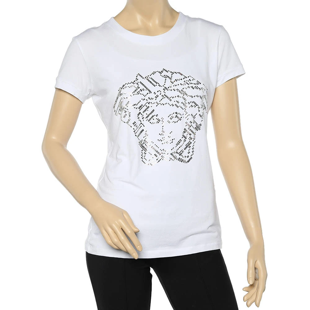 This stylishly simple T-shirt from Versace is all you need to complete your casual-chic attire. Made from knit fabric, it flaunts a lovely crystal-embellished Medussa head on the front and is short-sleeved. Pair the white tee with black jeans and a crossbody bag.