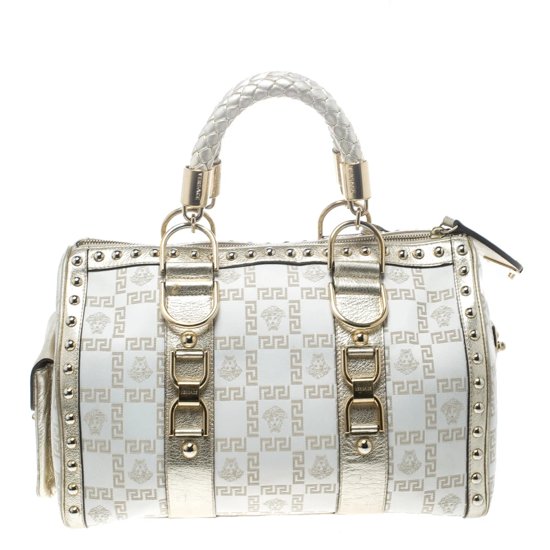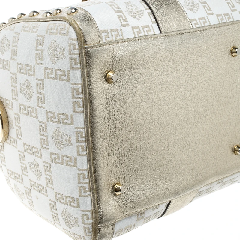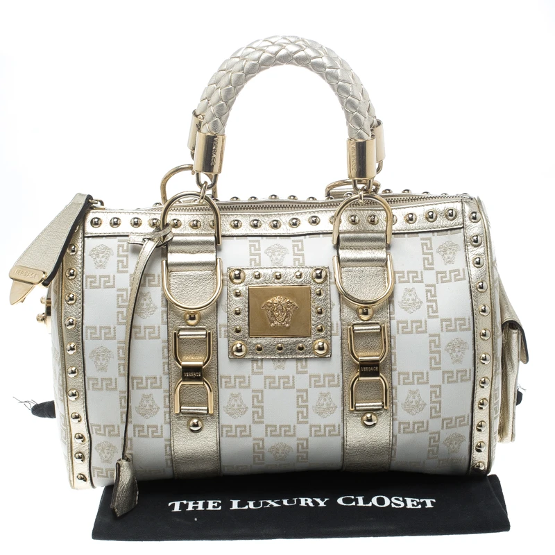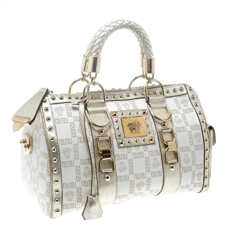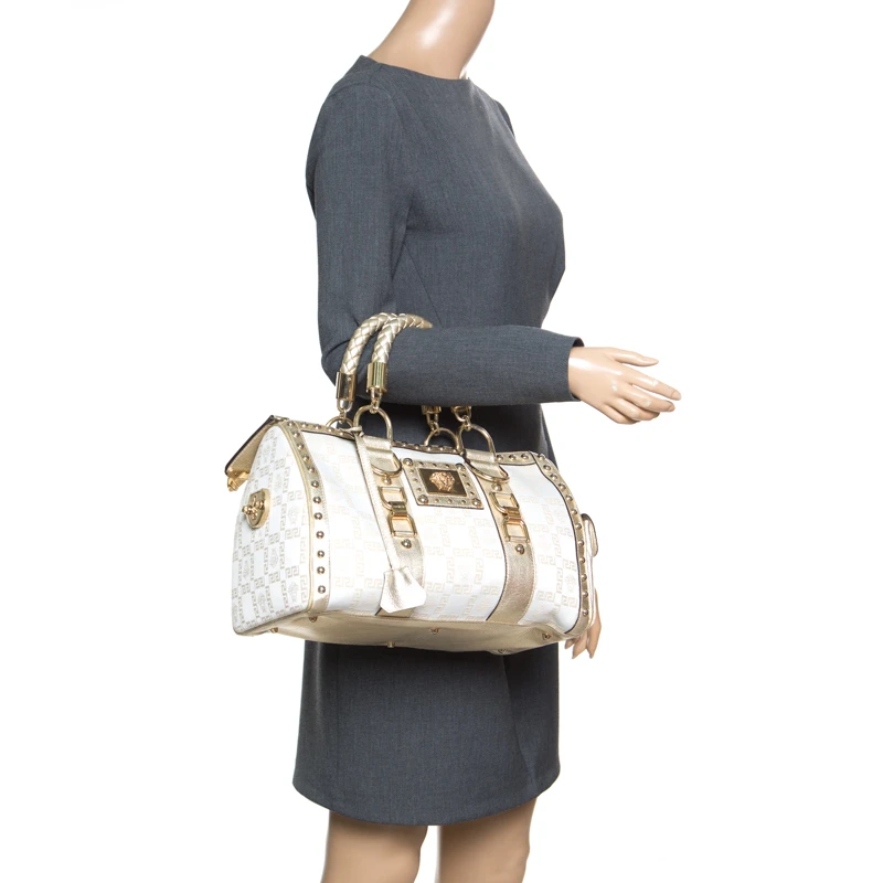 This Versace Snap Out Of It satchel is a bold statement-making bag from the fashion-forward Italian label. Crafted from white fabric and gold patent leather, it is accented with rolled double handles, a side pocket, and gold-tone hardware. The interior is lined with satin and features a zip pocket. It will bring just the right amount of glamour to understated evening ensembles | This fashionable bag will make an elegant addition to your collection and is perfect for all kinds of outfits and occasions!.