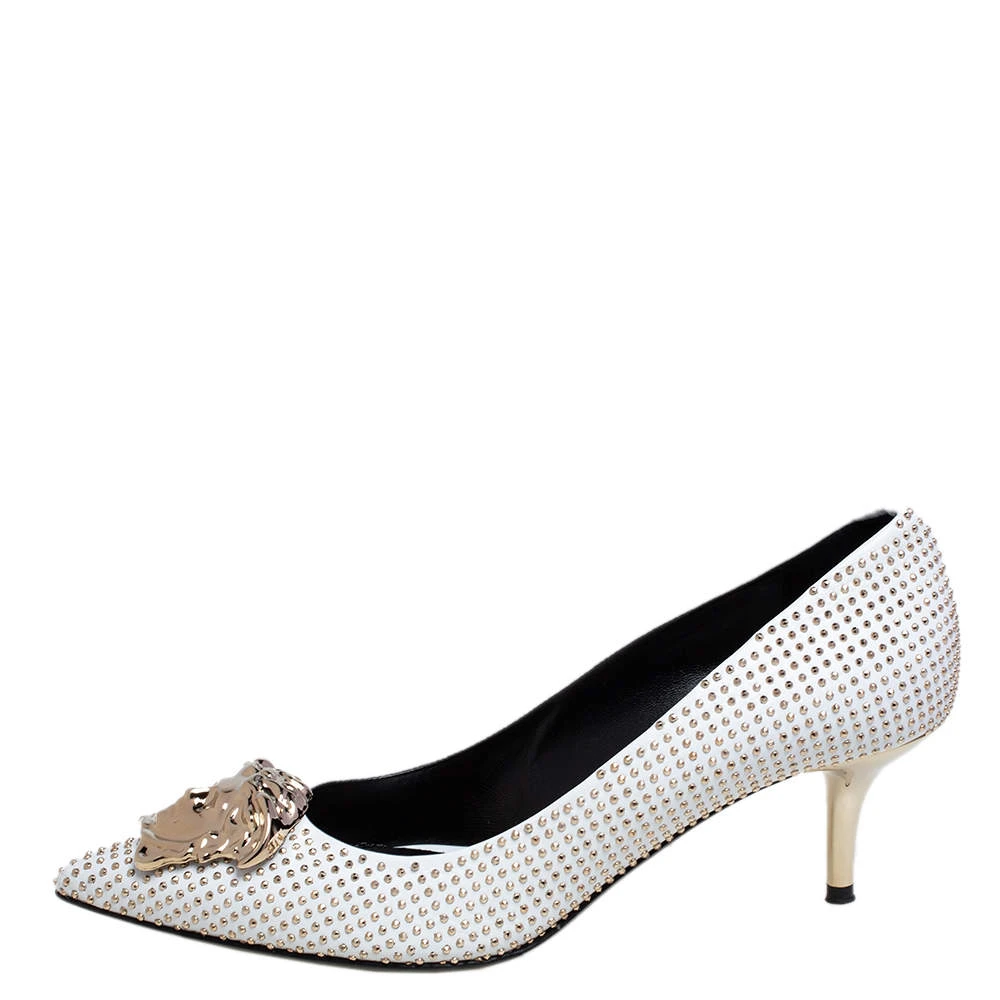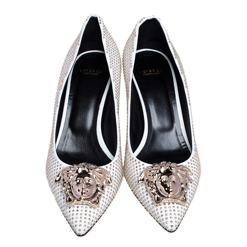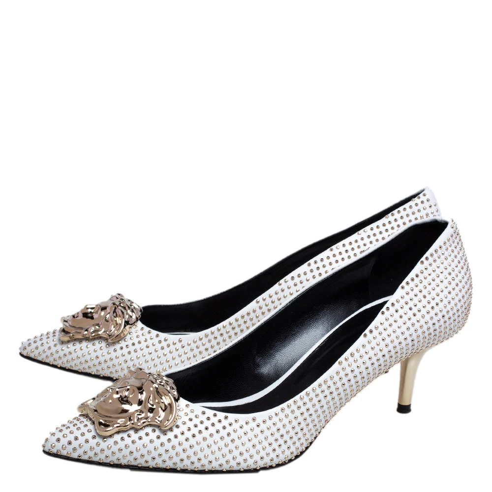 Treat your feet to the best footwear by choosing these fine pumps from Versace! The white pumps have been crafted in Italy using leather and are covered in gold-tone metal studs. They are designed with the Medusa motif on the pointed toes and 7 cm heels.