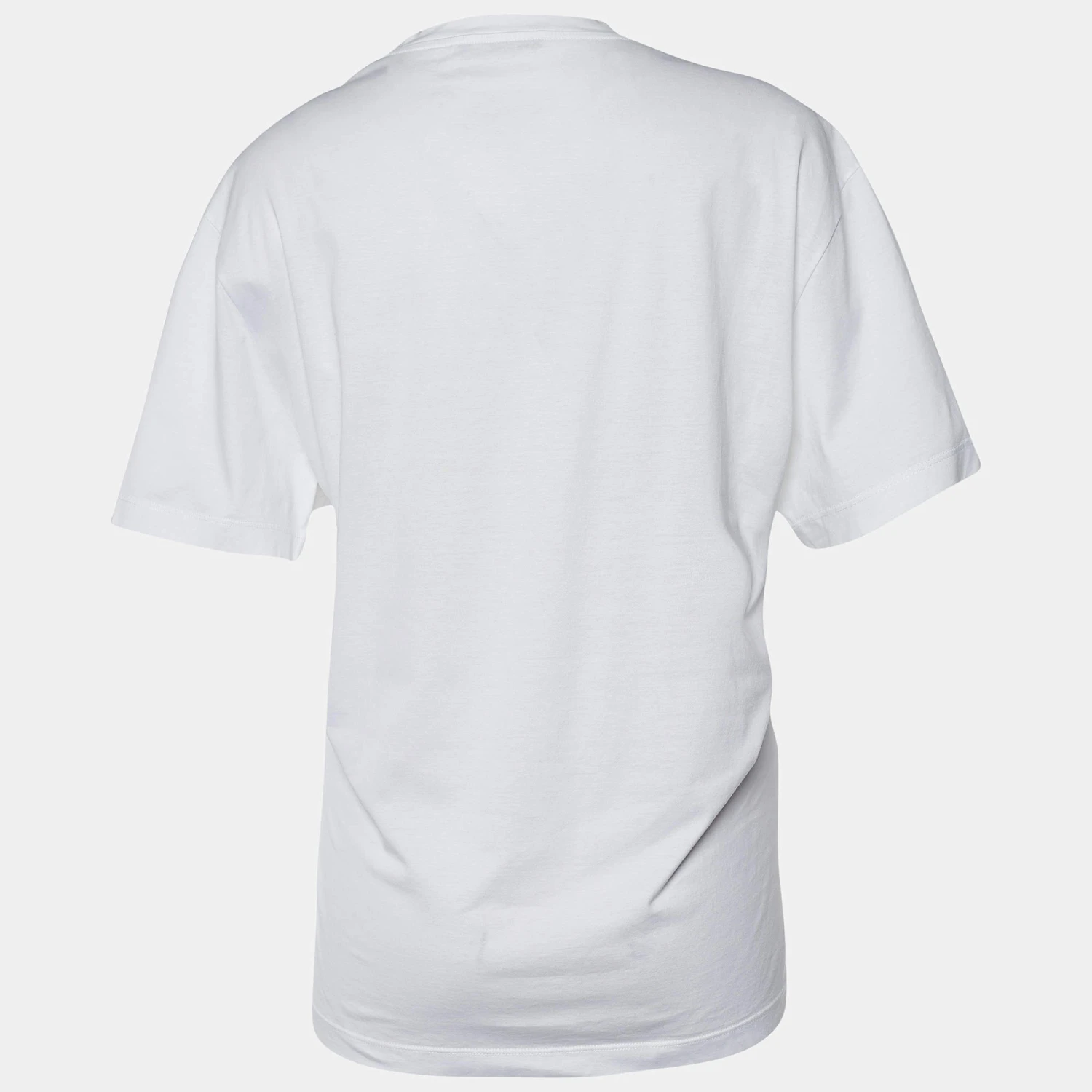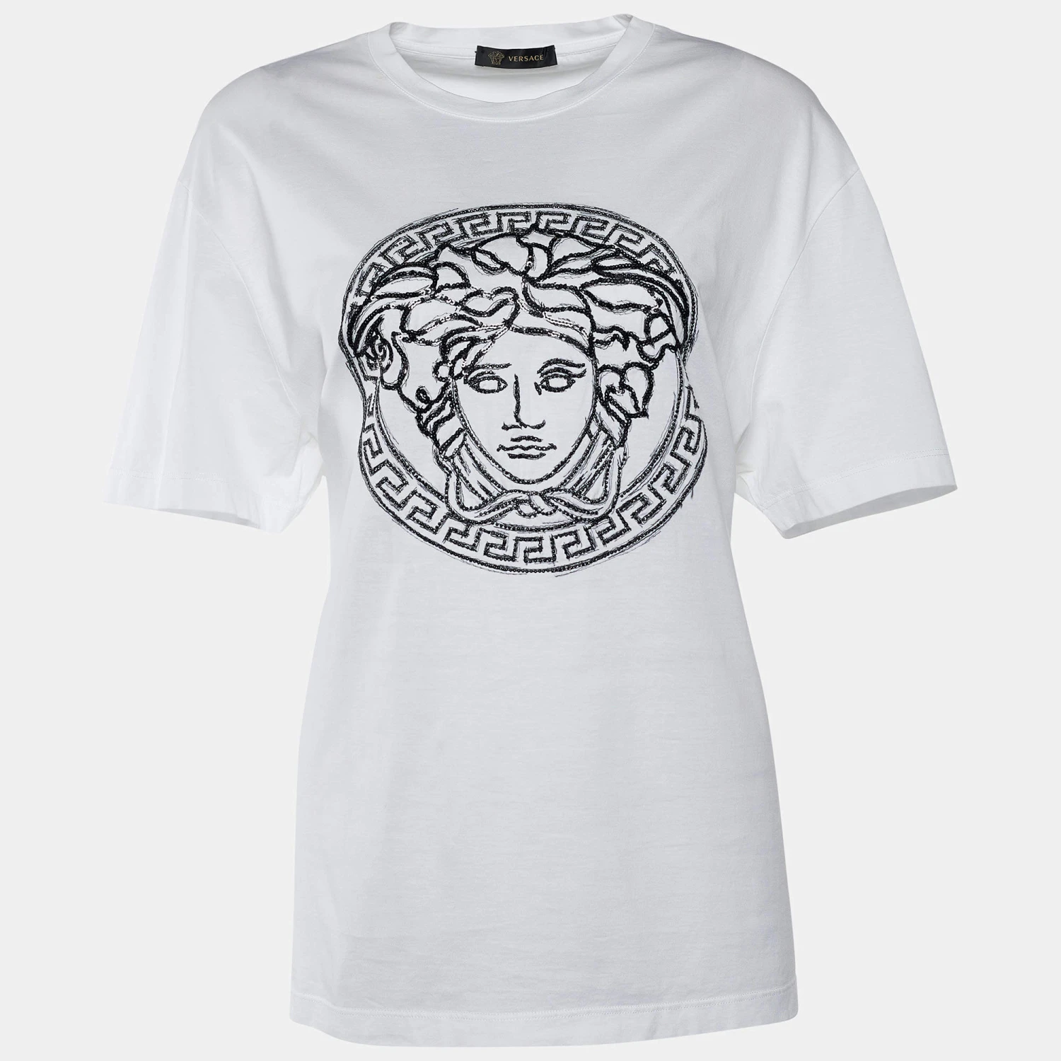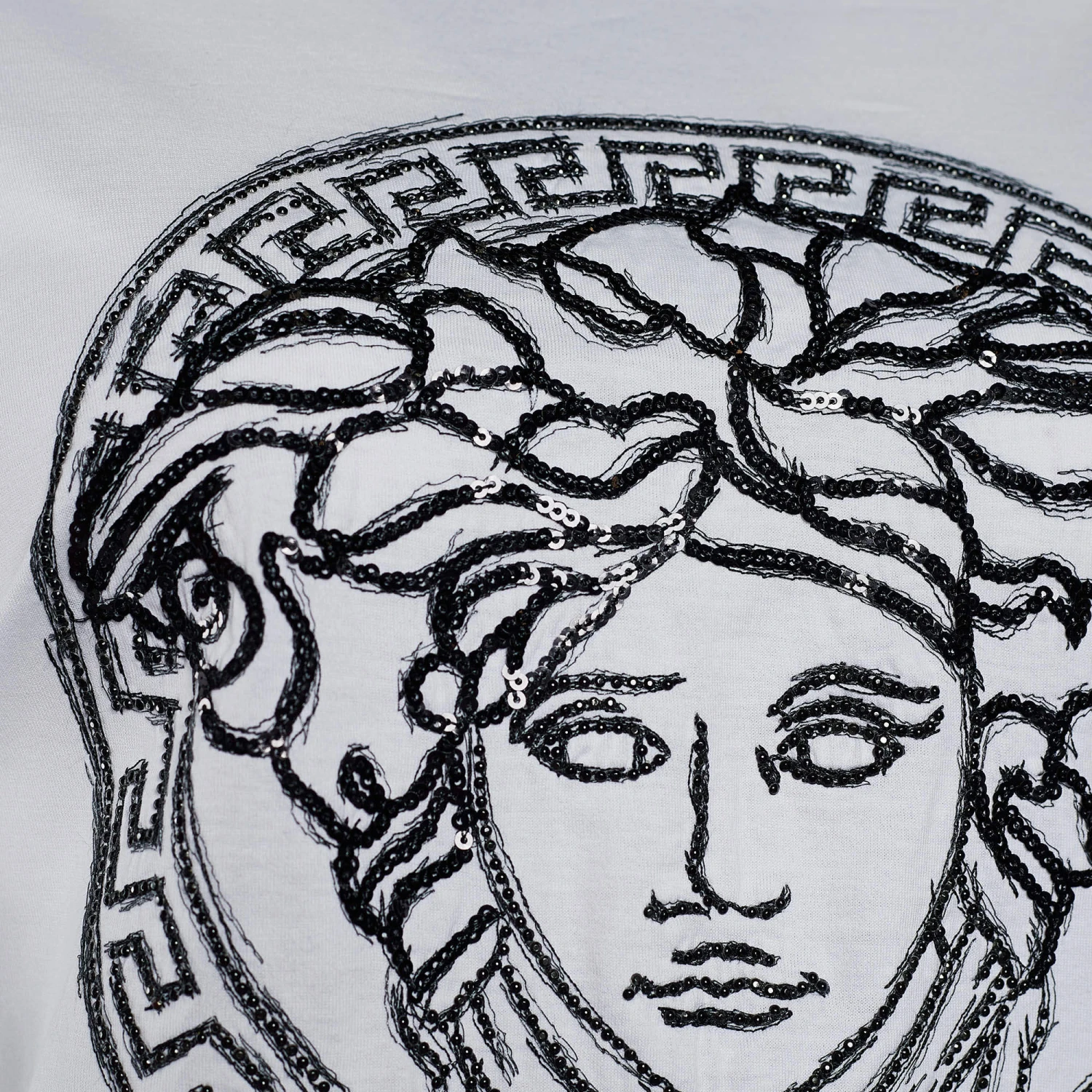 This T-shirt from the House of Versace is all about sporting a classy and comfy style. It is tailored from white jersey fabric, with a sequined Medusa logo adorning the front. It features short sleeves and a rounded neckline. This T-shirt is great for casual use.