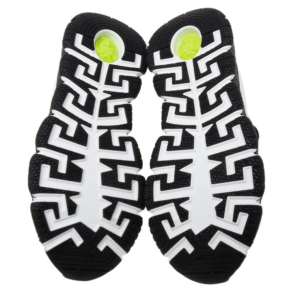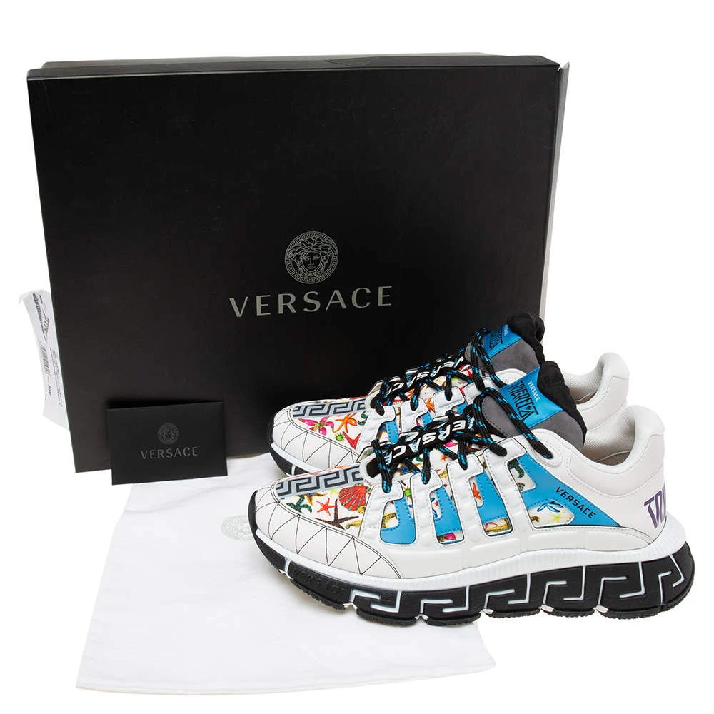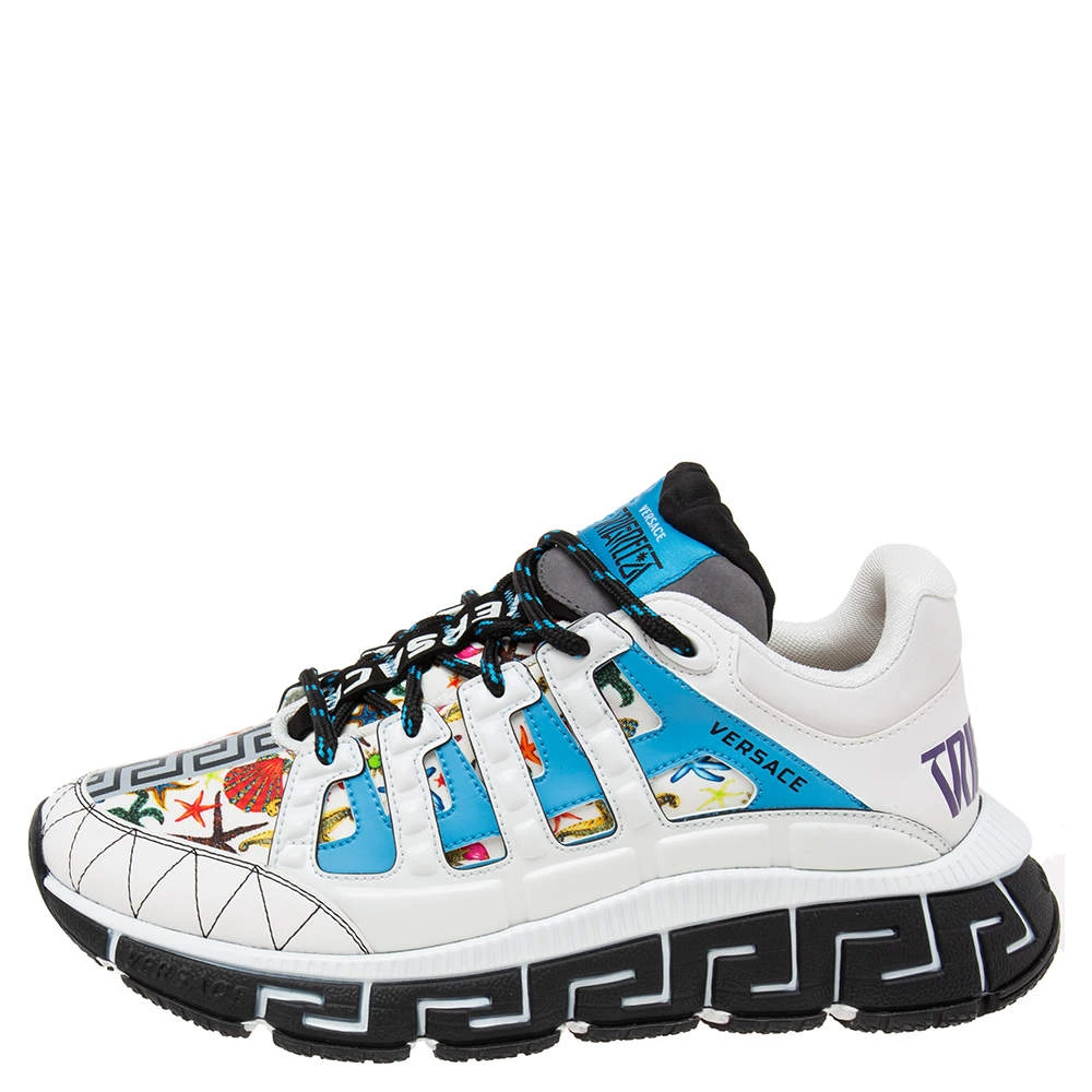 Lead colorful steps all the way with these Versace sneakers. Covered with flawless graphic patterns, they come made in leather and the Greek key pattern on the round toe, brand detailing on lace-up closure, and logo patch on tongue highlight the shoes. They rest on durable rubber soles, lined with fabric, and feature a cork insole.