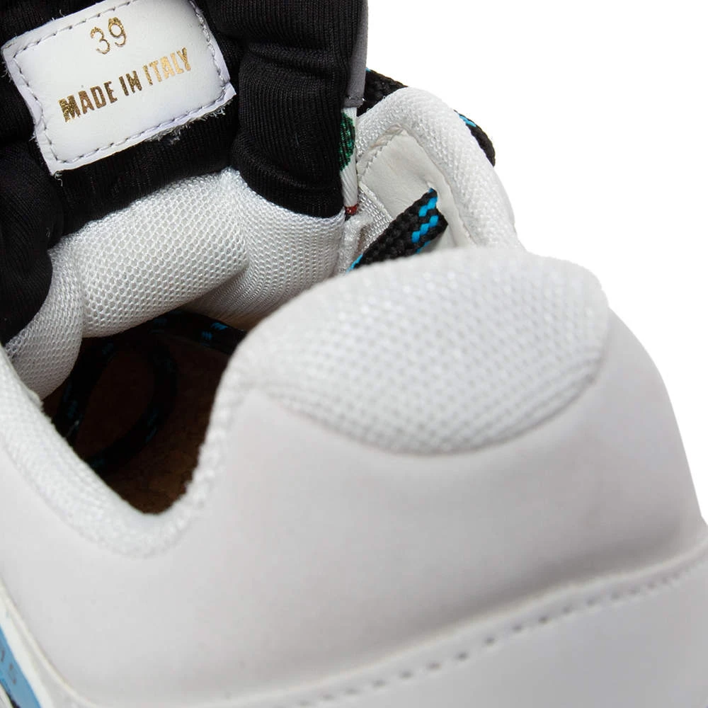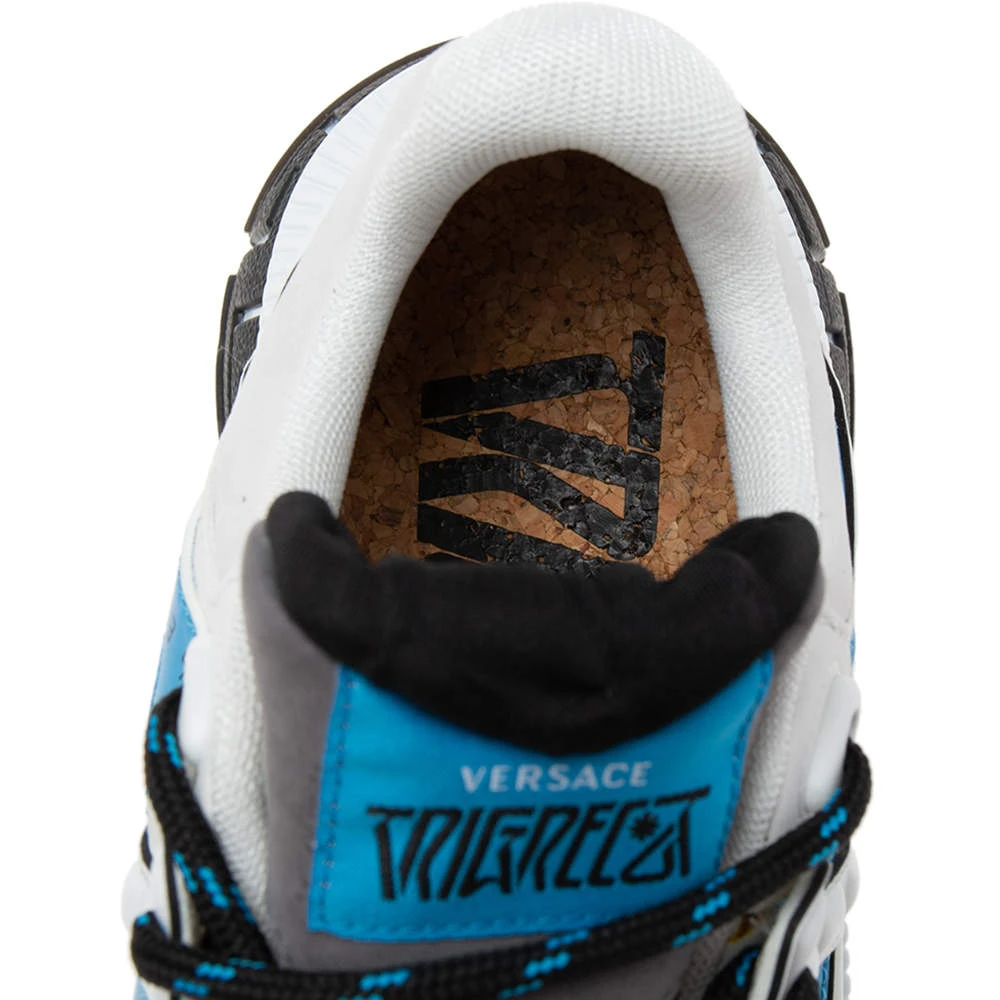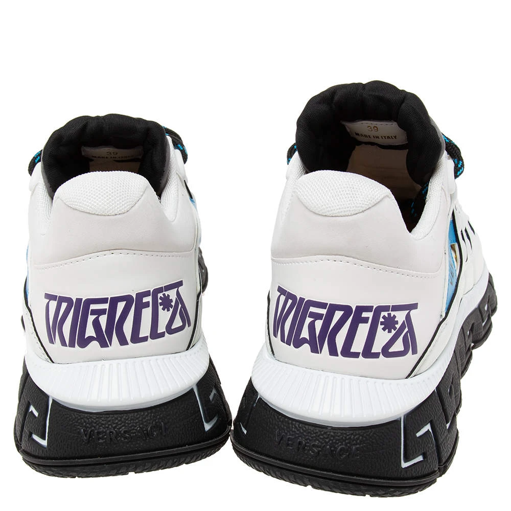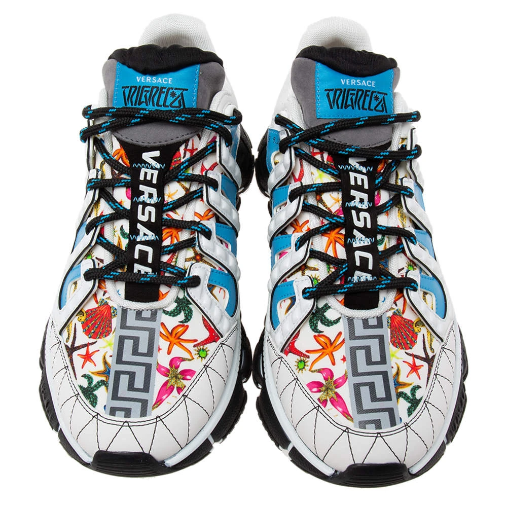 Lead colorful steps all the way with these Versace sneakers. Covered with flawless graphic patterns, they come made in leather and the Greek key pattern on the round toe, brand detailing on lace-up closure, and logo patch on tongue highlight the shoes. They rest on durable rubber soles, lined with fabric, and feature a cork insole.