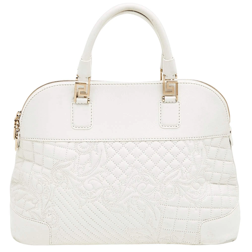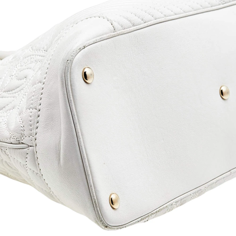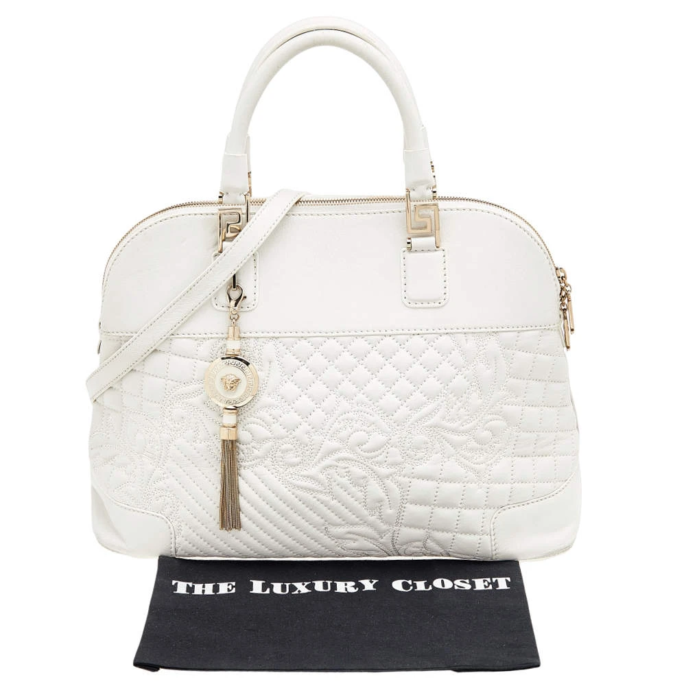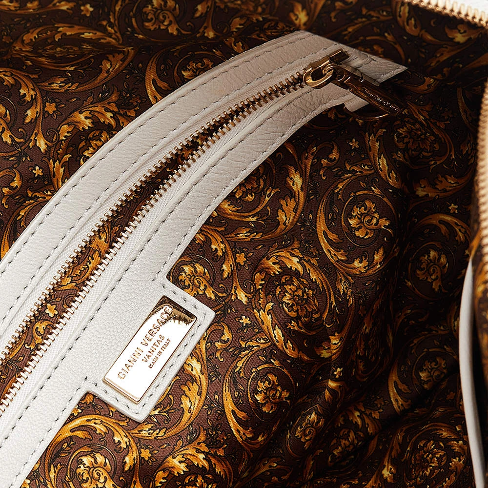 Crafted from white leather and gold-tone hardware, it carries a gorgeous design. It has a fabric interior secured by zippers and it is held by two handles and a strap. The tasselled-Medusa charm elevates its beauty.