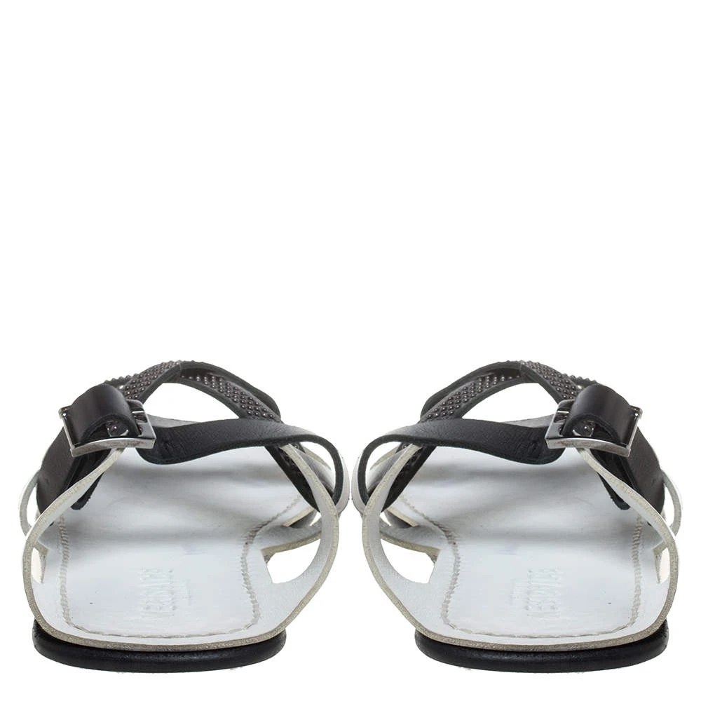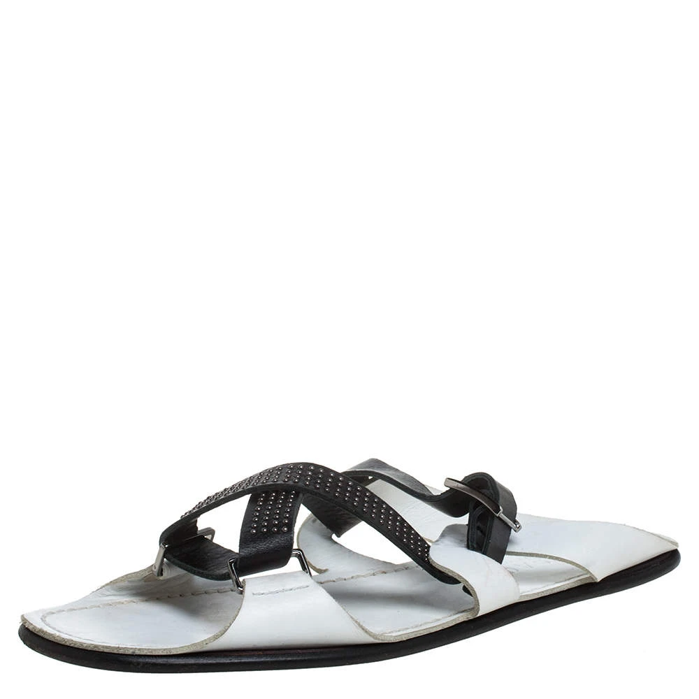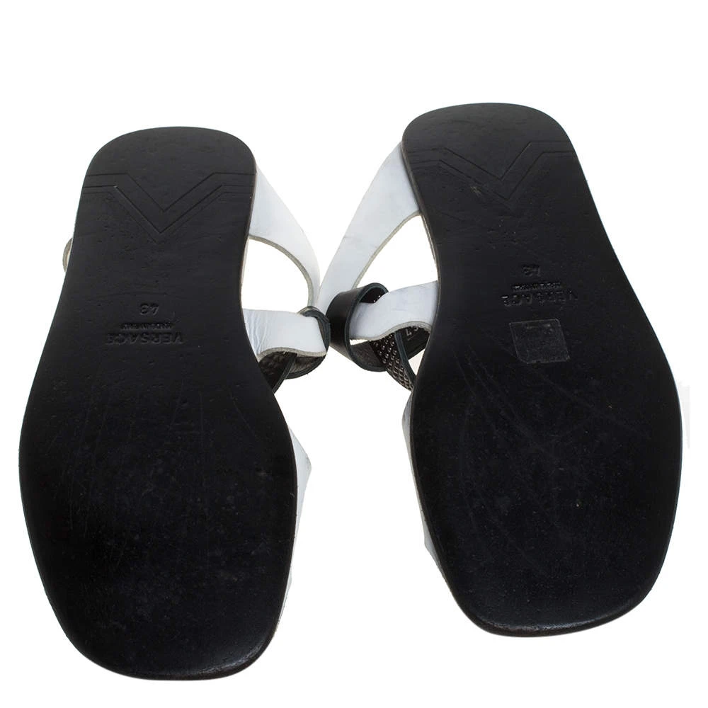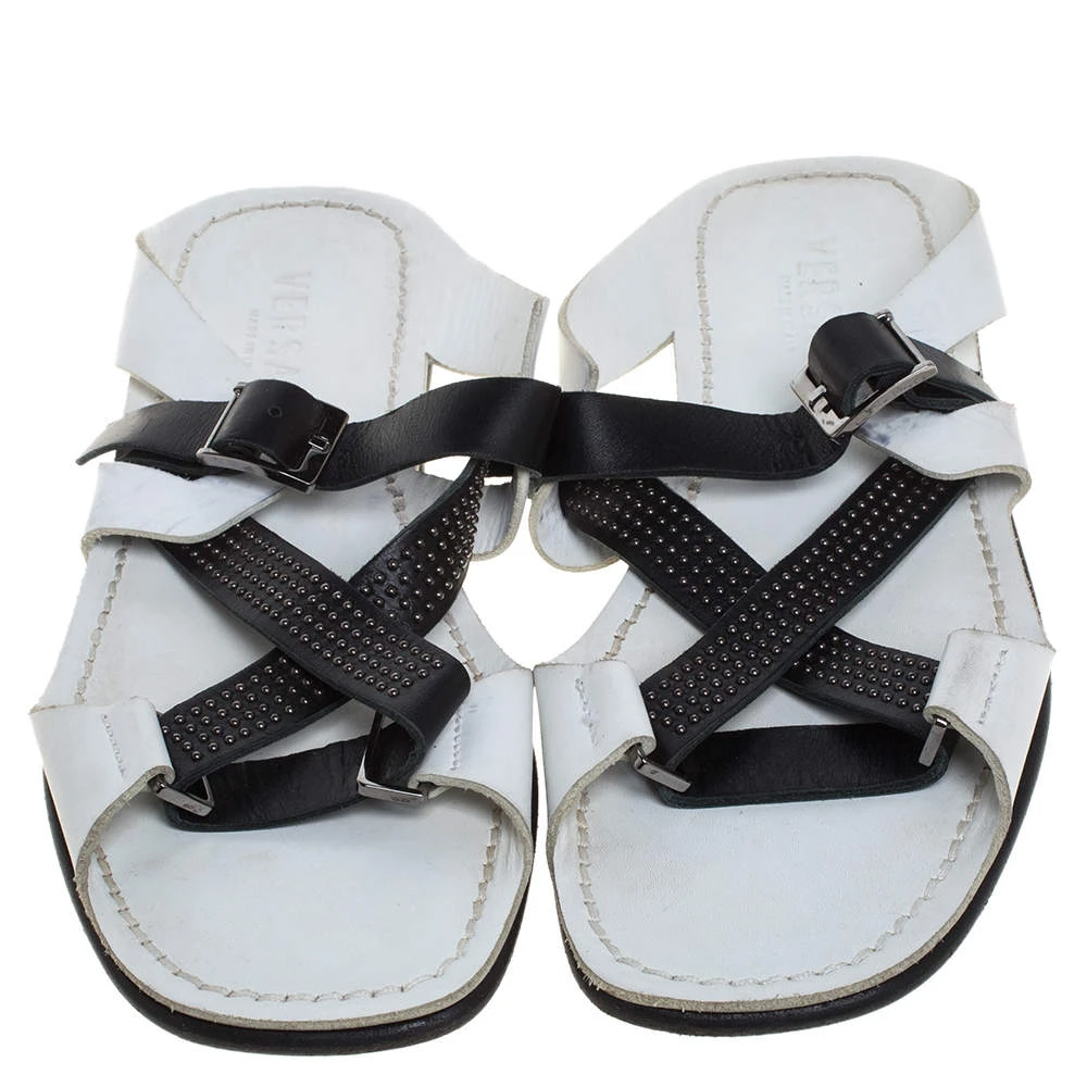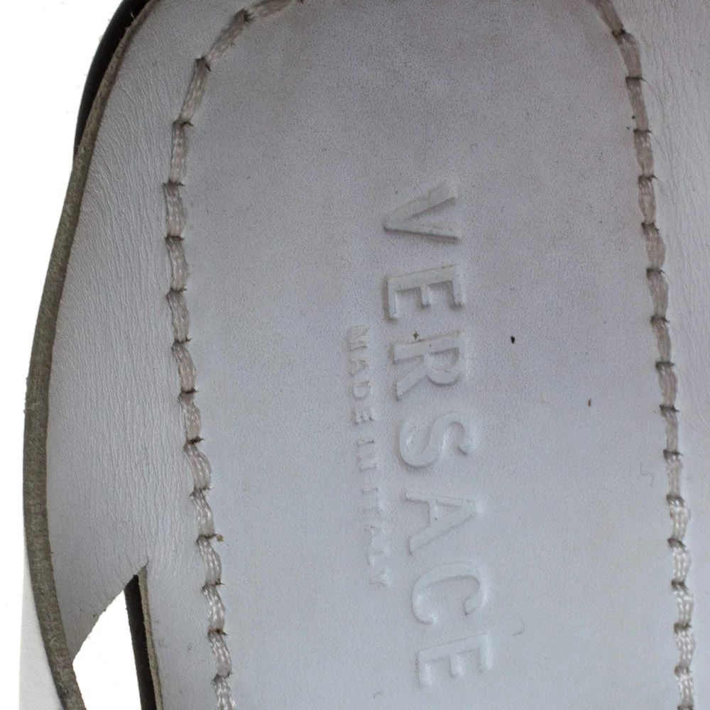 Perfectly blending comfort and style, these white slide sandals from Versace need to be owned by you! They are crafted from leather in an open toe silhouette and styled with crossover vamp straps. They are equipped with comfortable leather insoles and durable outsoles.