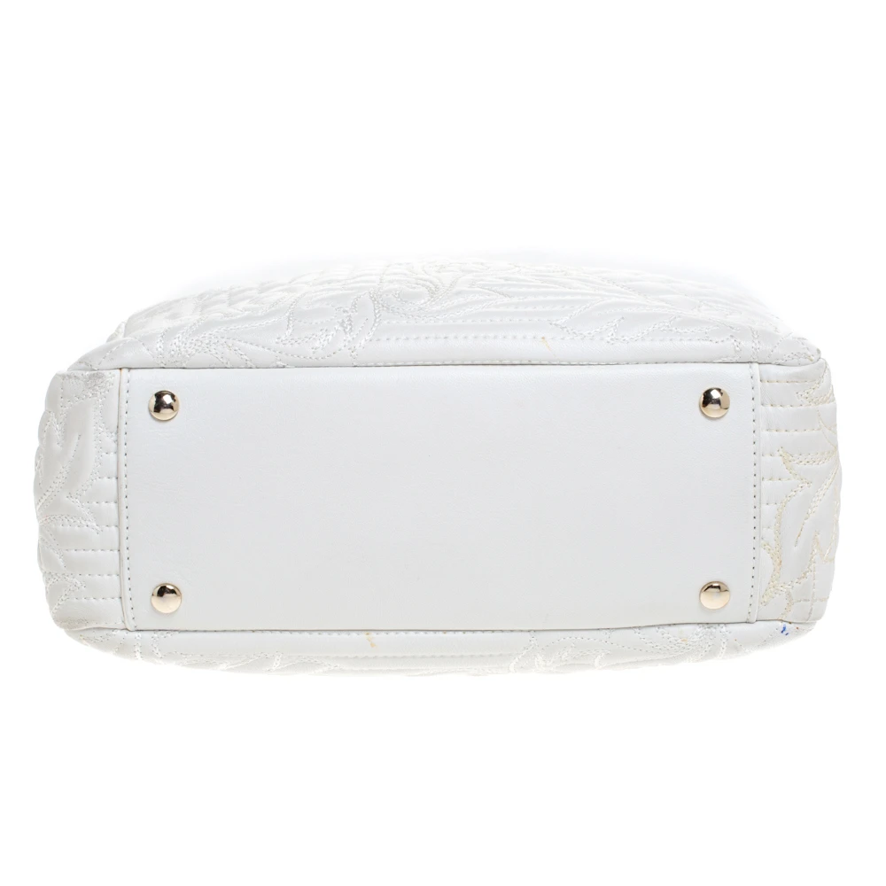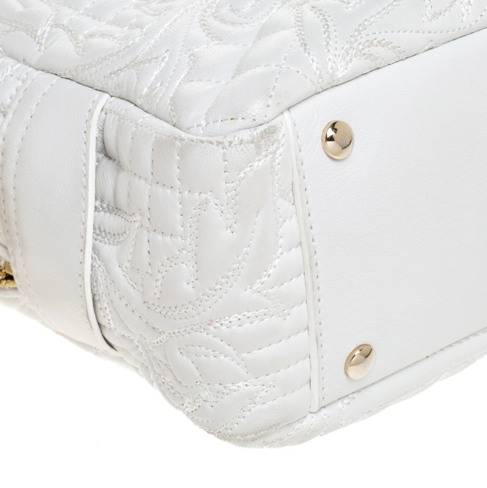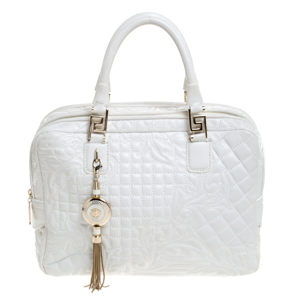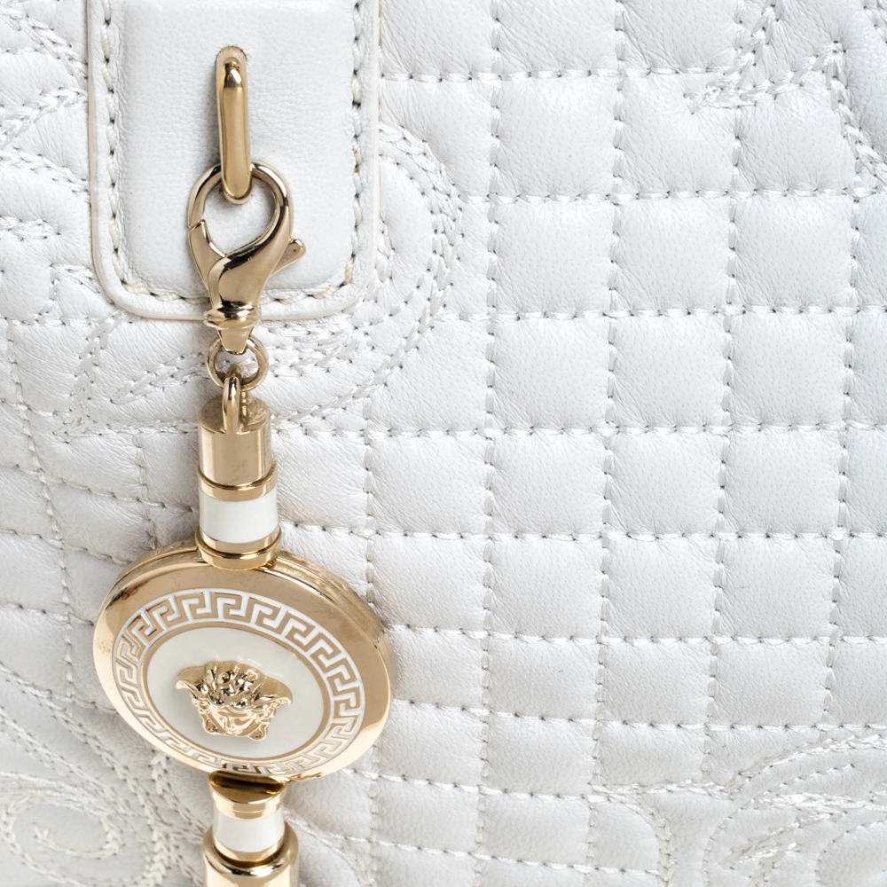 How gorgeous is this bag from Versace! Crafted from white leather and gold-tone hardware, it carries an outstanding design. It has a fabric interior secured by zippers and it is held by two handles. The tasselled-Medusa charm uplifts its beauty and makes it a buy you will not regret.