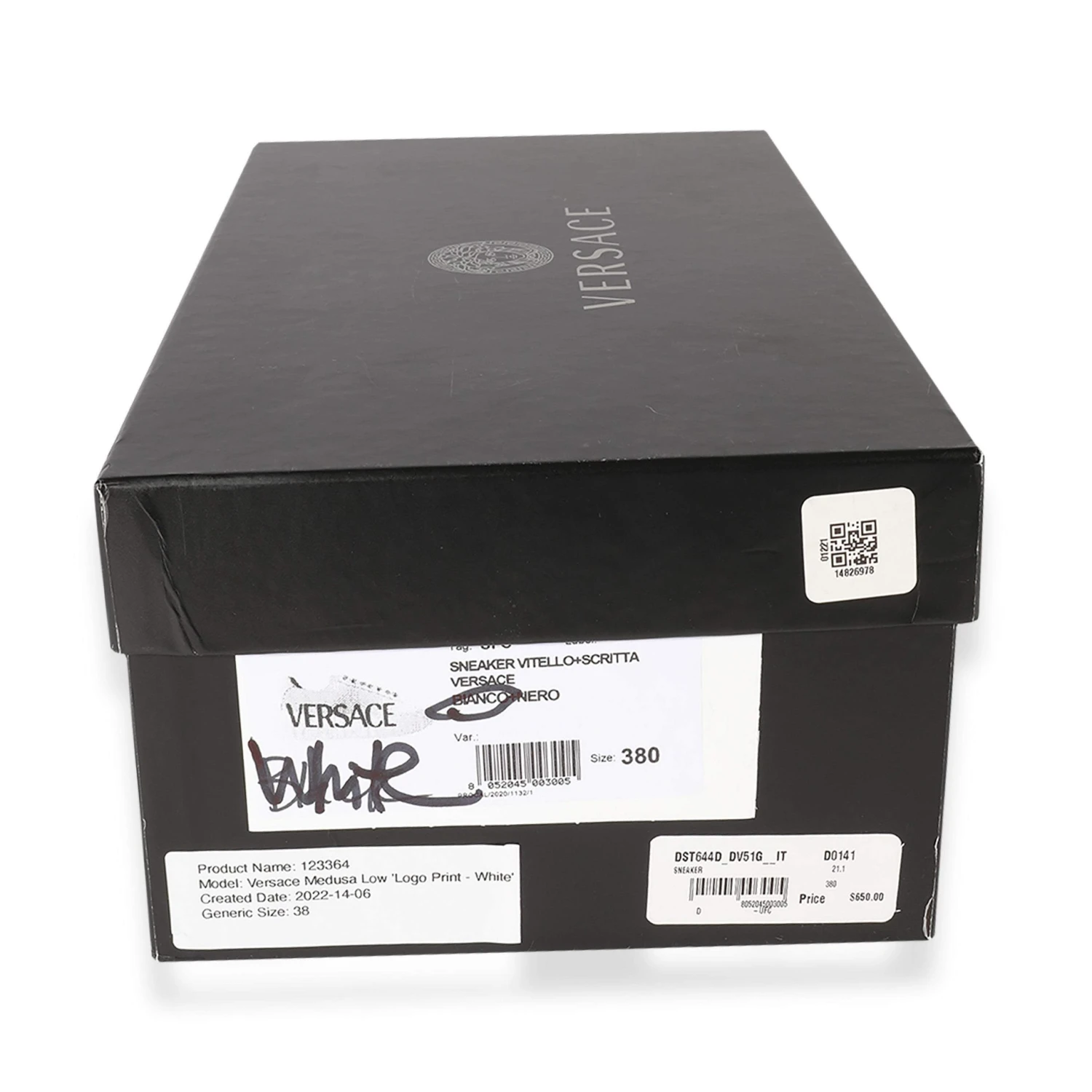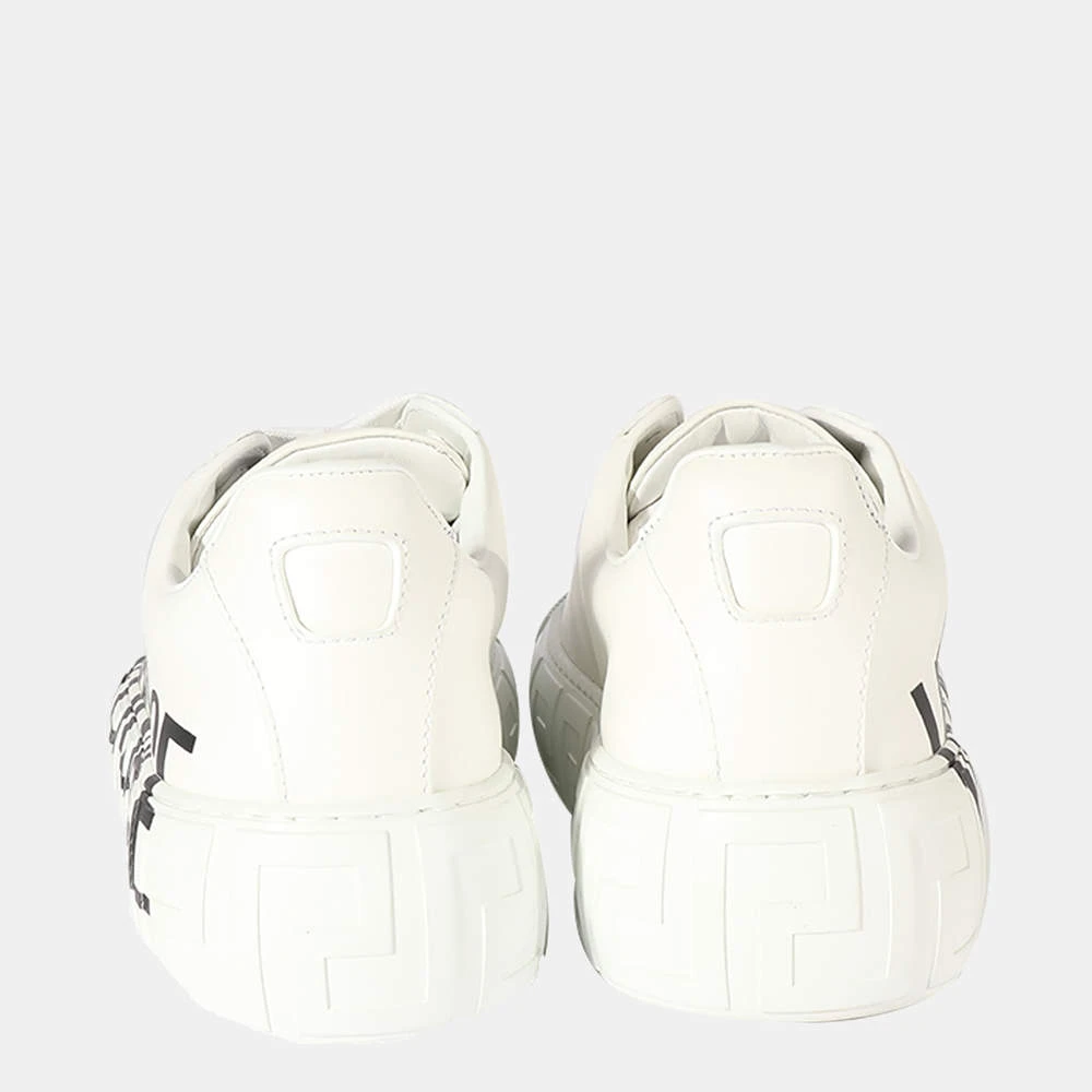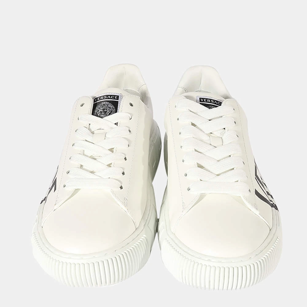 Add a twist to your minimalist styling with these elegant Versace low-top sneakers. Distinguished by sleek, clean lines, this white pair features a leather upper, a lace-up front, the graphic Greca pattern on the midsole, a lateral logo in black, and a hidden Medusa on the outsole at the heel.