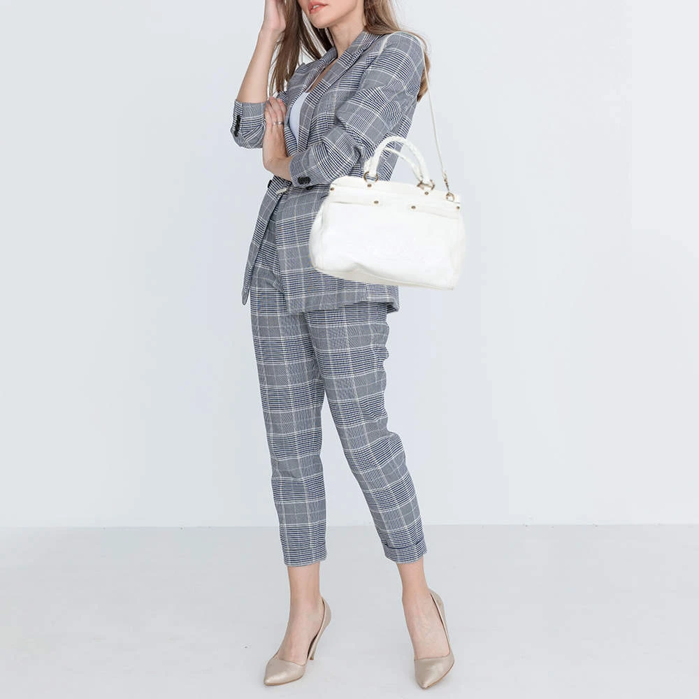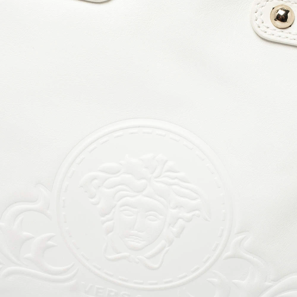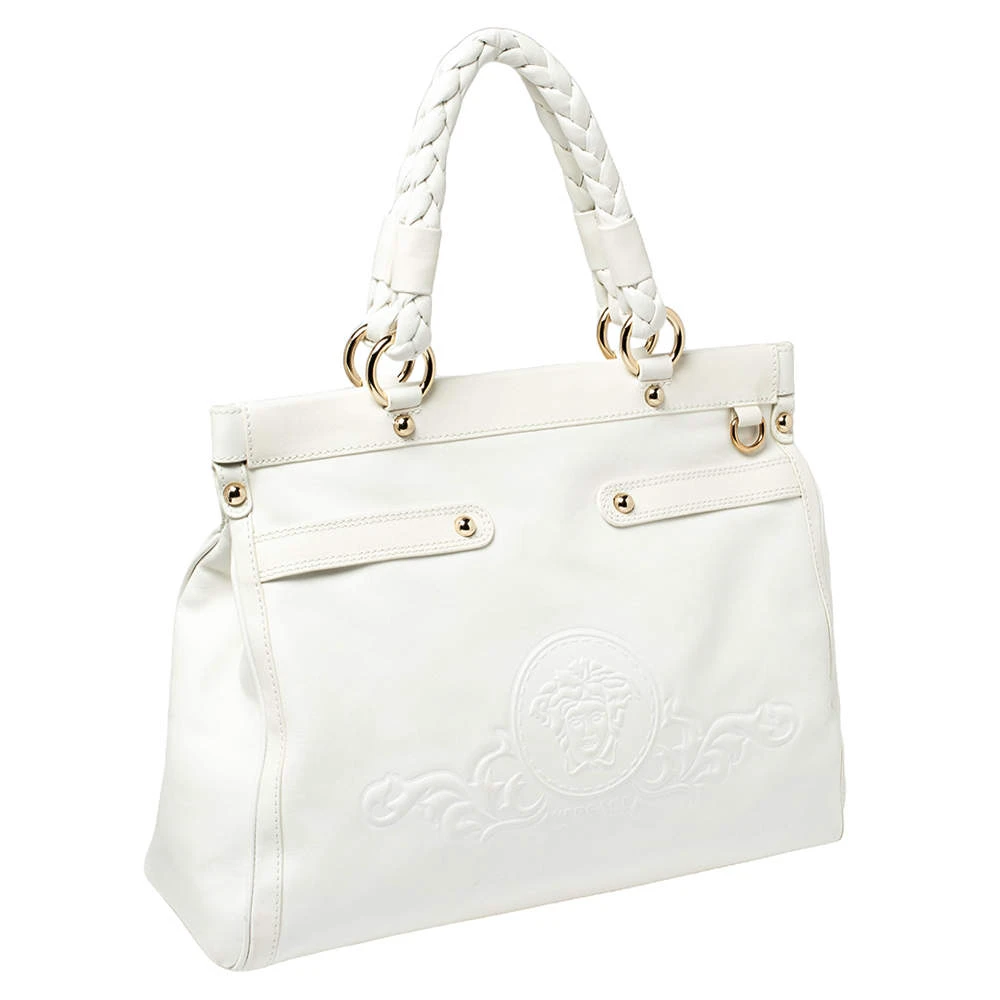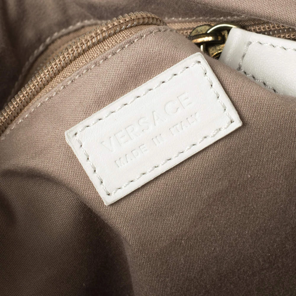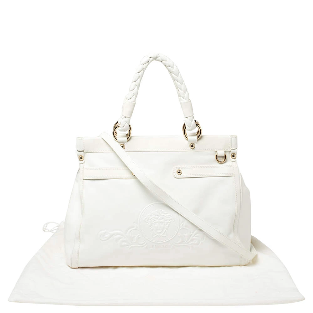 This Versace leather satchel has an alluring design. Beautifully crafted, the bag comes with a highly durable exterior detailed with the Medusa motif on the front, a spacious fabric interior, two woven handles, and a shoulder strap. The creation is ideal for daily use.