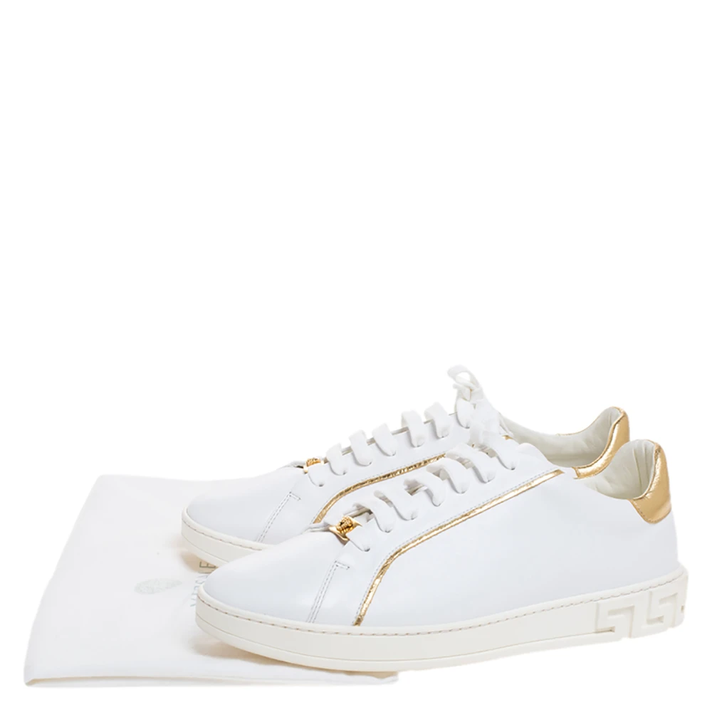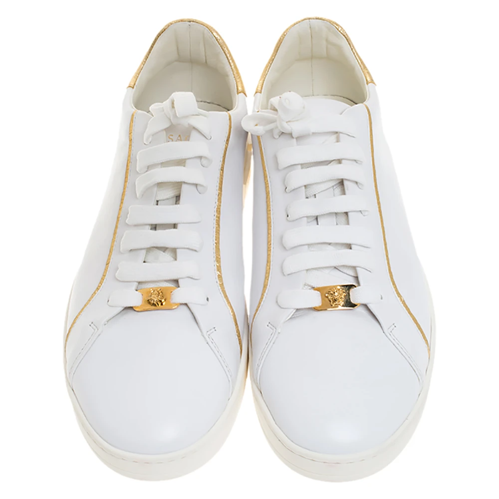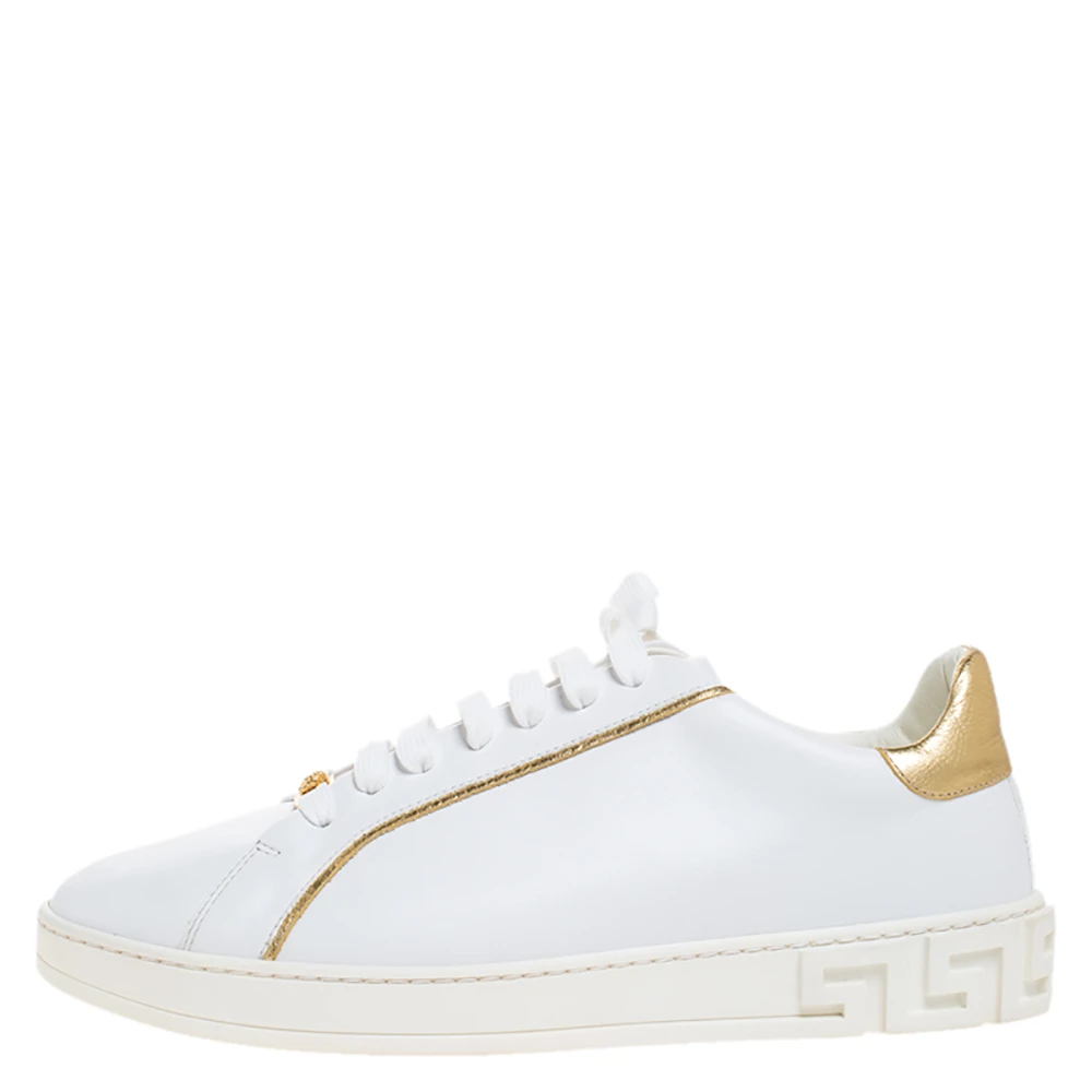These sneakers from Versace are effortlessly suave and amazingly stylish. Brimming with fabulous details, these white sneakers are crafted from leather into a low-top silhouette and feature a lace-up detailing at the front and gold-tone Medusa logo. They flaunt leather-lined insoles and comfortable rubber soles.