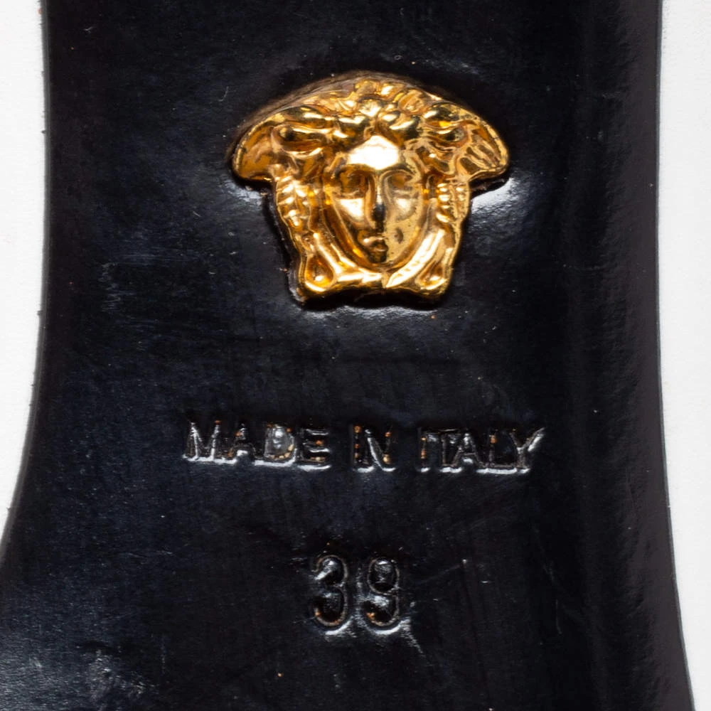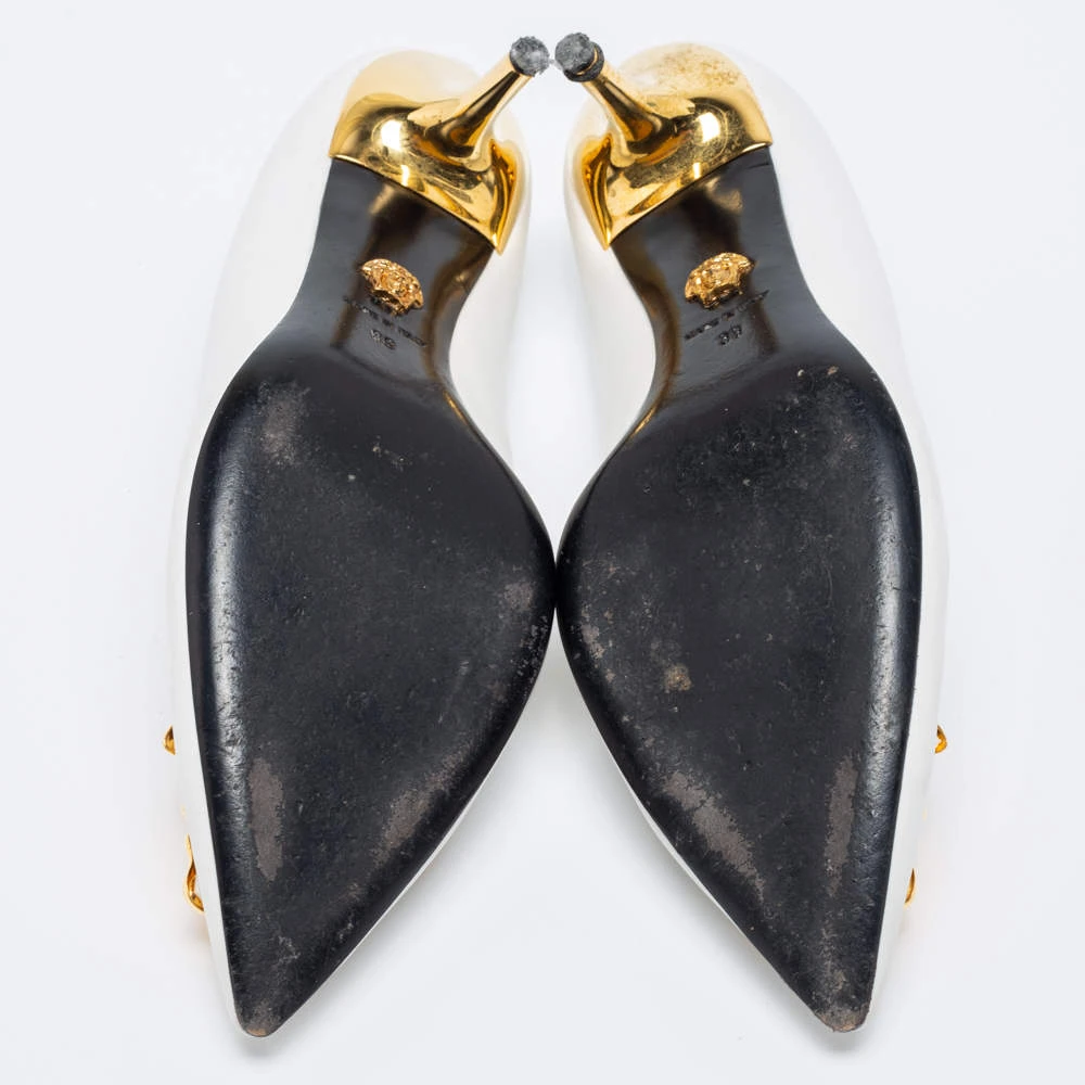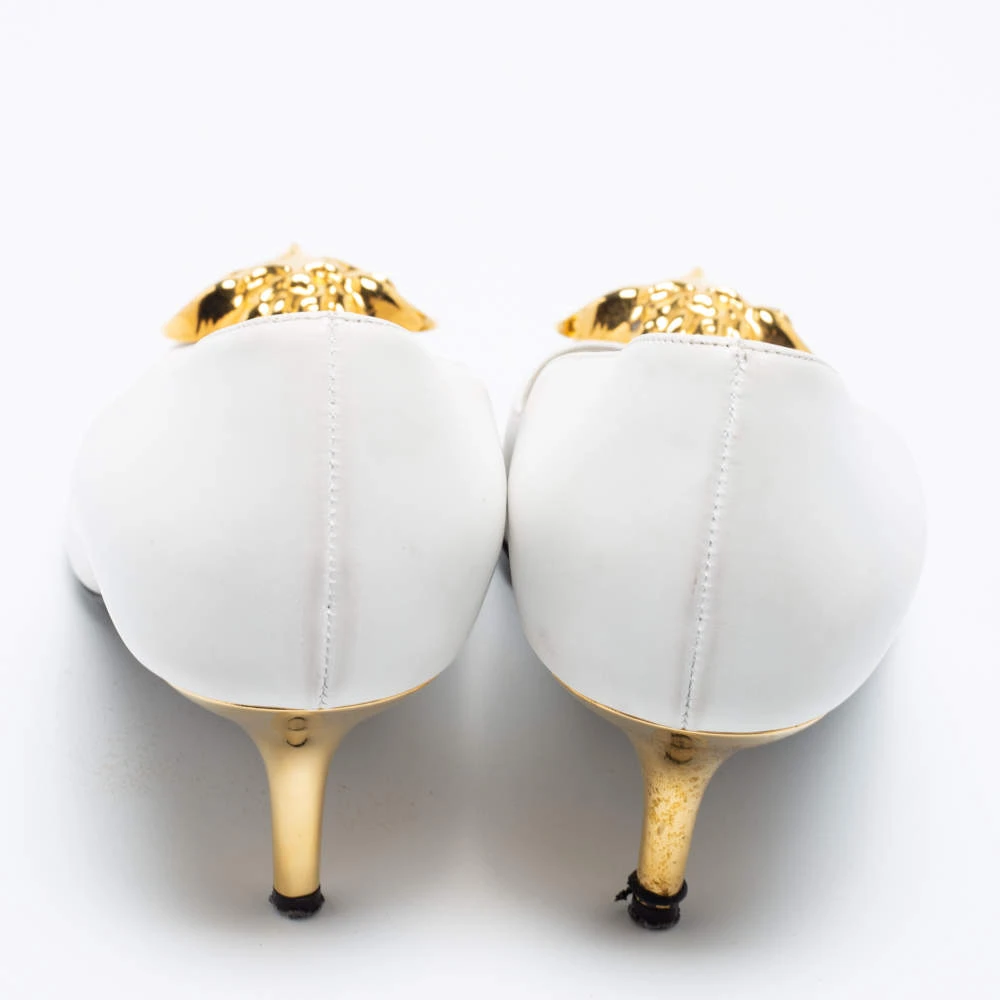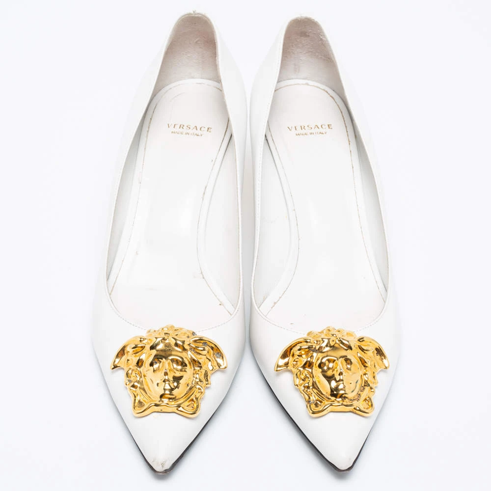 Versace’s timeless aesthetic and stellar craftsmanship in shoemaking is evident in these stunning pumps. Crafted from leather in a white shade, they are topped with the signature Medusa accent and mounted on sturdy heels for the right amount of elevation.