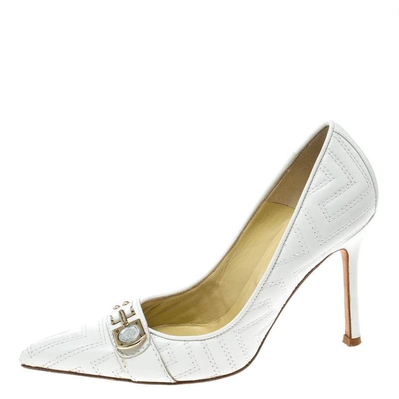 This pair of sensational pumps by Versace is the standard of sophistication. It is designed from leather, with utmost precision. These pumps are supported with leather on the insides and make a fashionable and comfortable fit. This pair of white pumps will add a classic touch to your wardrobe.