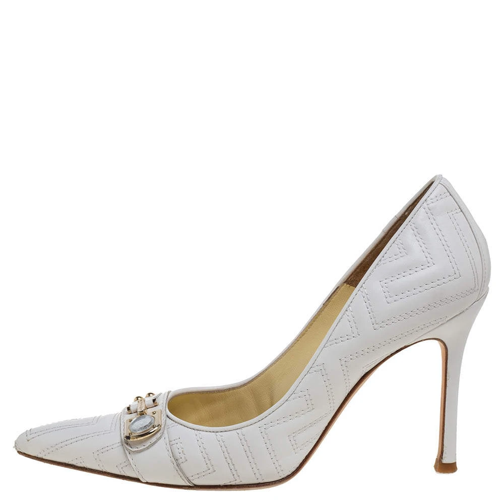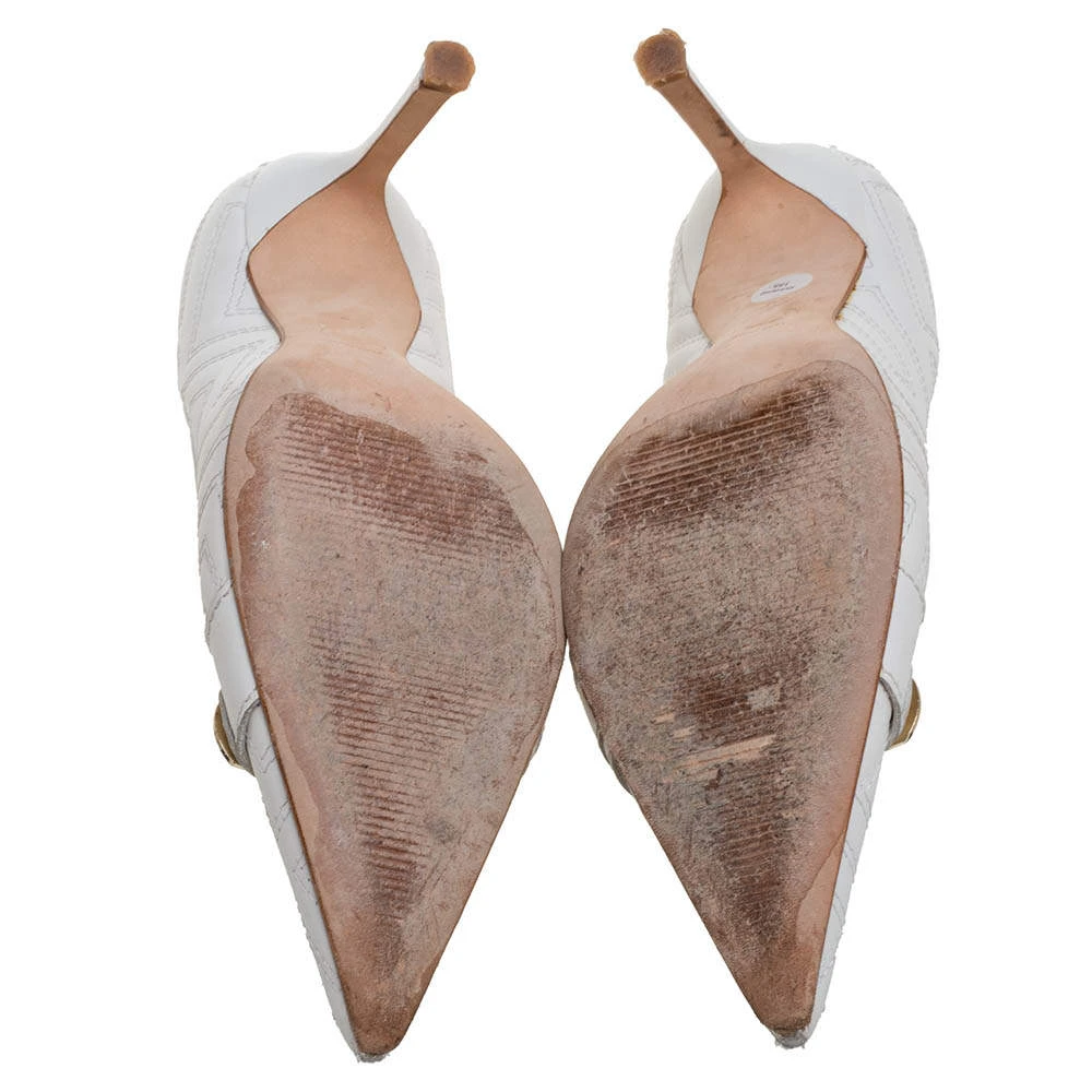 These white-colored Versace pumps are flowing with utmost splendor. They have been crafted from quilted leather material, styled with pointed toes and beautifully balanced on 10 CM heels. You will love owning this pair!