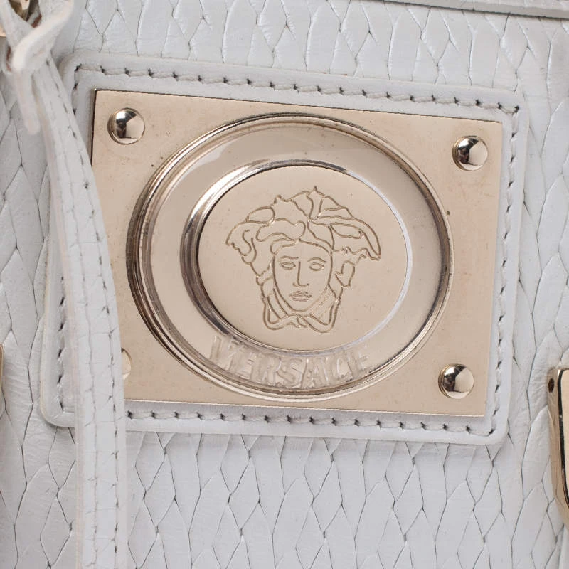 This white leather bag is the ideal pick for all your essentials. The satin lining of this bag is well-sized to house all your essentials. Made of superior quality, this studded Versace bag boasts of style and luxury.