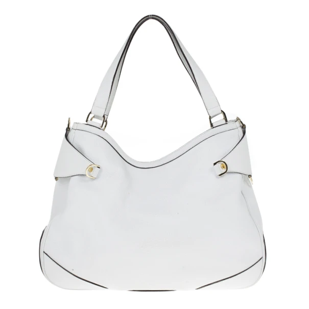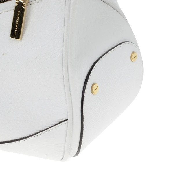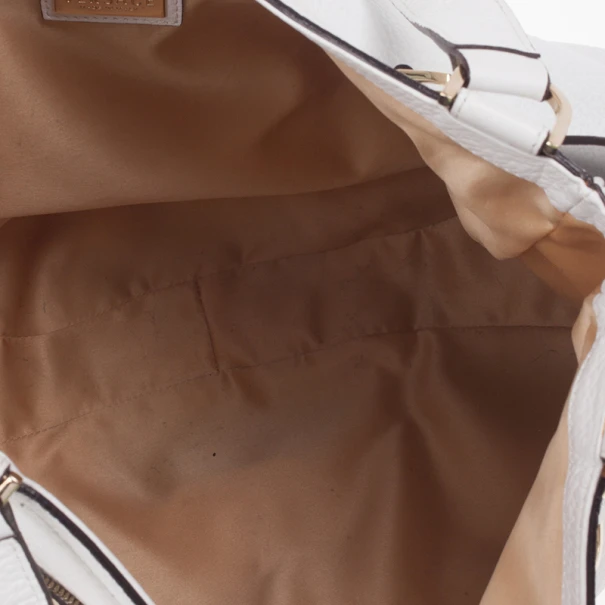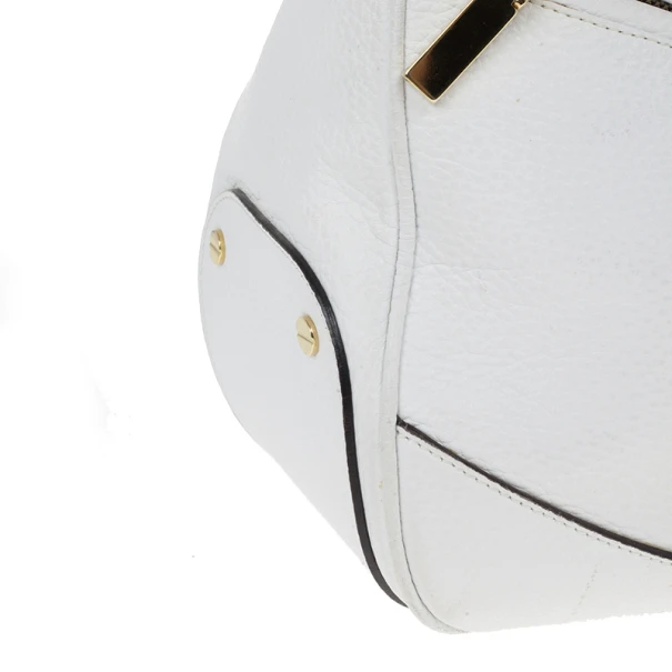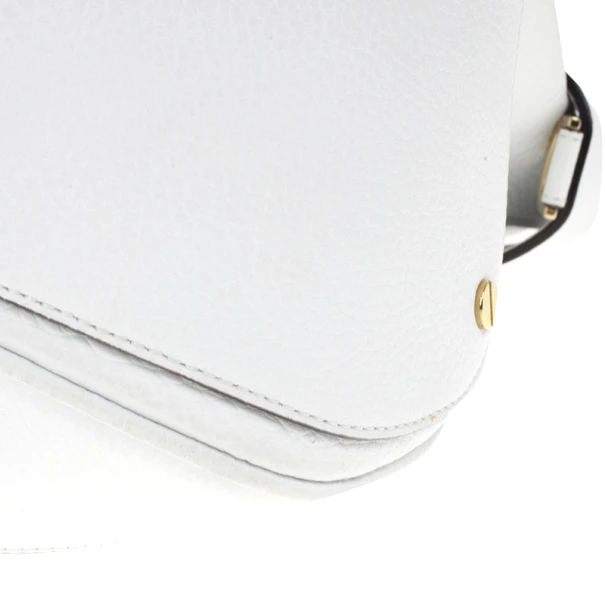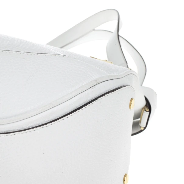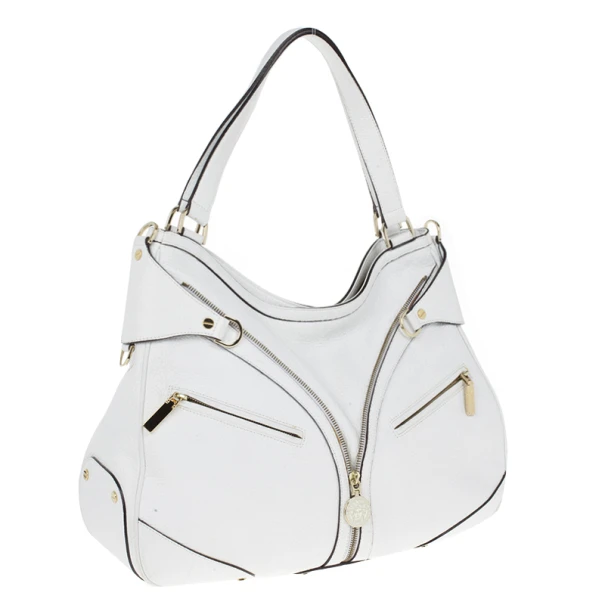 The ideal everyday bag, this Versace tote is practical and stylish. Its white leather exterior can be blended with any outfit, giving it a calm and subtle tone. The gold-tone hardware and monogrammed Medusa coin add a fun shine to the bag, while the frontal zipper and black outlines define its unique shape and design. Its top handles make it easy to carry, and its two frontal pockets allow easy access to essentials. The interior is zip-enclosed and has a coral textile lining with one zipped pocket.Original Retail Price: US $2,395