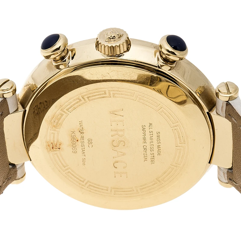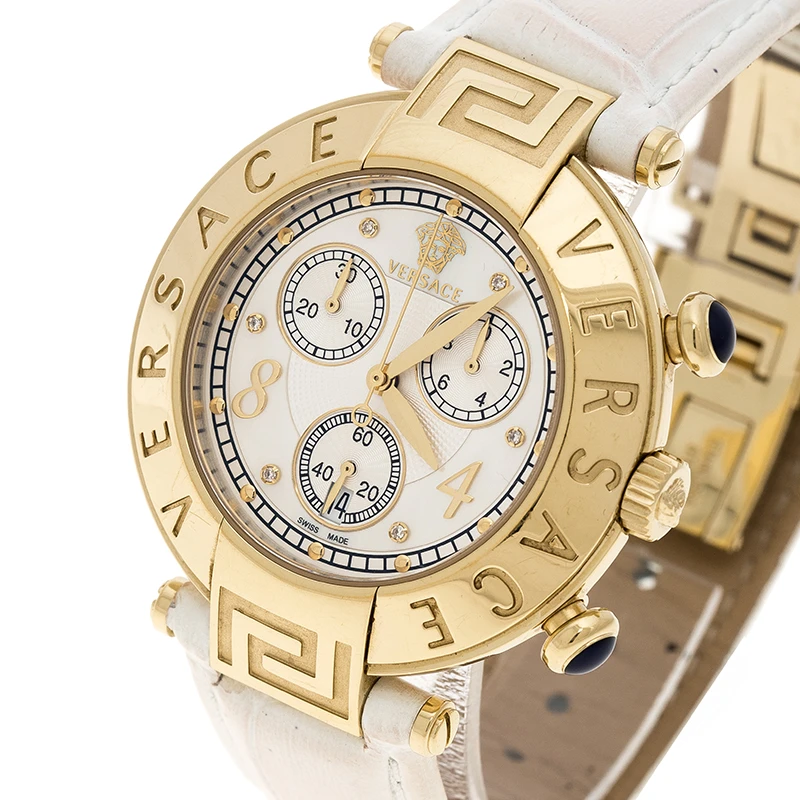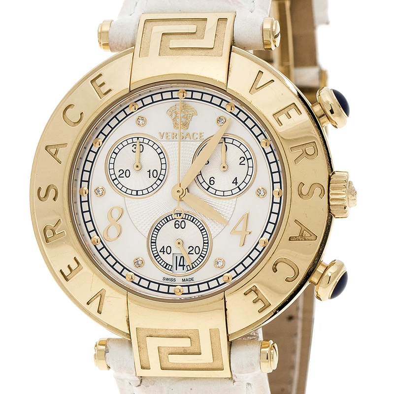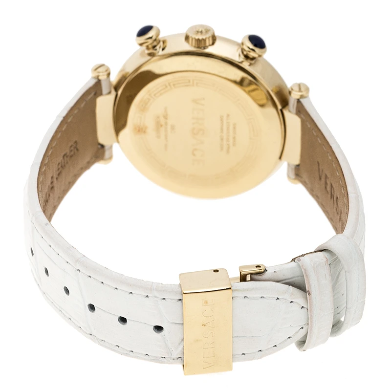 Pamper yourself with this gorgeous stainless steel Versace Aion watch featuring a quartz movement with chronograph and date complication. Gorgeous and stylish with an engraved bezel, the watch features a white mother of pearl dial and a white leather strap with deployant clasp that sits perfectly on your wrist.