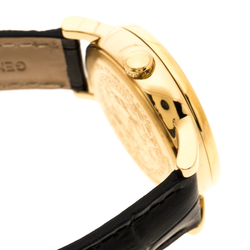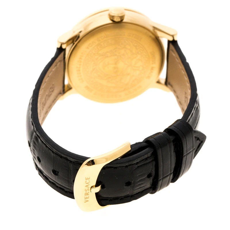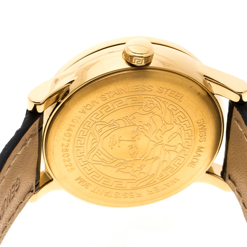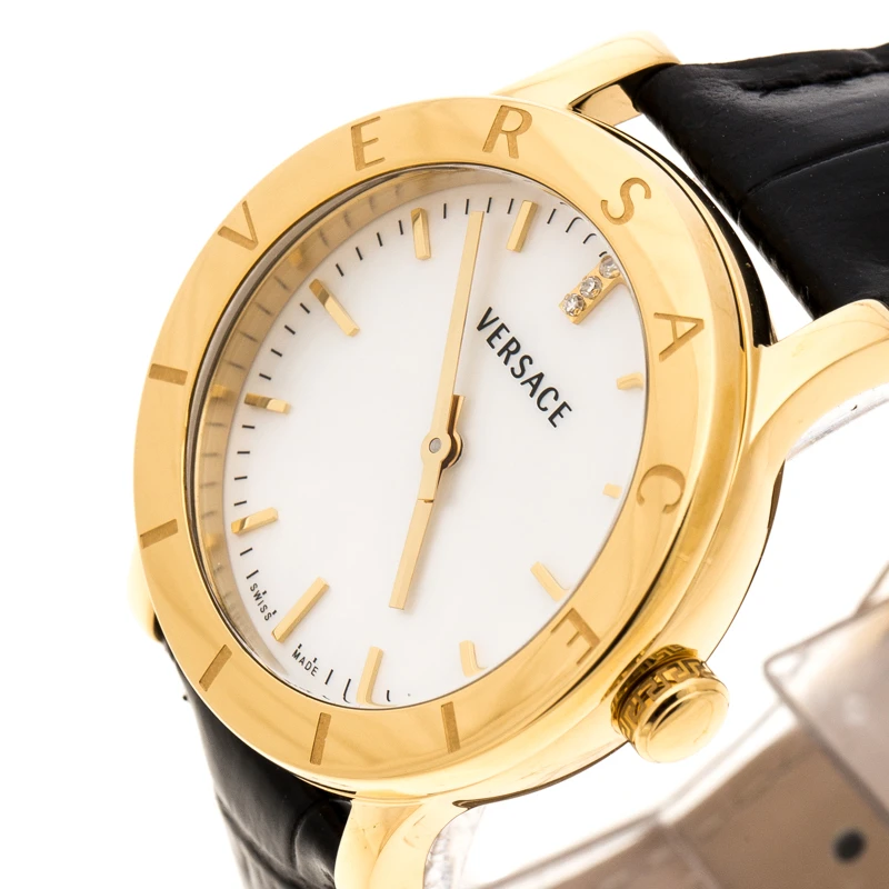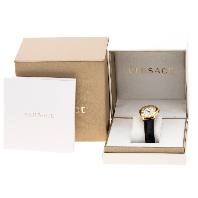 Awaiting to be yours is this stunner of a watch from Versace! Crafted with beauty using gold-plated steel, the Quartz watch is held by leather straps. It brings a white Mother of Pearl dial with index hour markers and signature engravings on the bezel, crown and caseback. Complete with a water resistance of 30 meters and a gold-plated steel buckle clasp, this gorgeous watch is a creation you will love to flaunt.