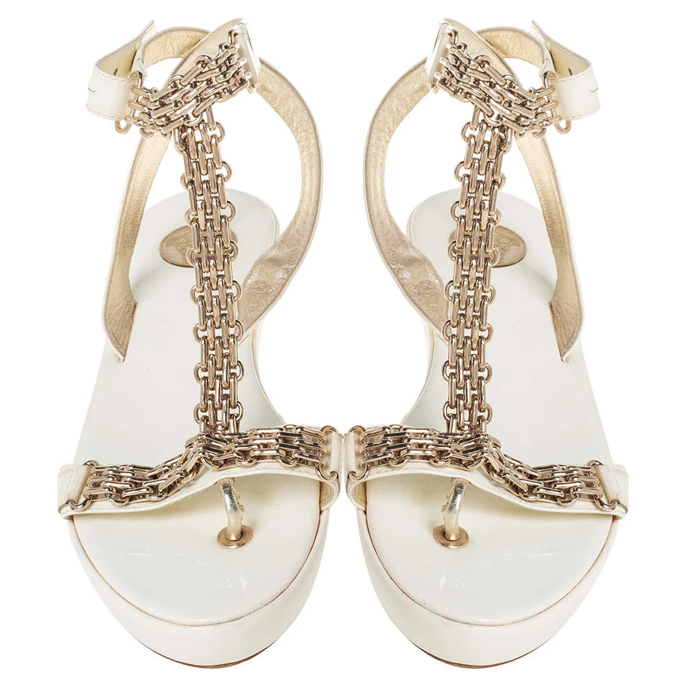 Versace’s timeless aesthetic and impeccable craftsmanship in shoemaking is evident in these stunning sandals. Crafted from patent leather in a white shade, they feature chain details for a chic appeal.