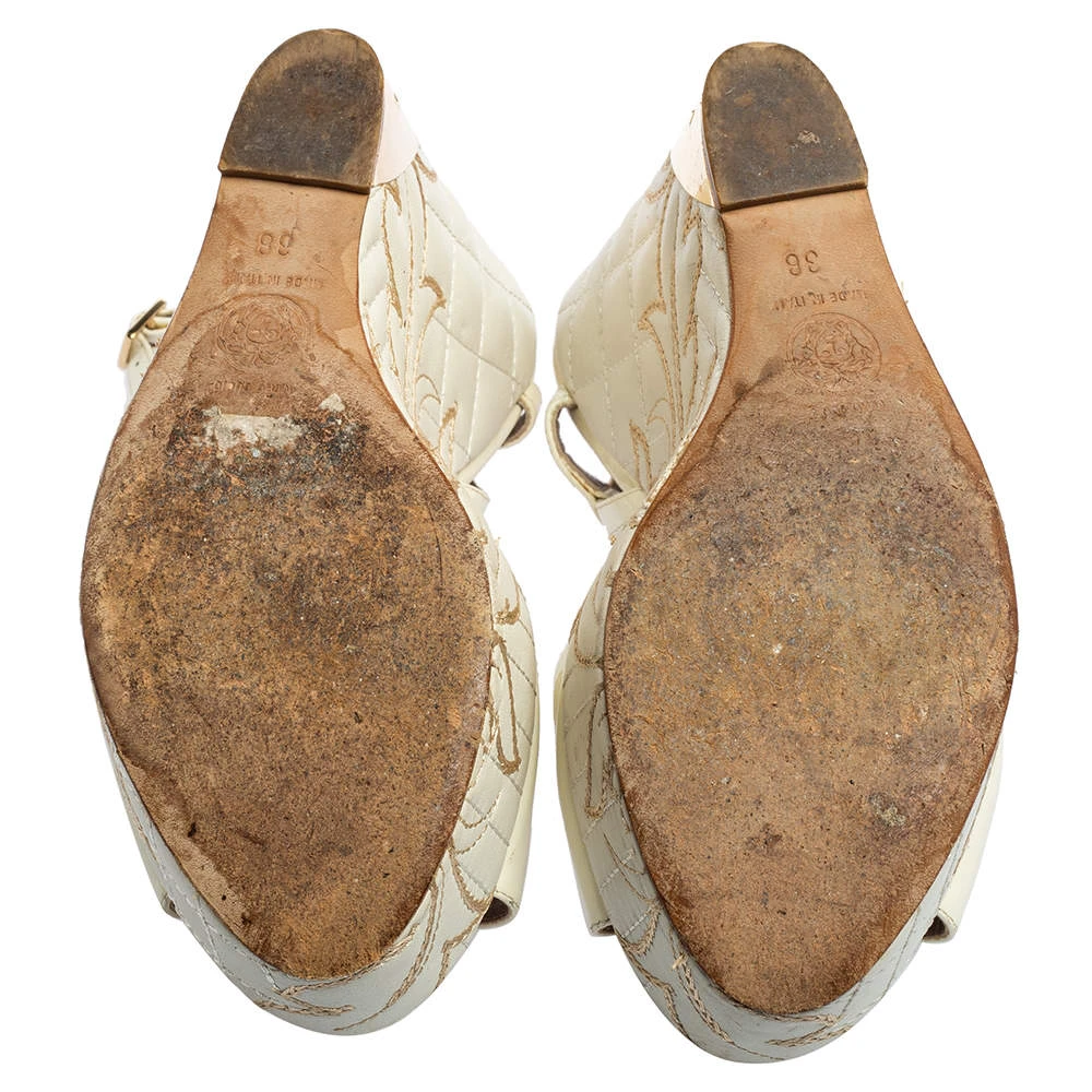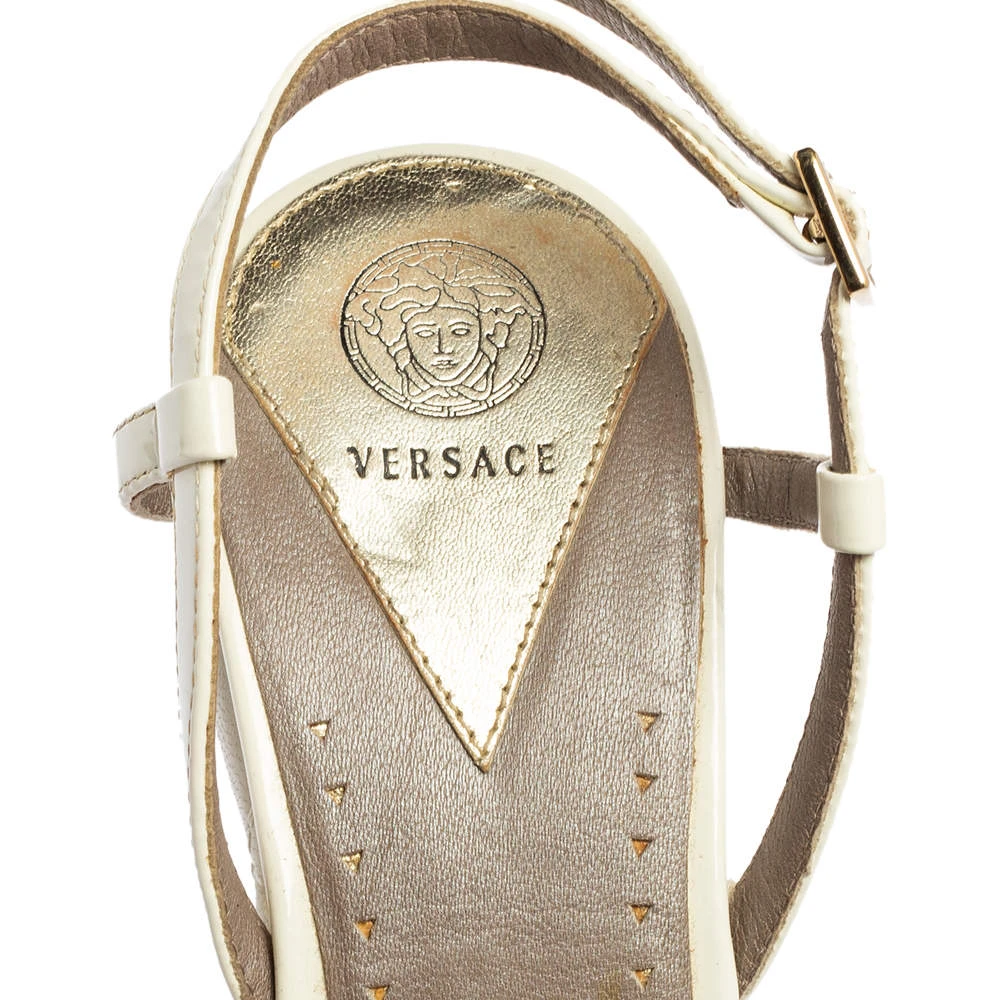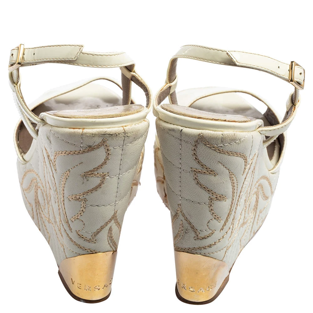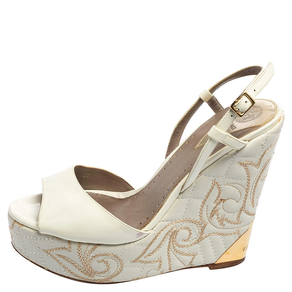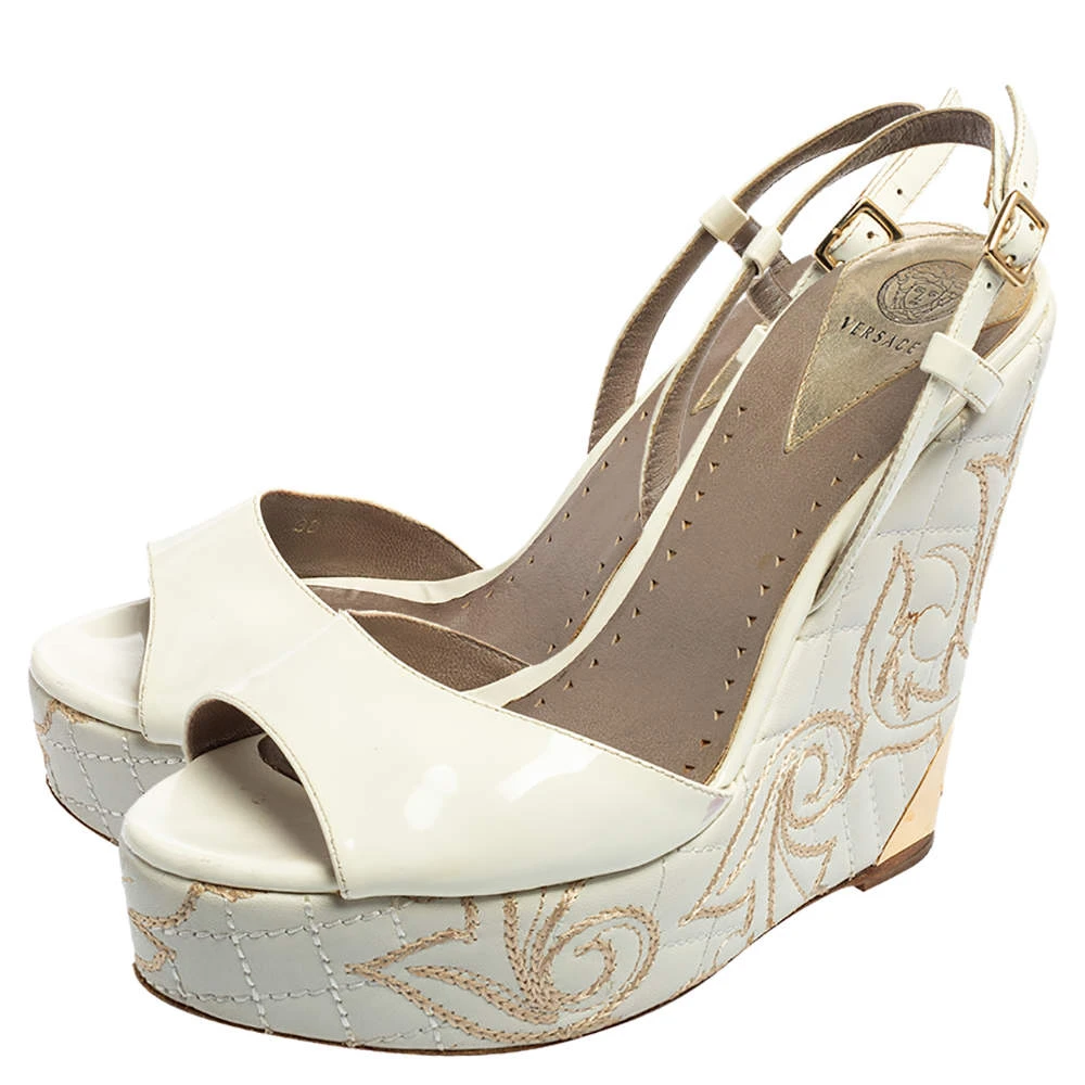 Get the most comfortable walk with these Versace platform sandals. This pair comes in white patent leather and features open toes, slingback straps with buckles, as well as a quilted pattern on the wedge heels.