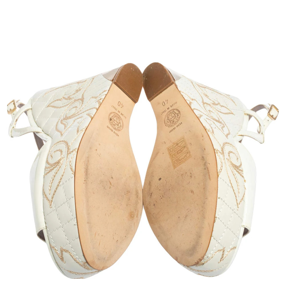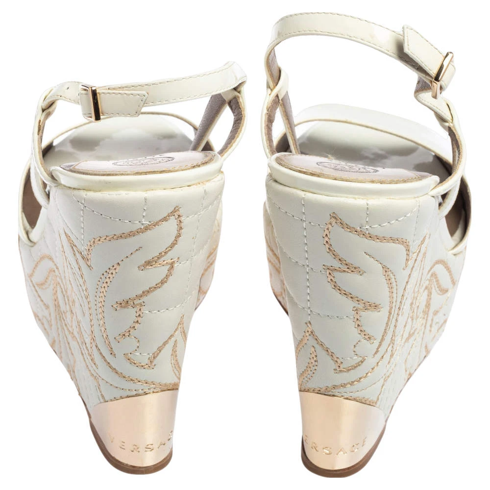 Get the most comfortable walk with these Versace wedge sandals. They come in patent leather and feature open toes, buckle slingback straps, and quilted wedge heels.