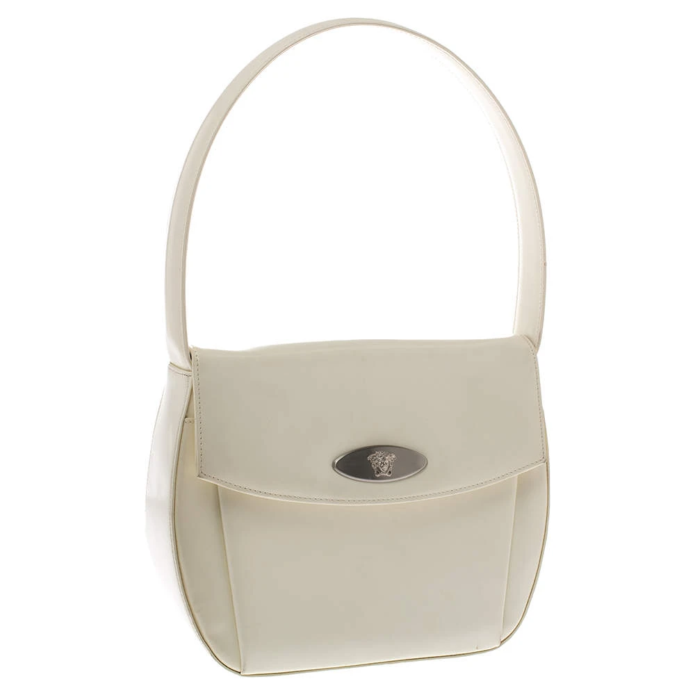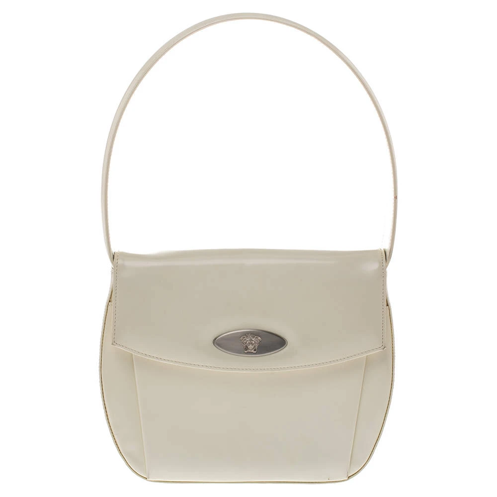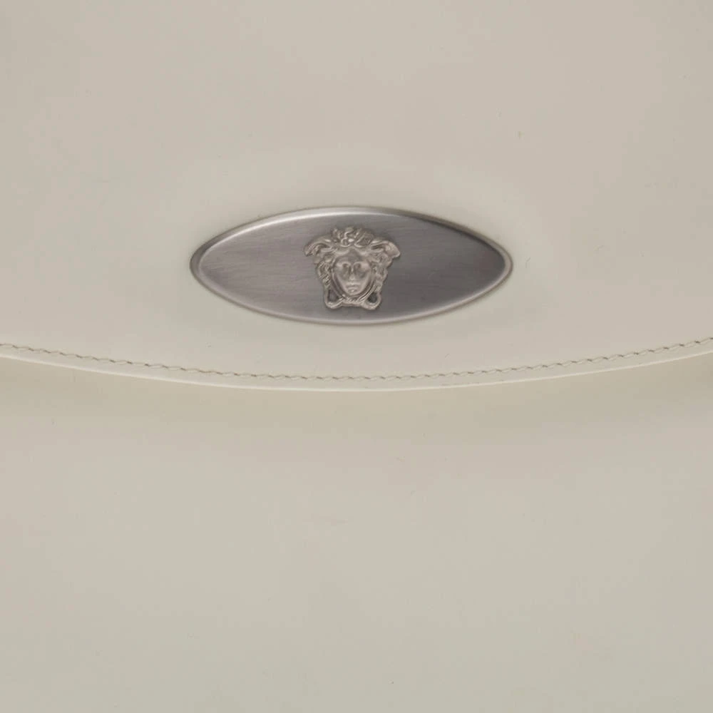 This stylish and glossy shoulder bag by Versace will make sure you are the talk of the town. Its versatile exterior comes in a lovely shade of white and is crafted from quality patent leather. It is styled iwth a front flap that carries the brand logo and opens to a spacious nylon-lined interior. It is equipped with a zip pocket and a single handle. It is further beautified with silver-tone hardware.