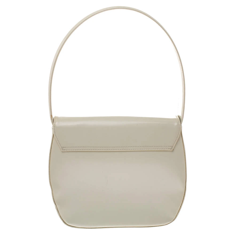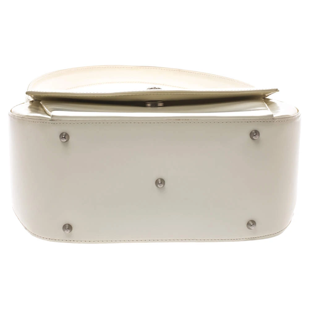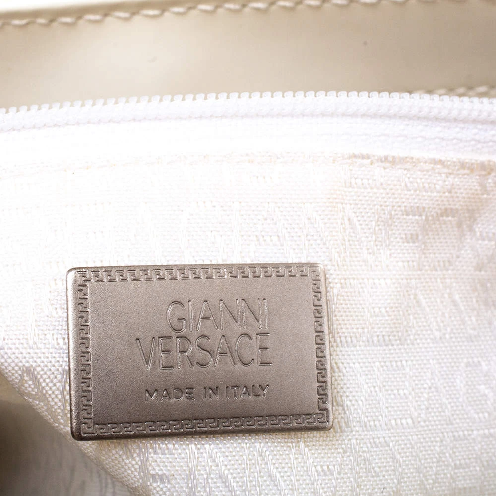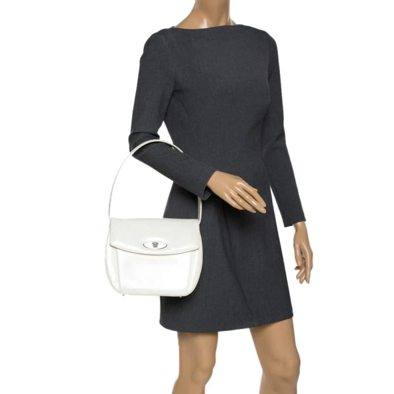 This stylish and glossy shoulder bag by Versace will make sure you are the talk of the town. Its versatile exterior comes in a lovely shade of white and is crafted from quality patent leather. It is styled iwth a front flap that carries the brand logo and opens to a spacious nylon-lined interior. It is equipped with a zip pocket and a single handle. It is further beautified with silver-tone hardware.