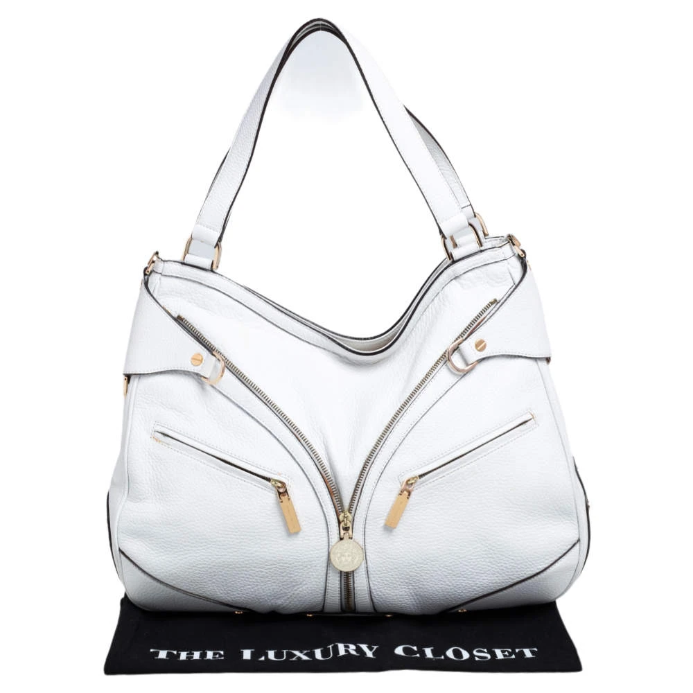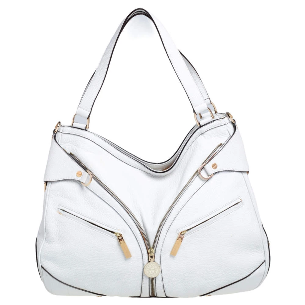 This white leather biker bag by Versace is just what you need to create an edgy and chic look. Made from white leather, it is detailed with gold-tone buckles and multiple zippers and pockets that enhance the feel of the bag. The interior is lined with satin and features a zip pocket.