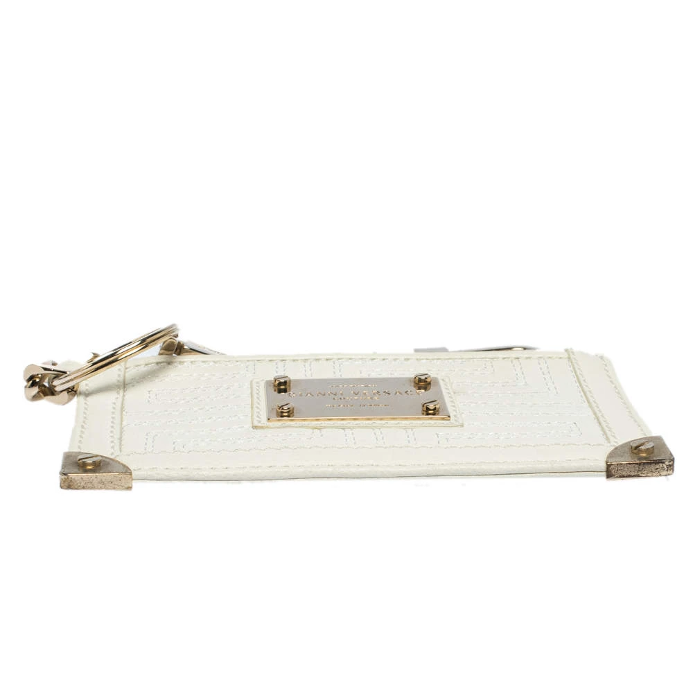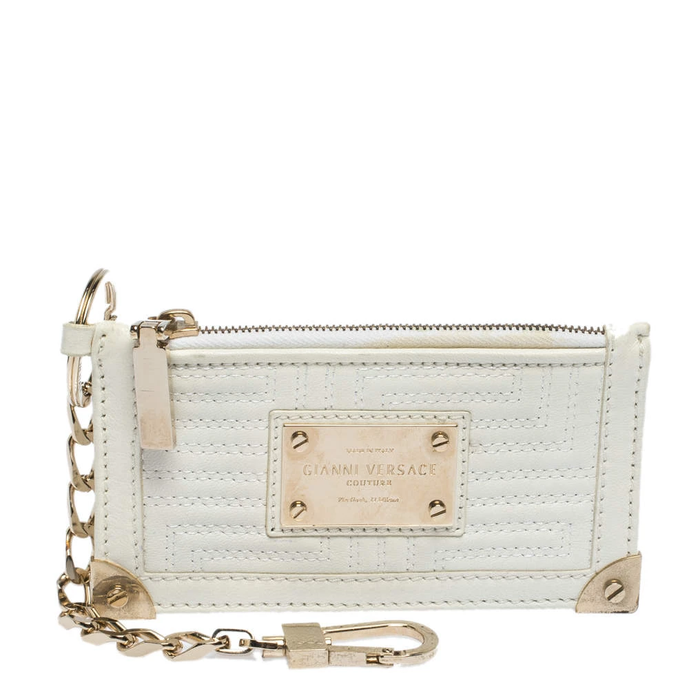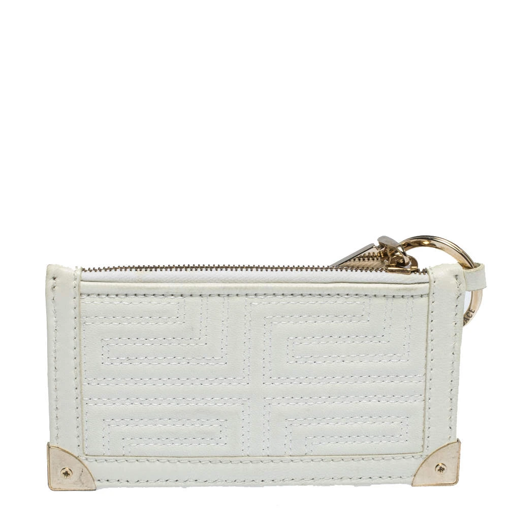This coin purse is a lovely creation from the house of Versace. Crafted from leather, it is decorated with the brand logo on the front and metal edges. It comes with a zip-secured interior and equipped with a gold-tone chain-link key charm. Amp up your style game with this white, quilted creation.