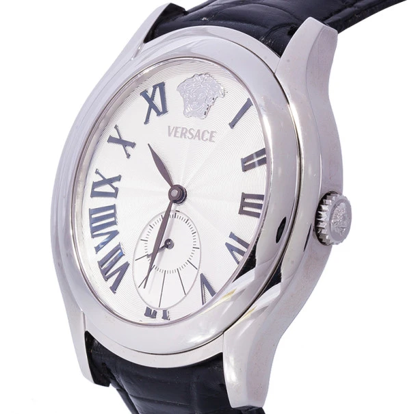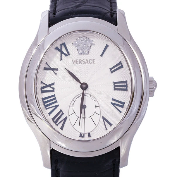 Exuding a fabulous attitude, this Versace watch is a versatile piece every woman needs. Its simple silver-tone stainless steel case is coupled with a round matching bezel, contrasting with the pearlescent ribbed white dial coupled with the Medusa and Versace logos. The hour Roman numerals match the minute chronograph, coupled with the dark maroon hands, embossed leather straps, and a buckle closure. This 30m water resistant watch features an automatic movement.