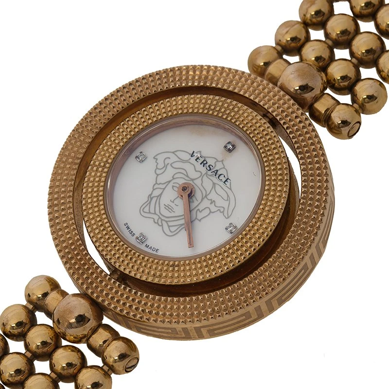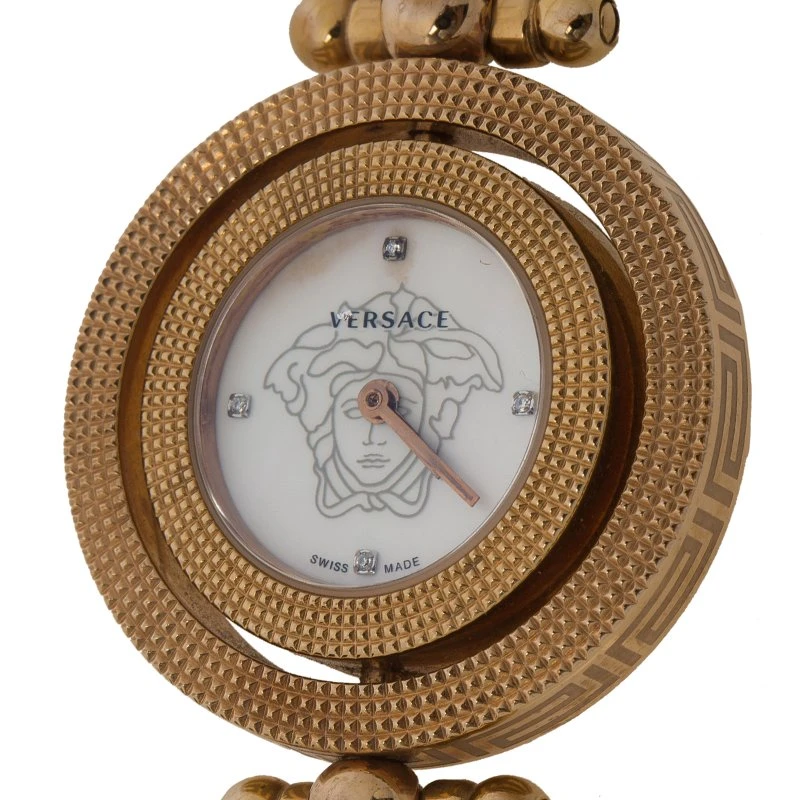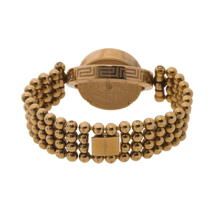 With simple elegance and charm, this Versace women’s watch is the perfect accessory for all occasions. Its white dial features the Versace logo, and is surrounded by two rose gold IP stainless steel top rings with a guilloché pattern. A comfortable bead rose gold IP stainless steel bracelet secures it in place with a deployant clasp for safe all day wear.