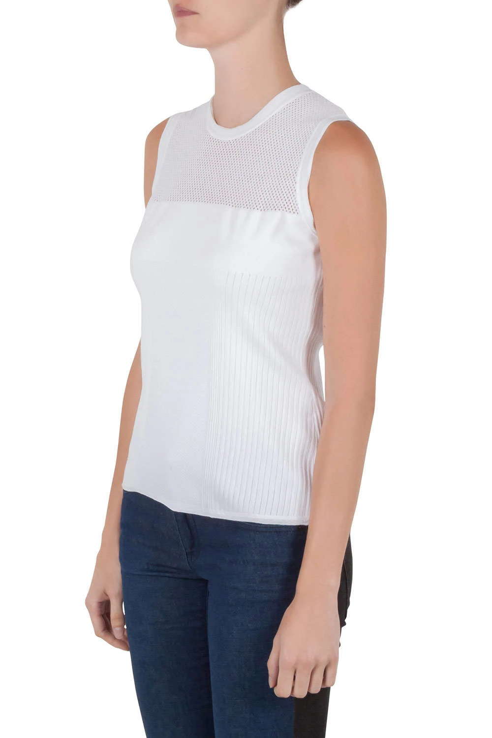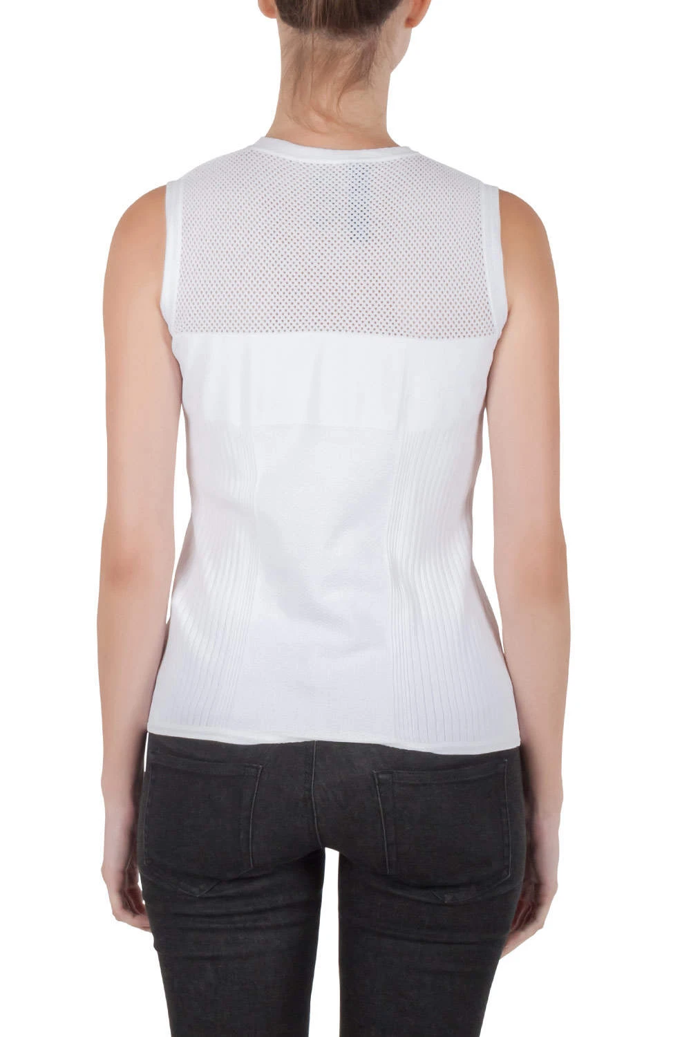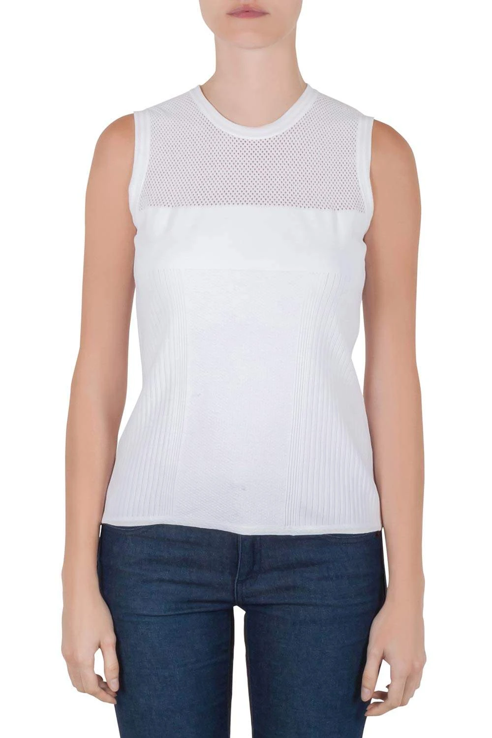 This Versace sleeveless top is perfect for daily wear. Crafted from a blend of fine fabrics, it features a simple silhouette and a smart white hue. Wear this versatile piece with different kinds of bottoms.