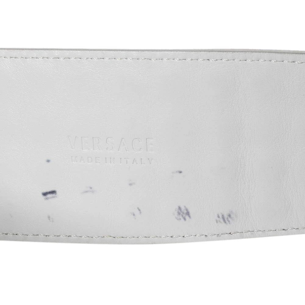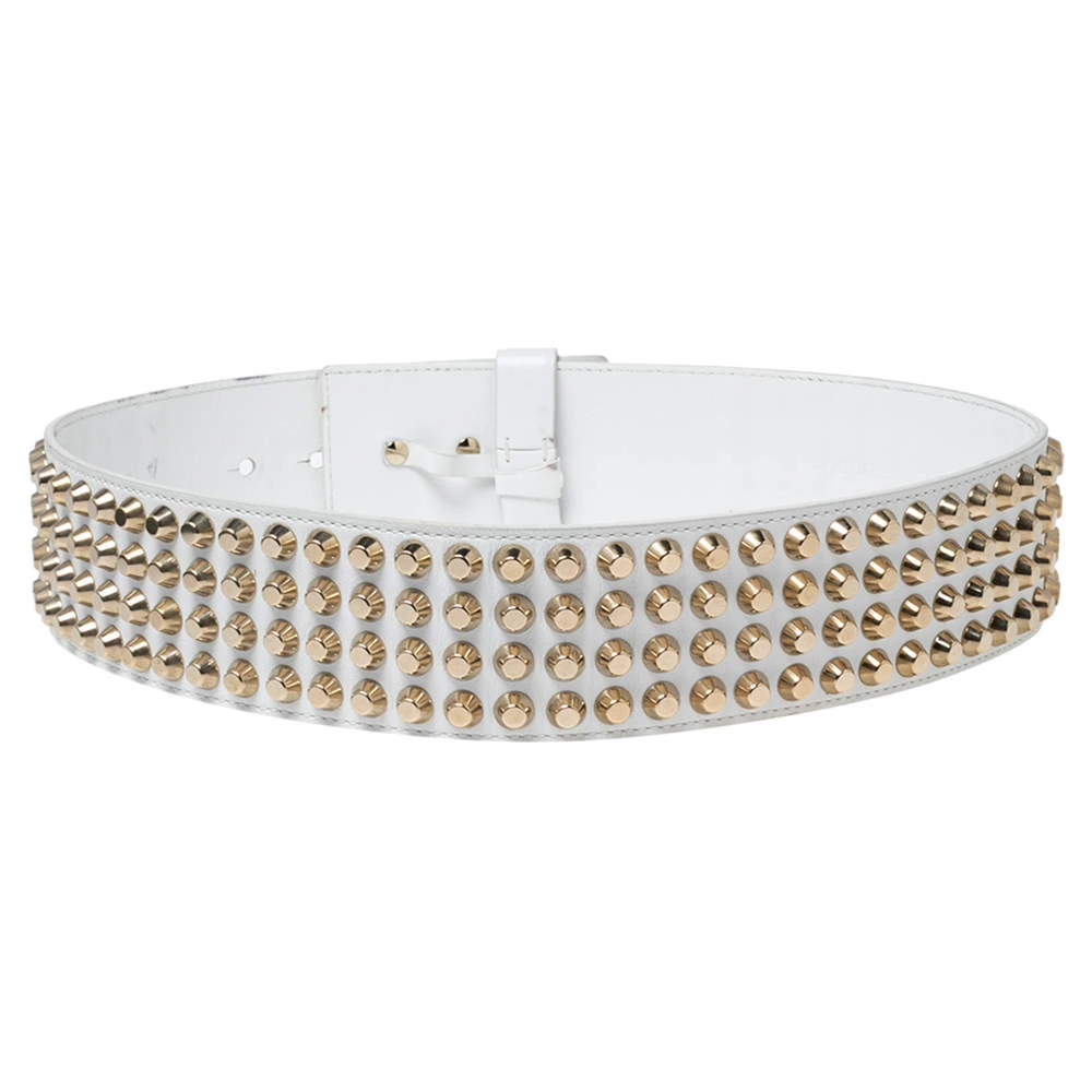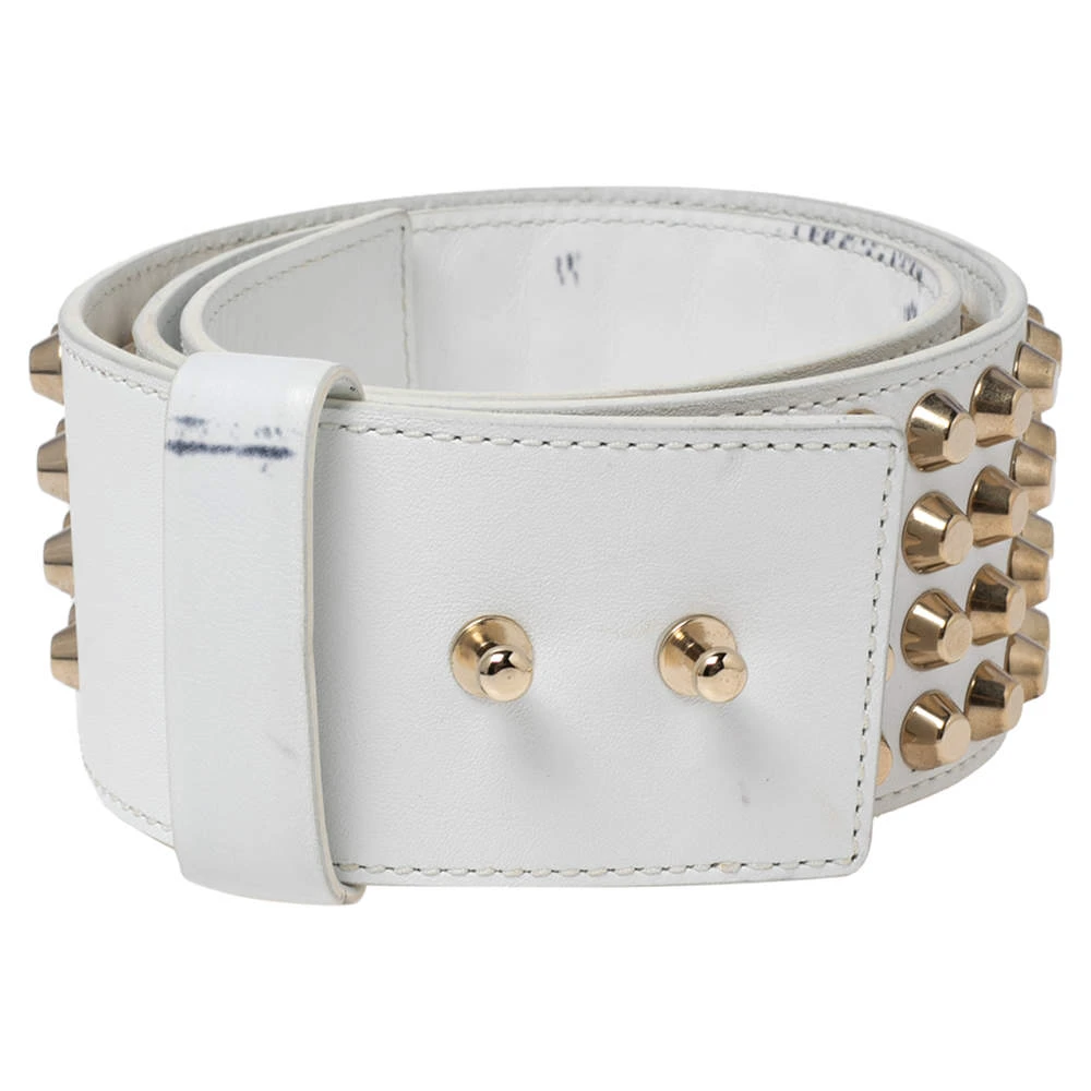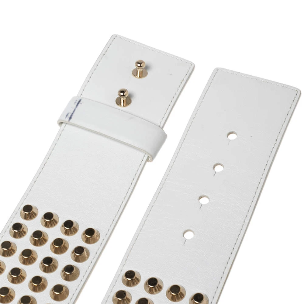 Accessorise right with this lovely waist belt from Versace. It is beautifully made from leather and detailed with gold-tone metal studs. The white belt can be worn to cinch skirts and dresses.