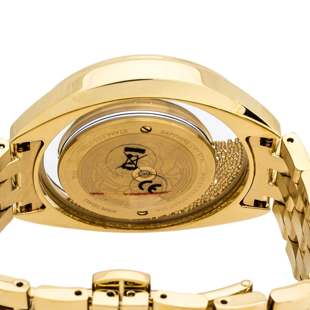 This beautiful timepiece from the house of Versace is sure to be a conversation starter with its eclectic and eye-catching design. Constructed in gold-plated stainless steel, this Destiny Spirit 86Q watch features a transparent panel on the case which is filled with gold-plated micro spheres floating as you move.
