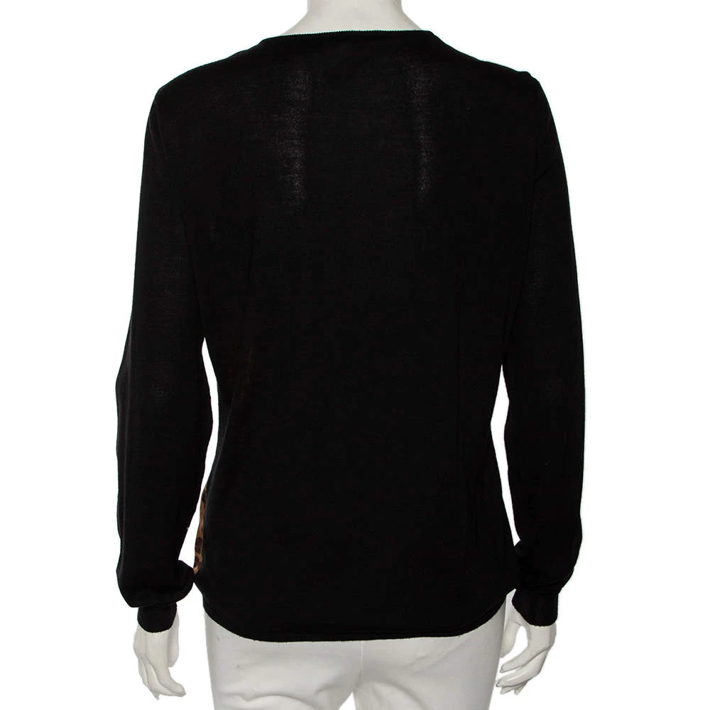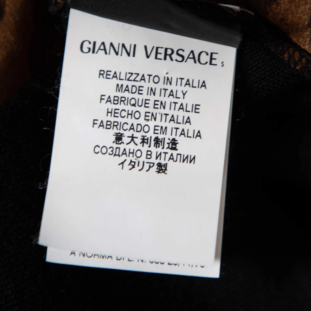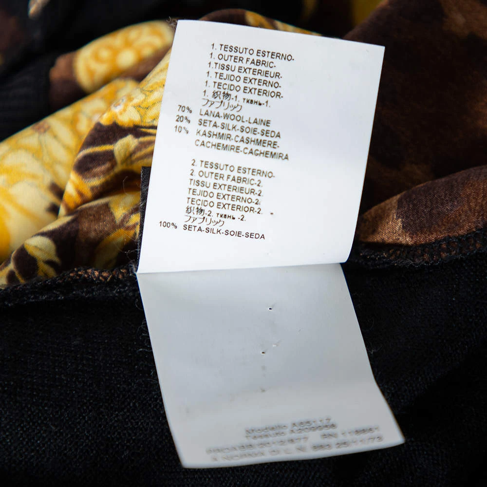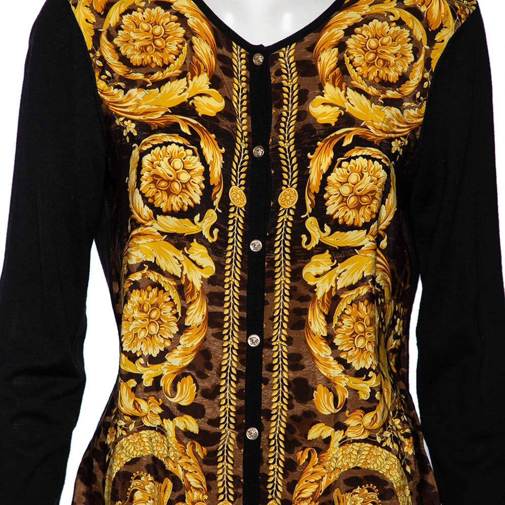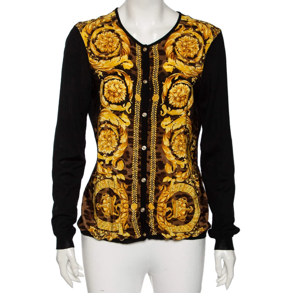 This cardigan from the House of Versace is beautifully made and will elevate your style for the winter. It is tailored using black wool knit and Baroque printed silk. It has paneled detailing, long sleeves, and a button-front feature.