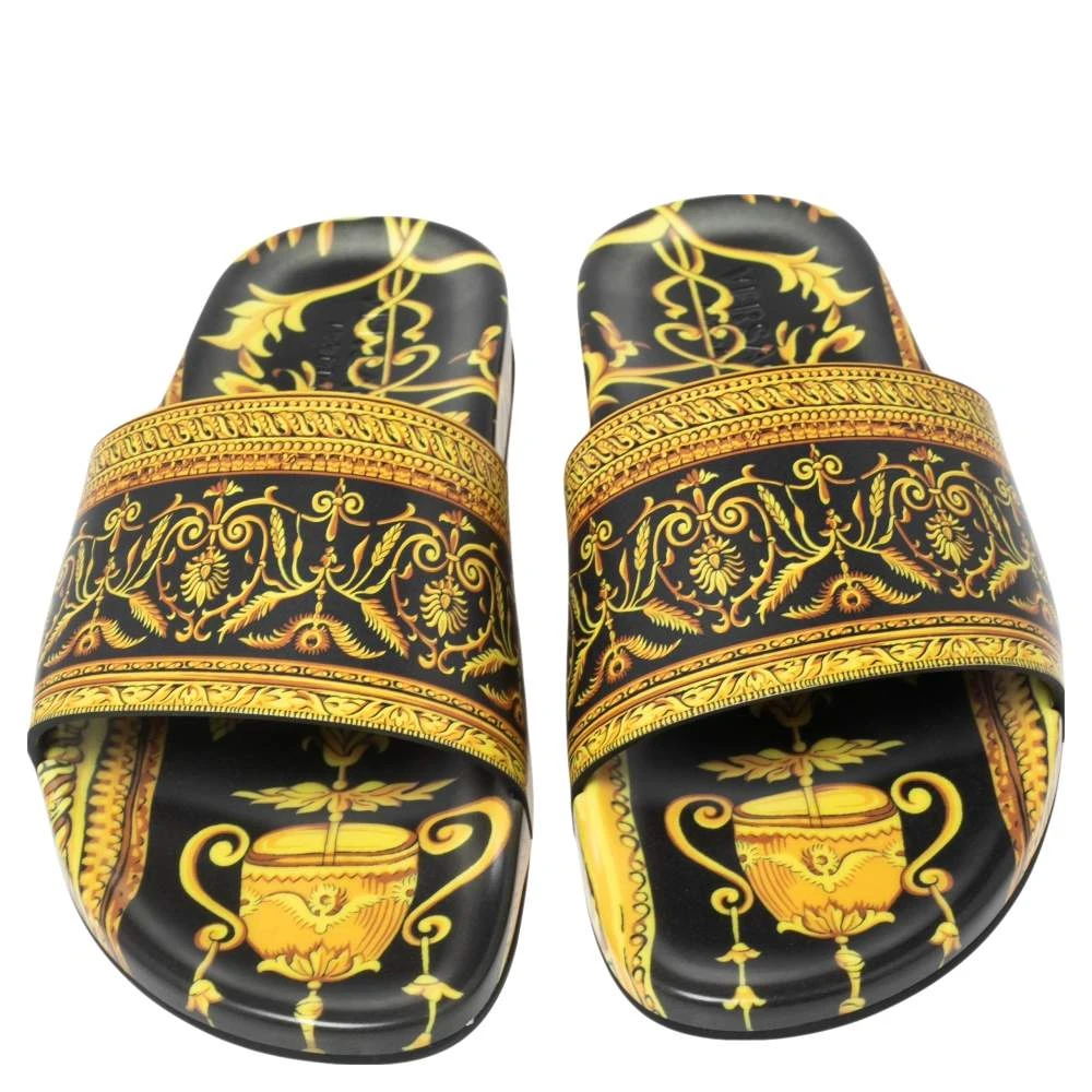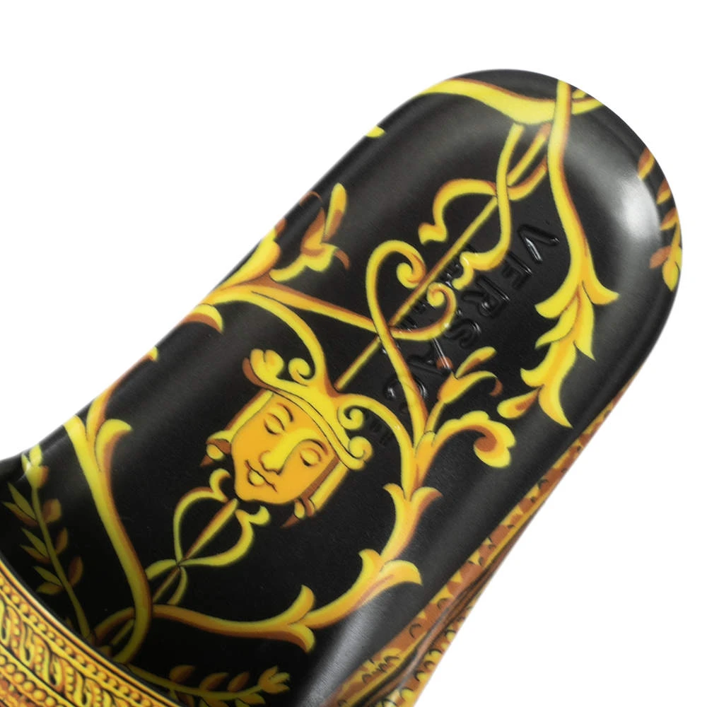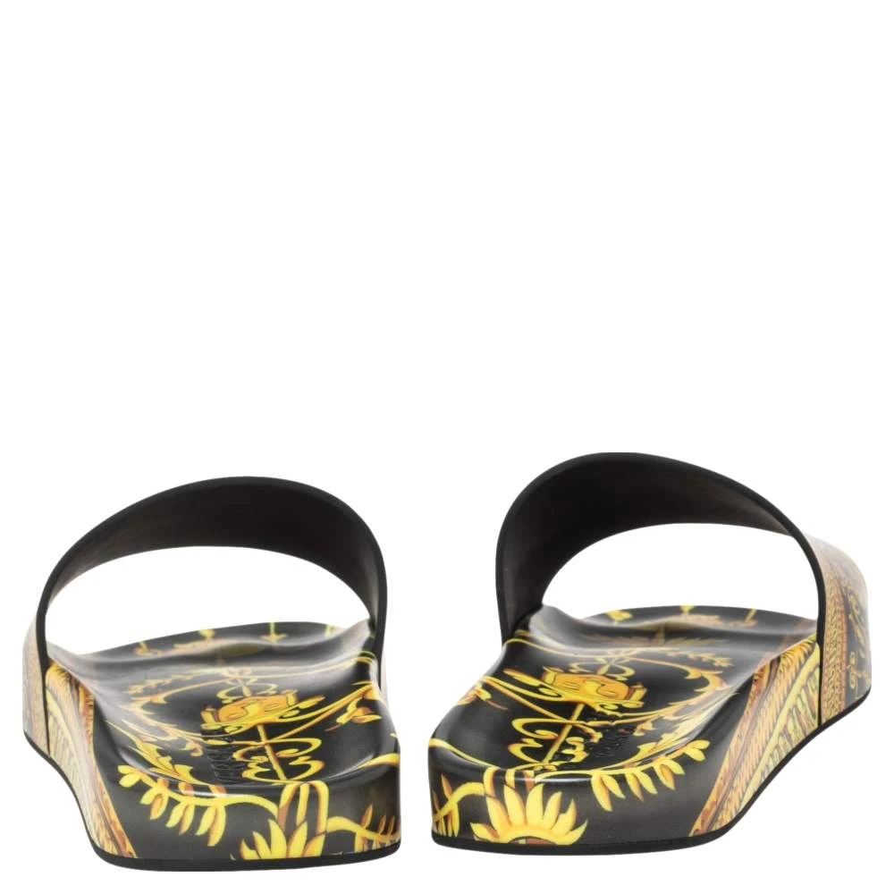 Bring Versace’s iconic charm and essence to your style as you wear these stunning flat slides. Crafted using yellow-black Baroque-printed rubber, these flats flaunt a comfortable slide style with open toes. As they are made from rubber, they ensure ample sturdiness and water resistance.