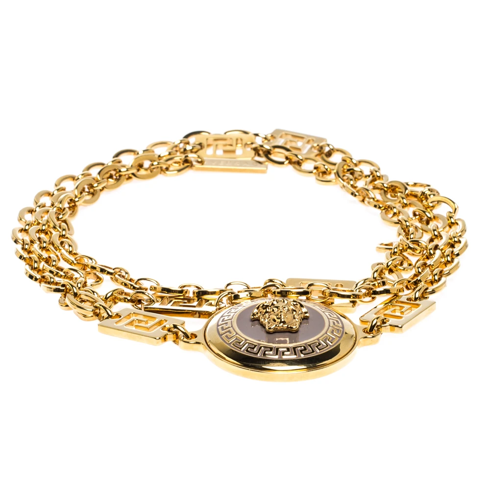 From Versace comes this gorgeous belt created from yellow gold-tone metal. The chain-link belt comes with the iconic Medusa medallion at the centre. Be it with your dresses or suits, the belts will add a luxe touch of style.